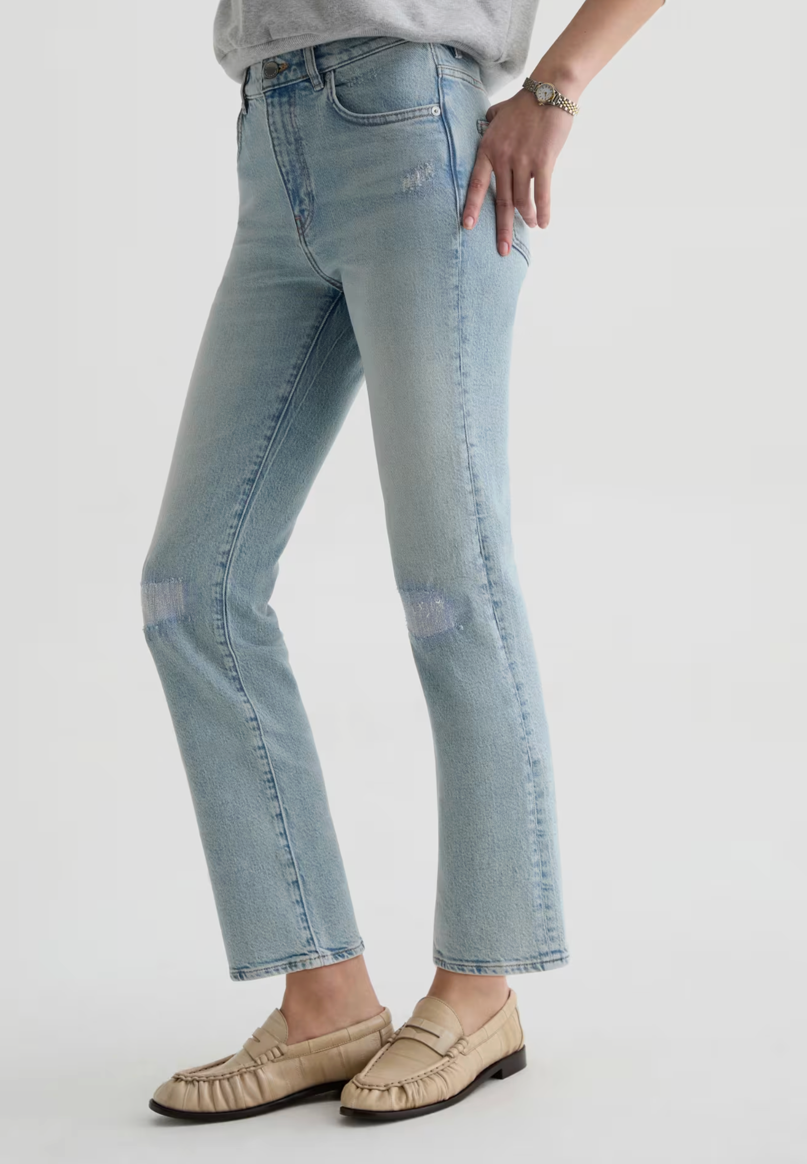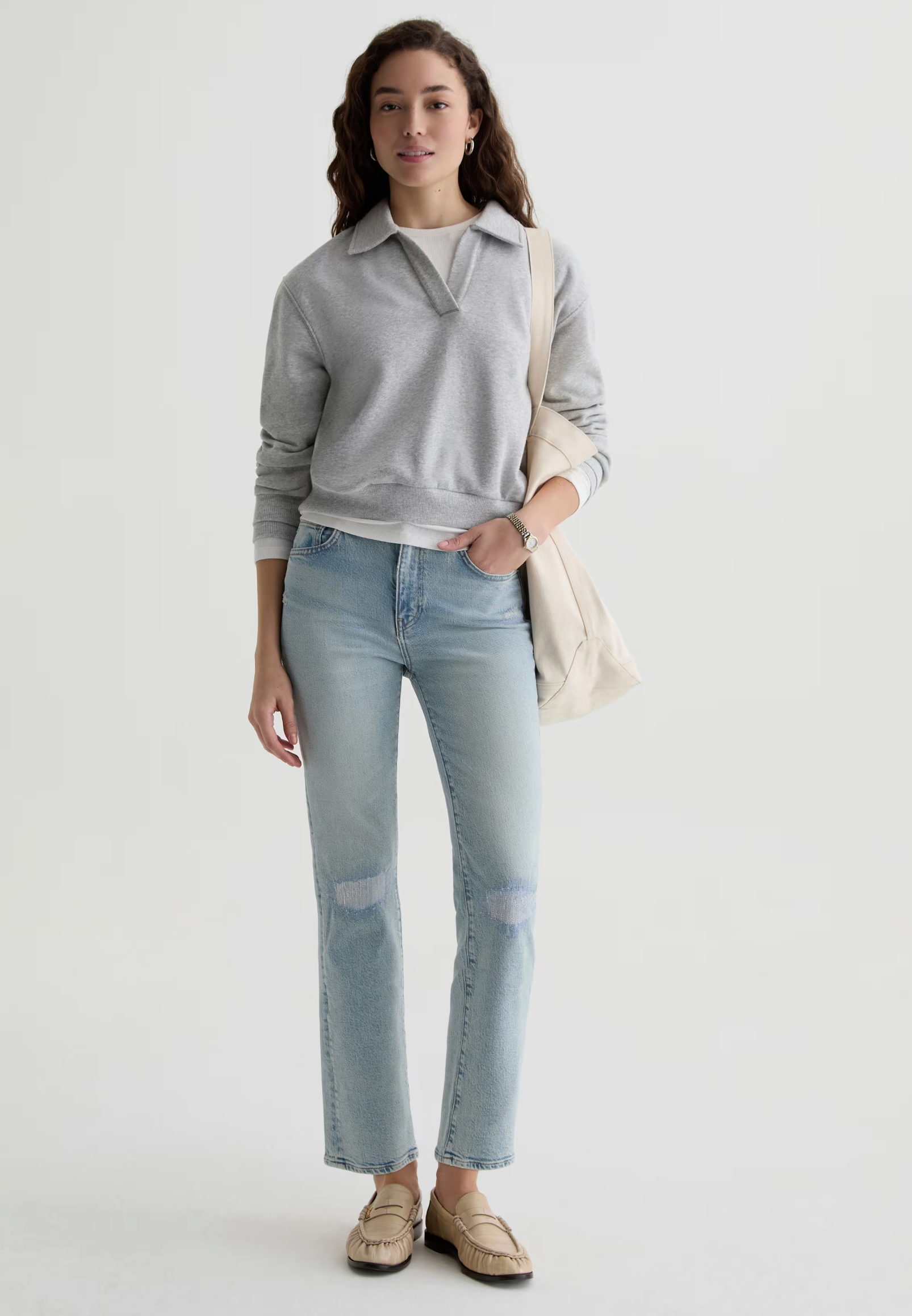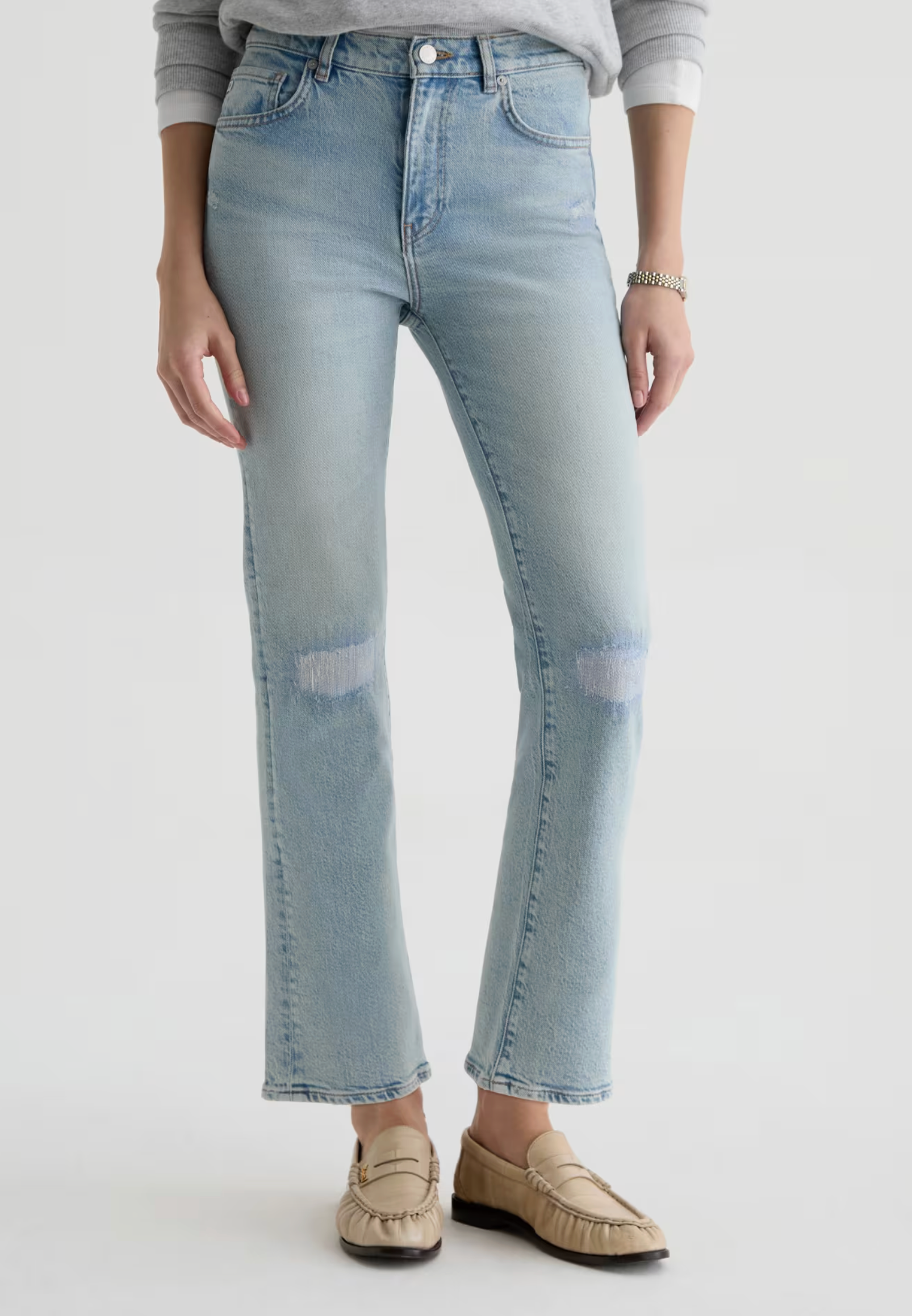 Brinley is crafted in Versatile Comfort Denim from the renowned Kaihara Mill in Japan. A versatile, polished jean with a mid-rise waist, straight leg, and flexible fit for everyday wear. Designed in our light blue wash, Riverbend, and finished with highs and lows, whiskering, fading, light abrasion, and repair details at the knee.