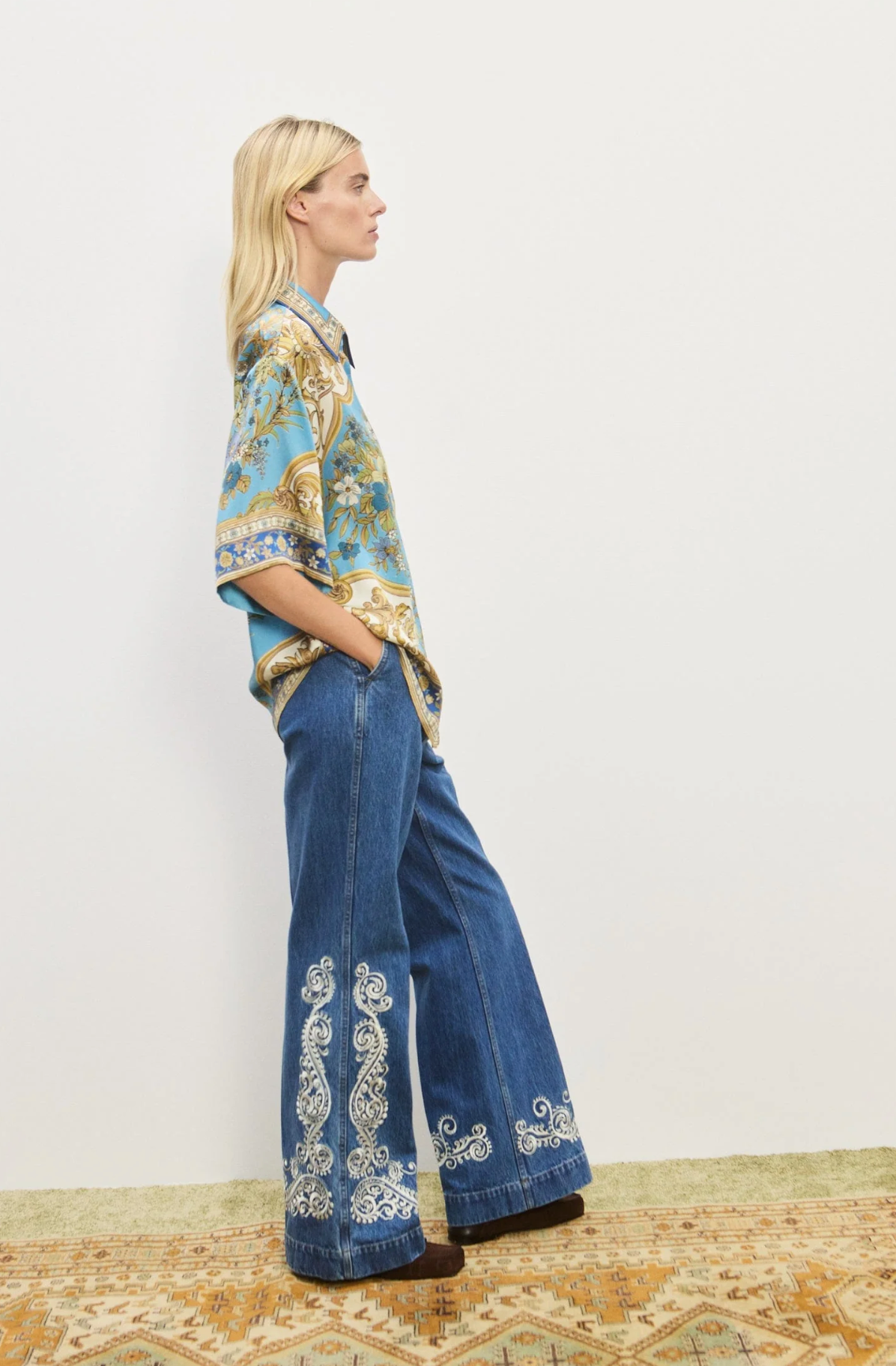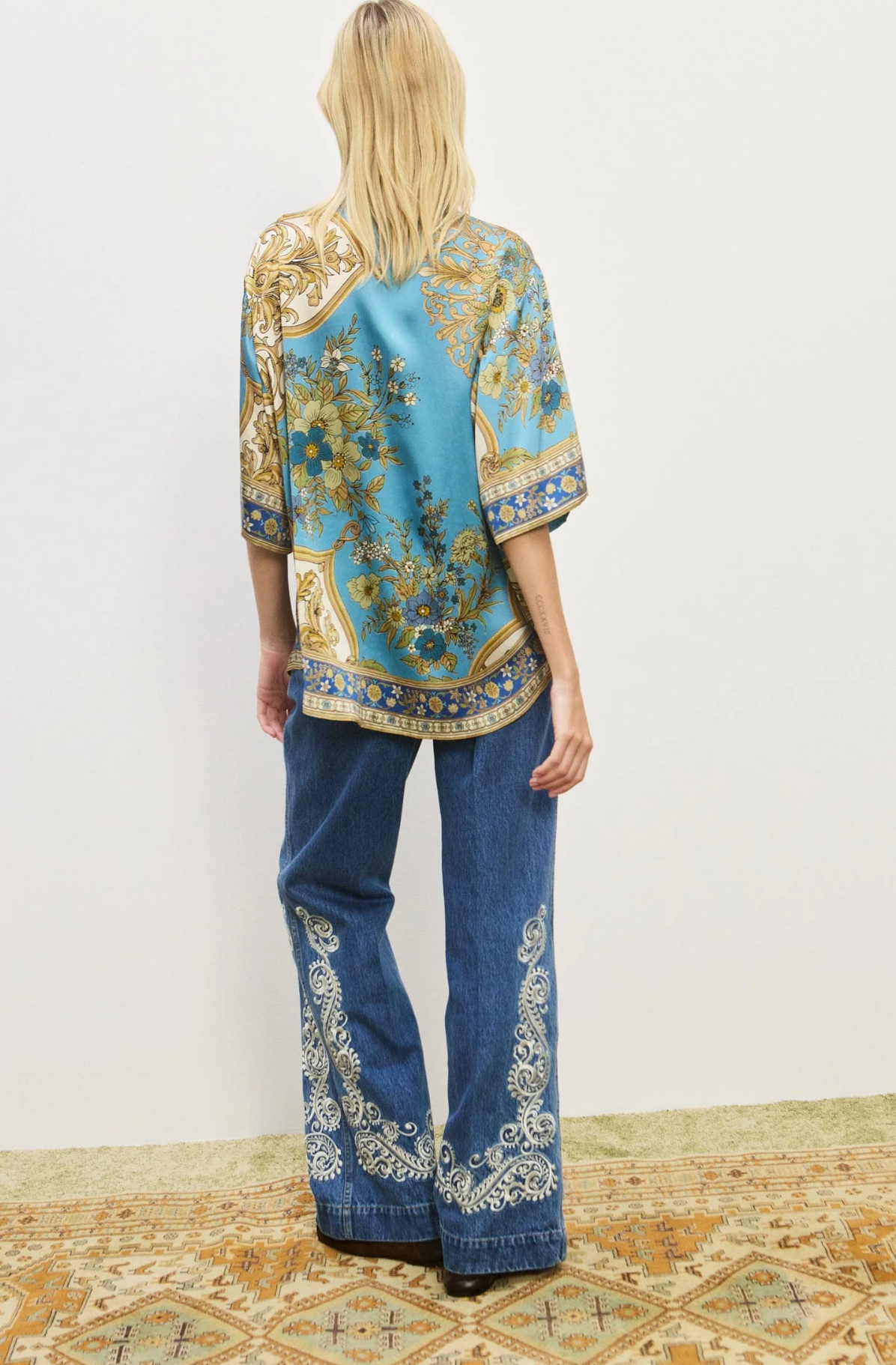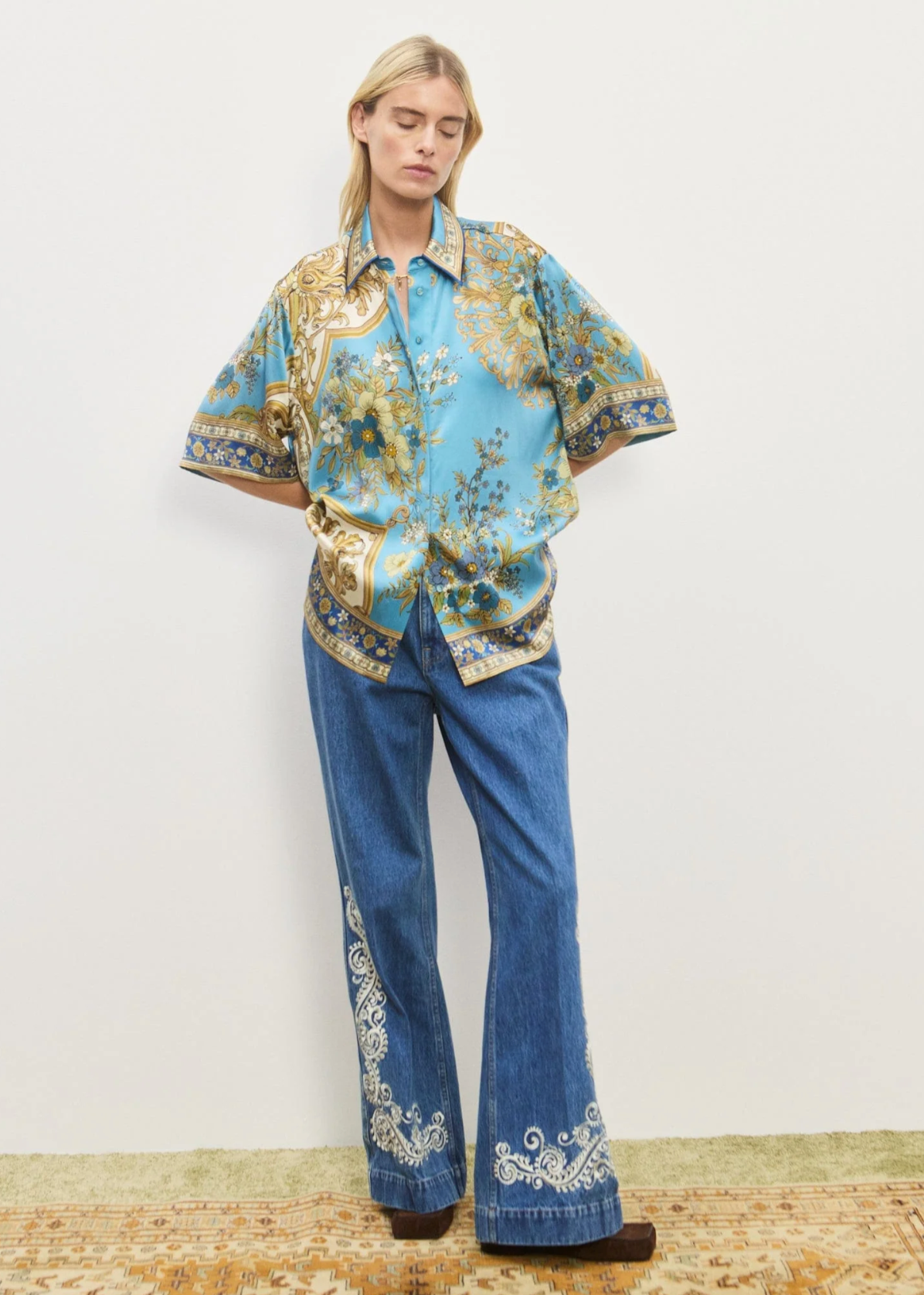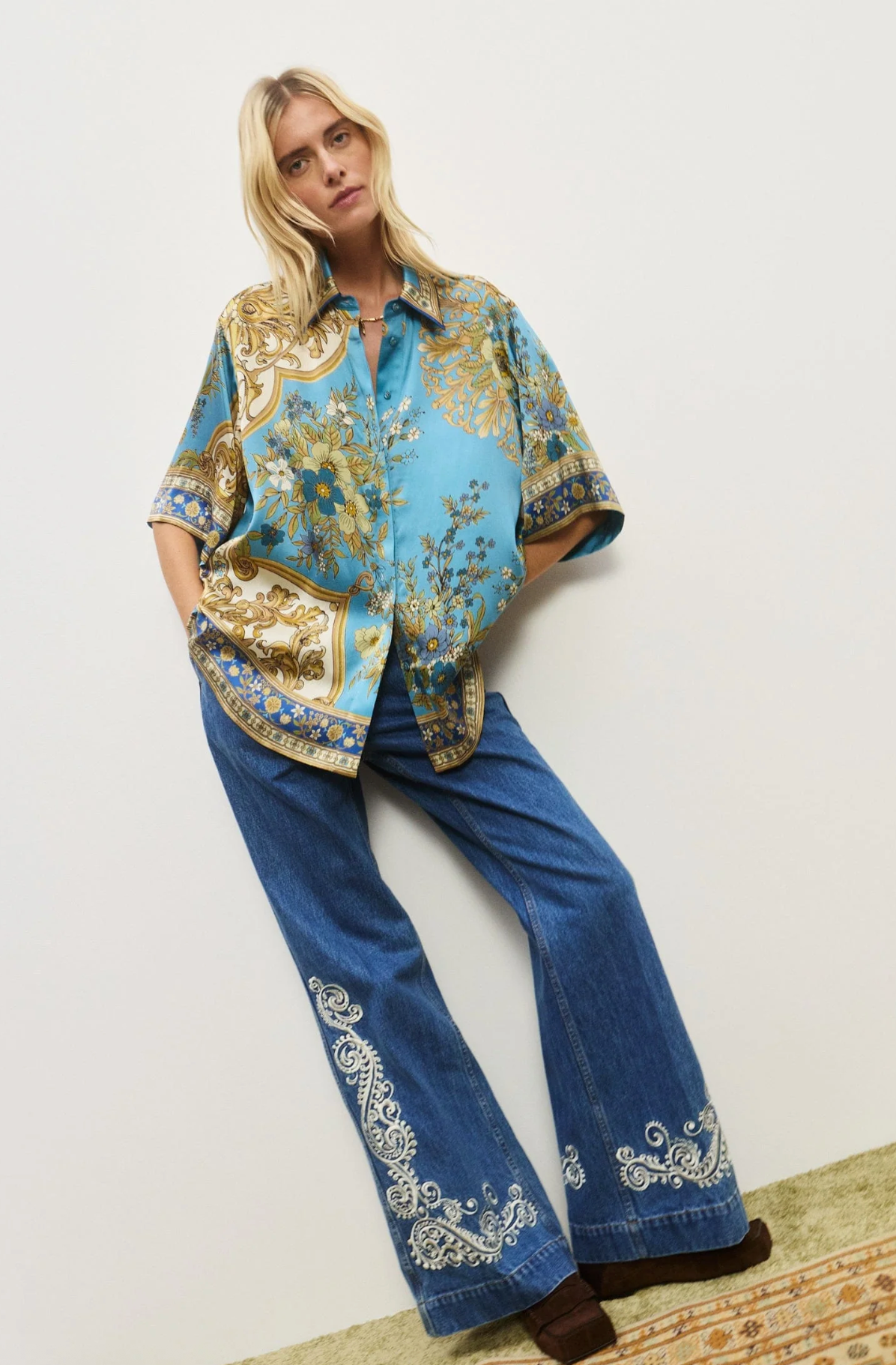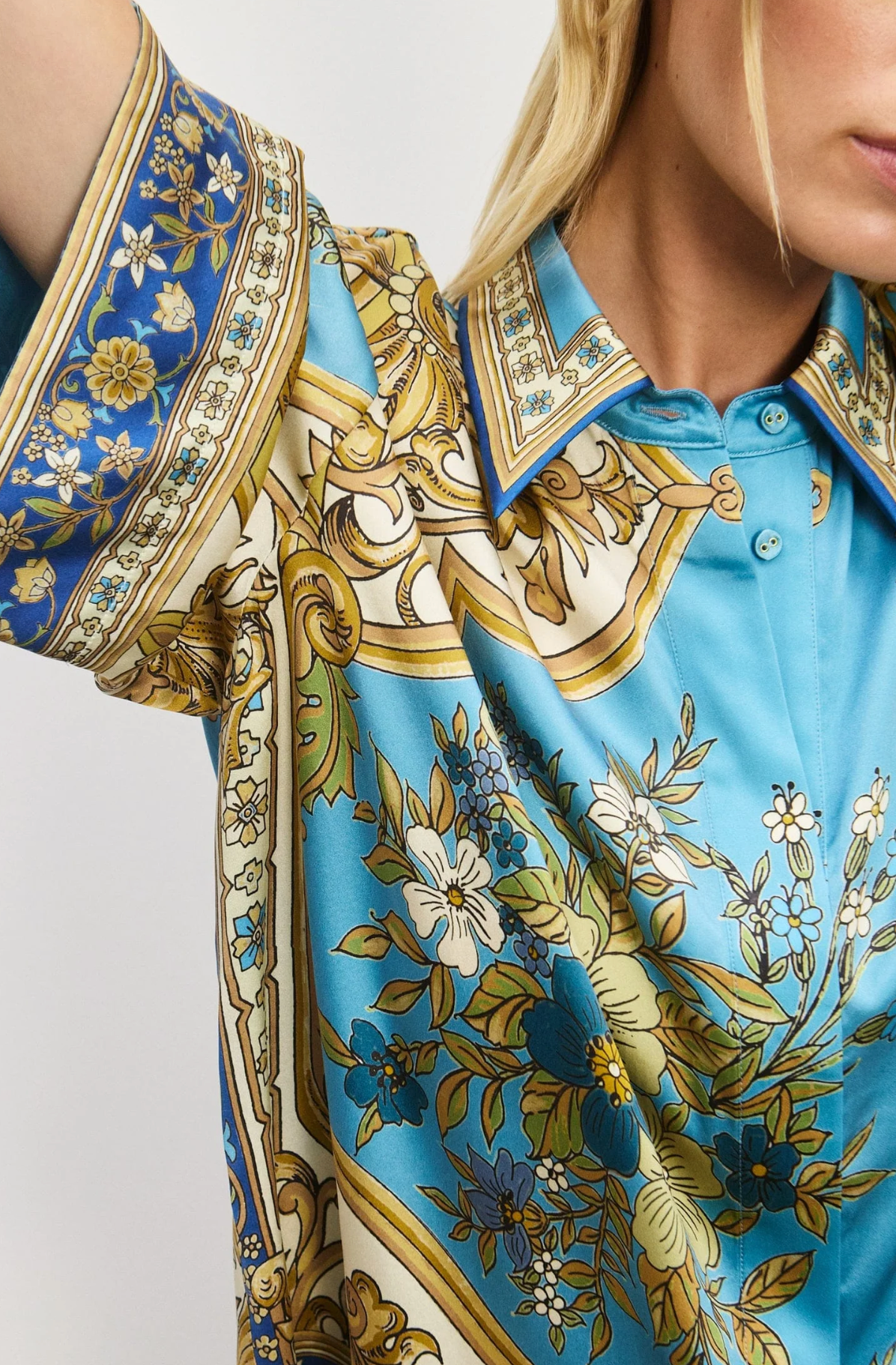 Brighten your day with the Cassie Shirt, featuring a playful pointed collar and a sleek stand placket adorned with self-covered buttons. Crafted from luxurious silk, it showcases a vintage floral motif set against a dreamy sky blue background, adding a touch of whimsical charm to any outfit. Perfect for those who love to mix elegance with a splash of fun.