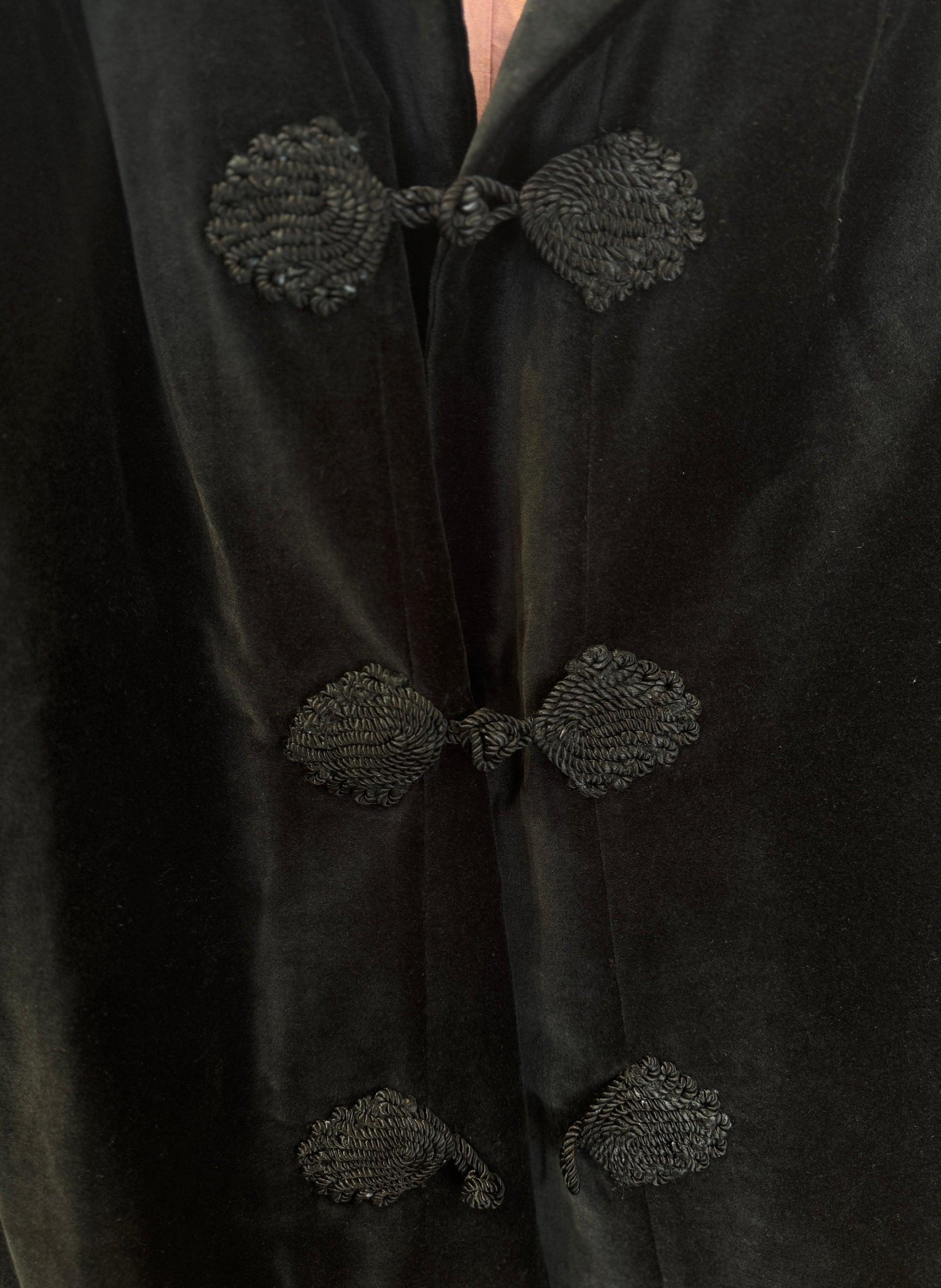 Made from velvet, our vintage-inspired cape has '70s-style collar and delicate satin fringe. The black cape is finished with orient inspired knotted buttons.