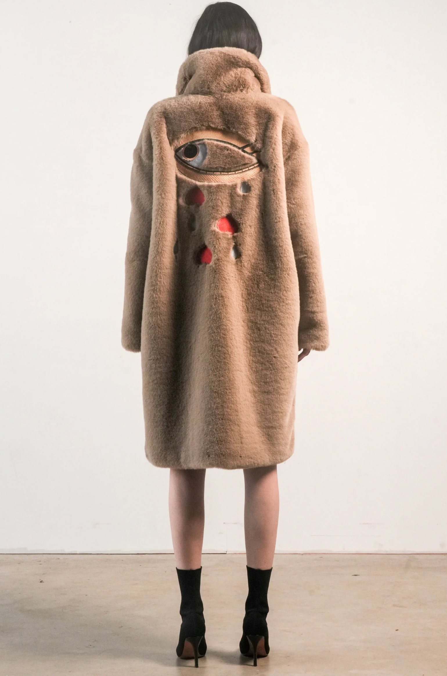 The Evil Eye jacket is more than fashion—it’s a statement of style and spiritual edge. Made from ultra-premium faux fur in a warm camel hue, this piece wraps you in softness while the intricately embroidered eye motif watches your back—literally.