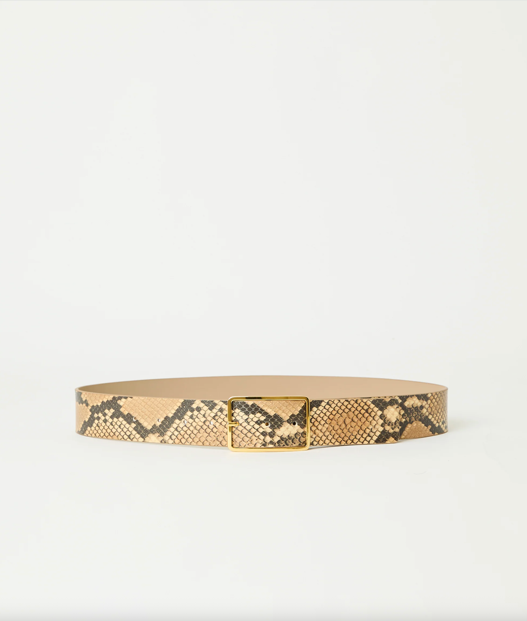 Our best-selling Milla belt in a chic python print leather. Detailed with our signature rectangular buckle in a polished gold-tone finish. Made in Italy, the Milla Python is a timeless and classic accessory.