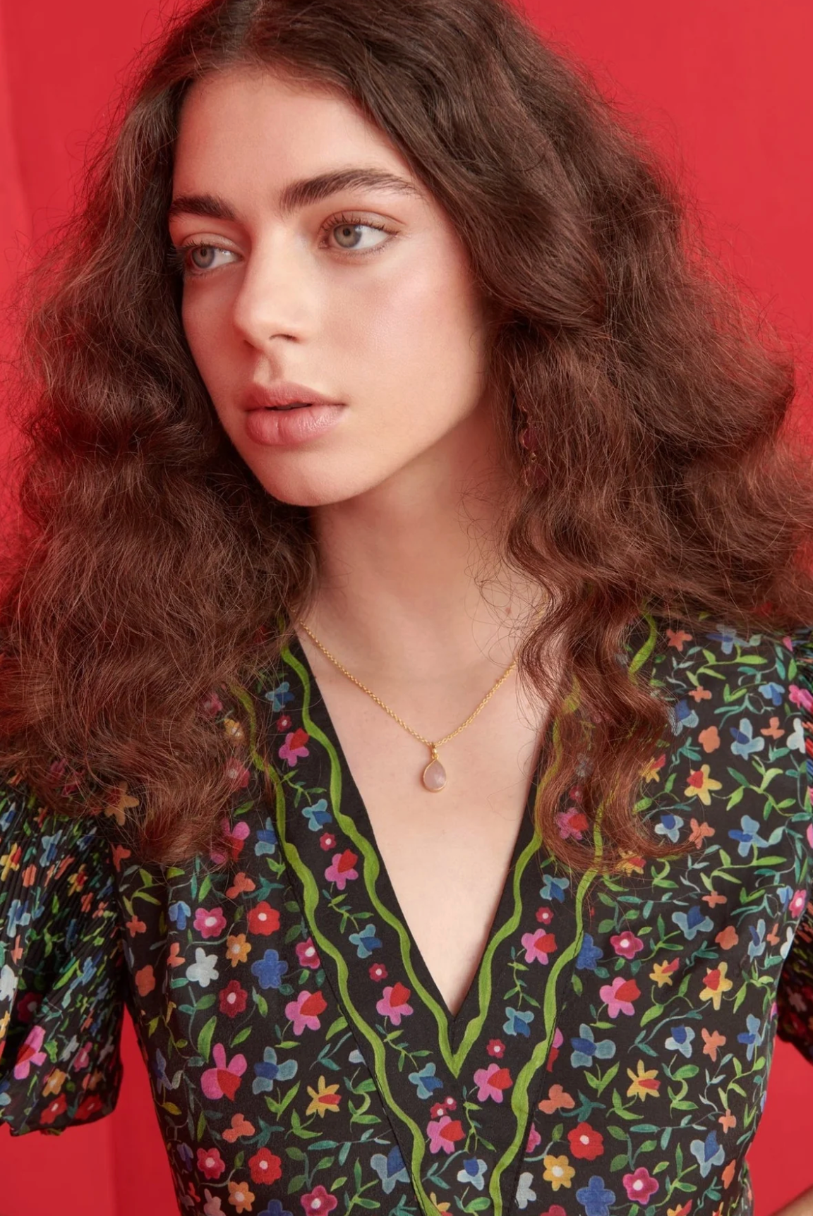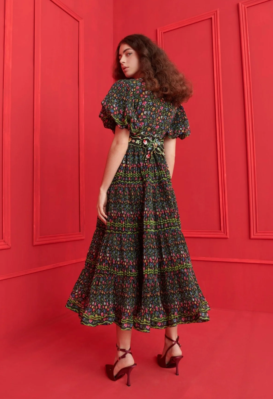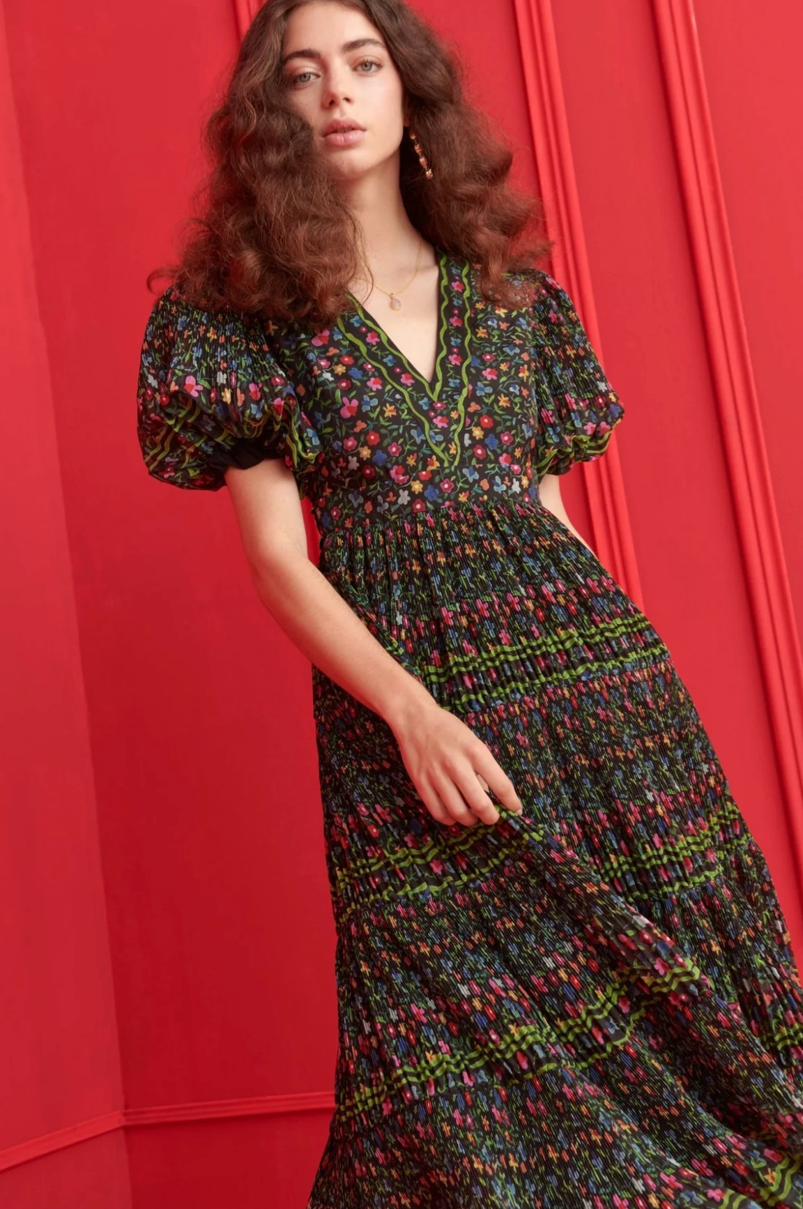 A romantic flourish of florals and flair. The Celestia Dress stands out with its dreamy puff sleeves, gathered skirt, and all-over smocked texture that flatters every shape. The deep V-neckline and vibrant floral pattern over black infuse it with folk-inspired charm, while the detailed belt adds a final touch of artisanal magic. Side pockets add effortless practicality without compromising the silhouette. Designed to move with you and turn heads wherever you go.