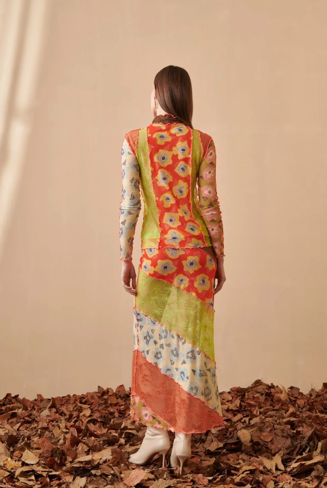 The Felicity Top is a bold fusion of color and texture, featuring sheer long sleeves, a high neckline with lettuce-edge trim, and a vibrant patchwork of floral, neon, and graphic prints. The slim silhouette makes it perfect for layering or wearing solo as a statement piece. Pair it with the matching Felicity Skirt for a head-turning coordinated set.
