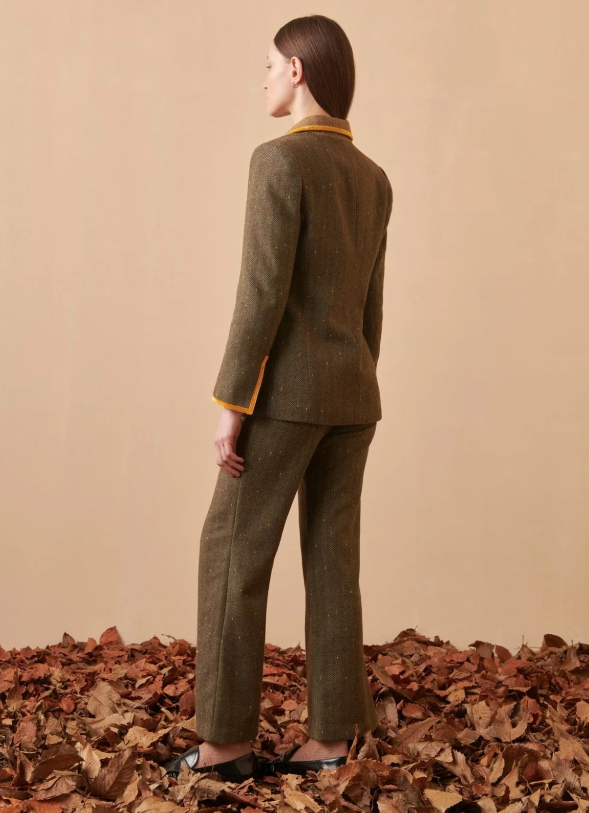 The Sarang Jacket is a sharp tailored blazer in earthy olive-brown, elevated with bold mustard-yellow trim along the peak lapels, flap pockets, and buttonholes. Cut in a double-breasted silhouette with a fitted waist and structured shoulders, it balances timeless tailoring with a fresh pop of color. Wear with the matching Sarang Trousers for a cohesive look or layer over dresses and separates for versatile winter styling.
