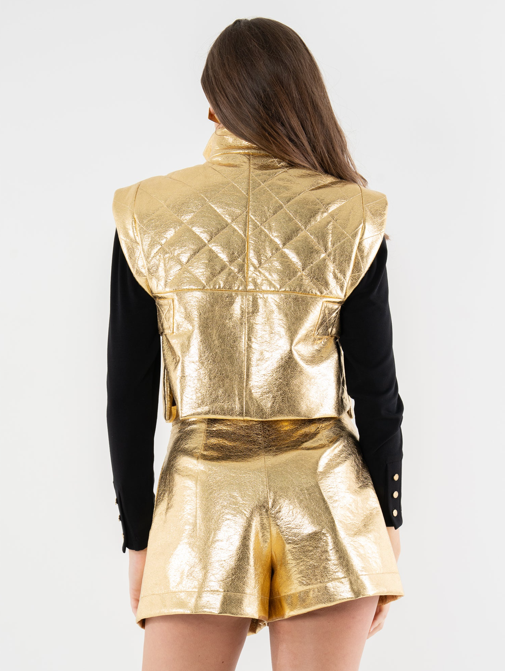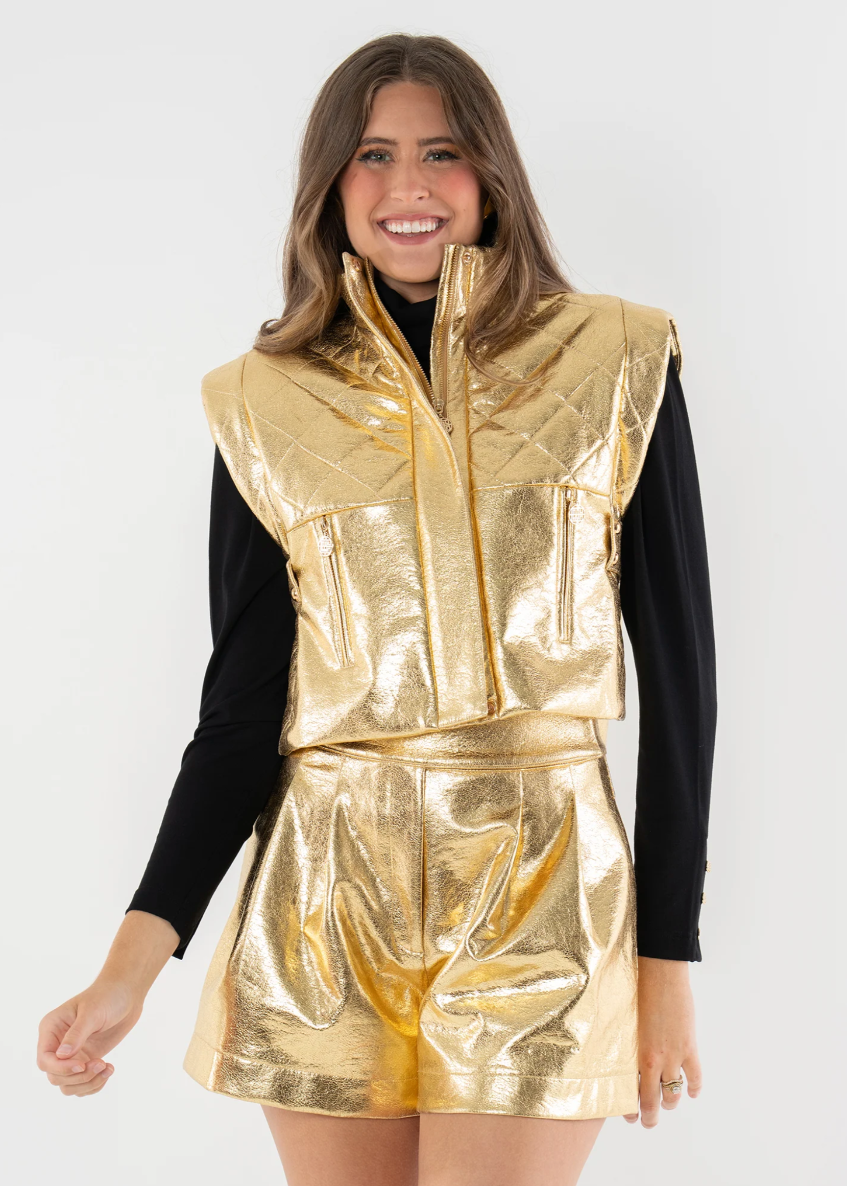 The Annie Vest in Gold Vegan Leather is a striking layering piece designed to stand out. Featuring a structured stand collar, hidden front zip closure, and a quilted bodice for added dimension, this vest balances bold design with modern functionality. Front zip faux pockets add utility while maintaining sleek lines, and adjustable side tabs offer a customizable fit. Crafted in luminous metallic vegan leather, the silhouette is slightly relaxed, making it easy to style over lightweight knits or tailored tops.