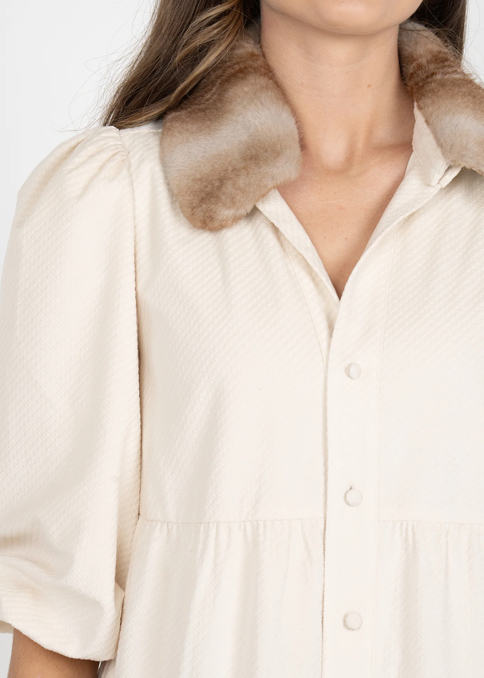 The Sadie Dress in Winter White features a detachable fur collar, covered button closures, blouson sleeves, and a tiered, loose-fitting silhouette. Crafted in a lightweight textured velvet, this dress balances warmth with ease, offering comfort and versatility for the season.