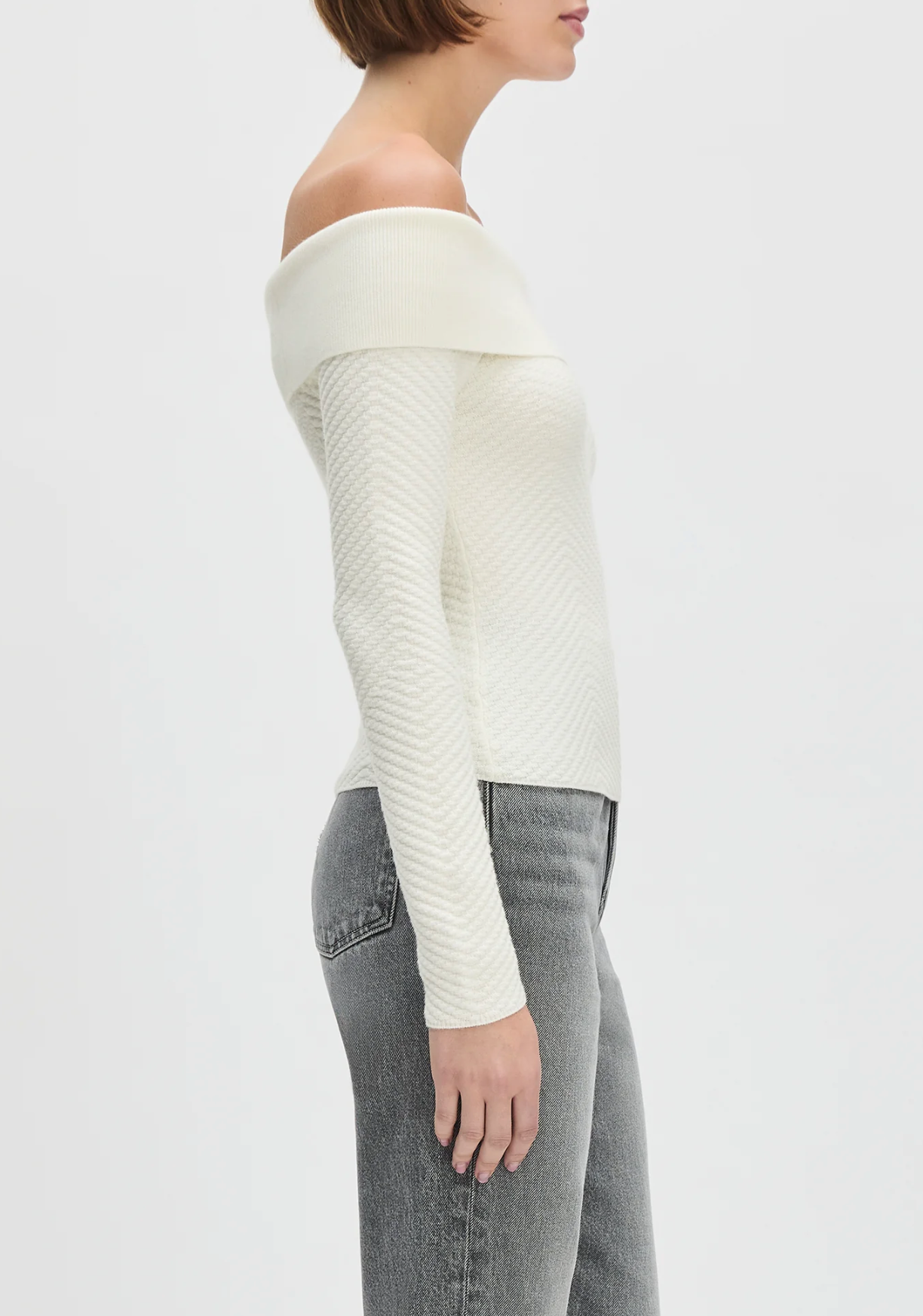 In your good graces. This off-the-shoulder knit sweater is stitched with a chevron pattern, fitted through the body, and slightly relaxed for that just-thrown-on look (that still looks intentional).
