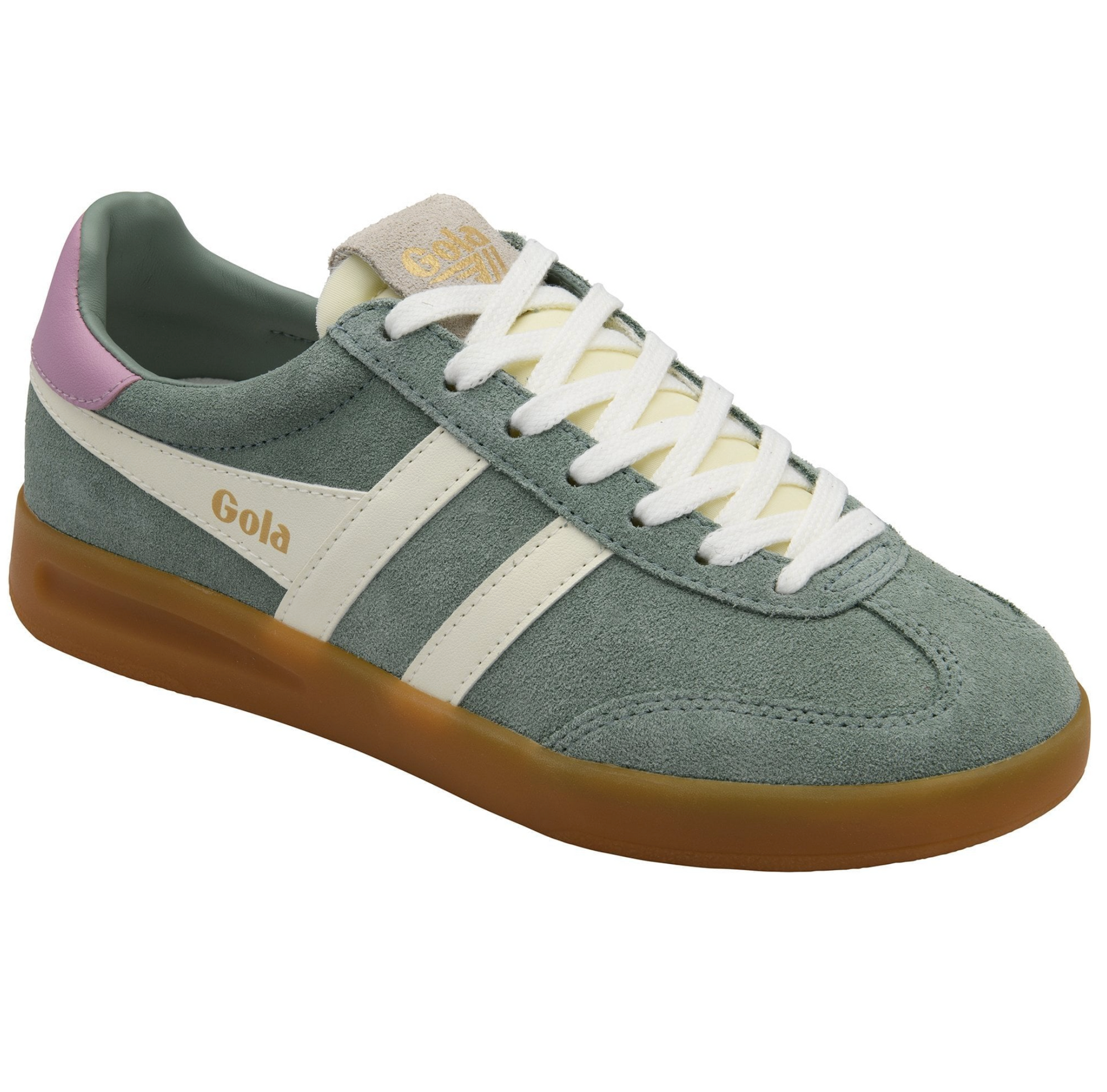With Gola’s distinctive handwriting, Cyclone for women gets a seasonal refresh with an all-new suede colour palette. Green mist and off white combine in this women’s sneaker with a hint of candy to give a trend relevant combination, perfectly finished with a translucent gum sole.