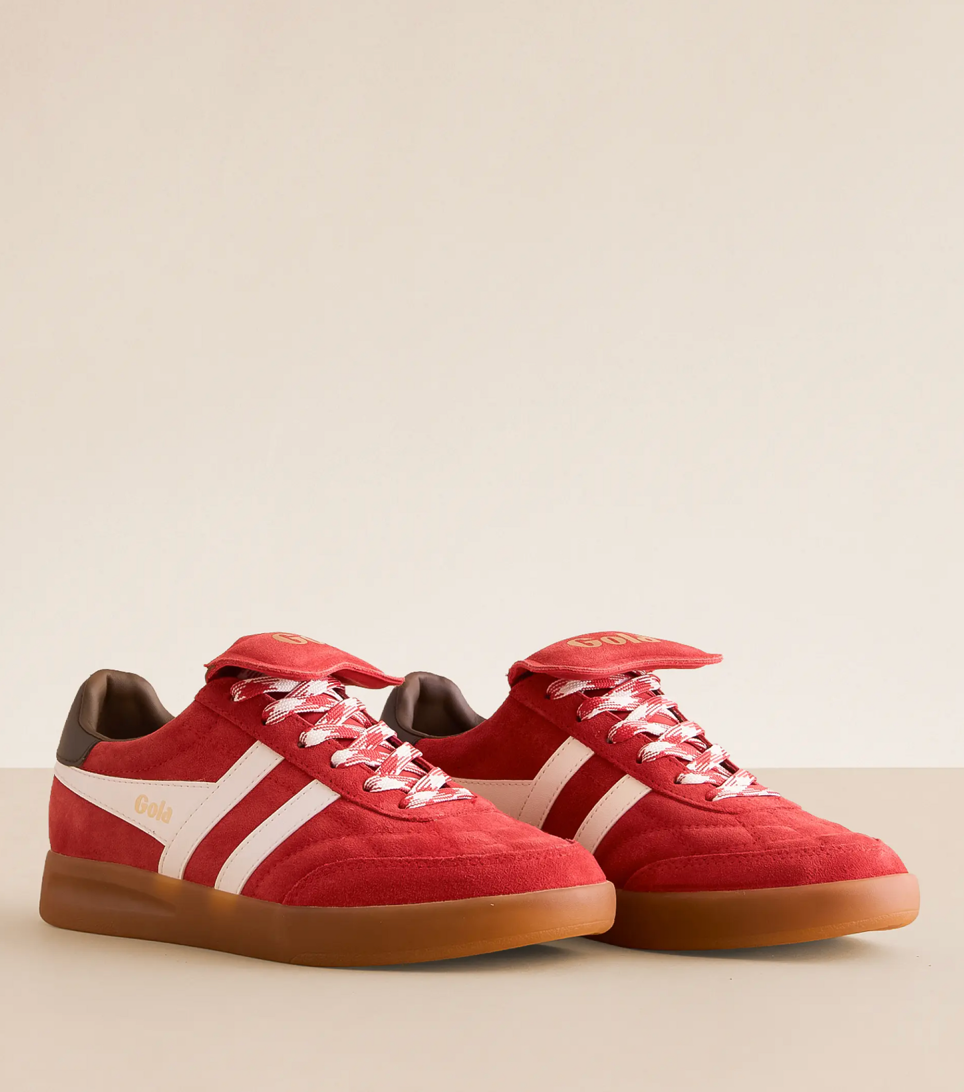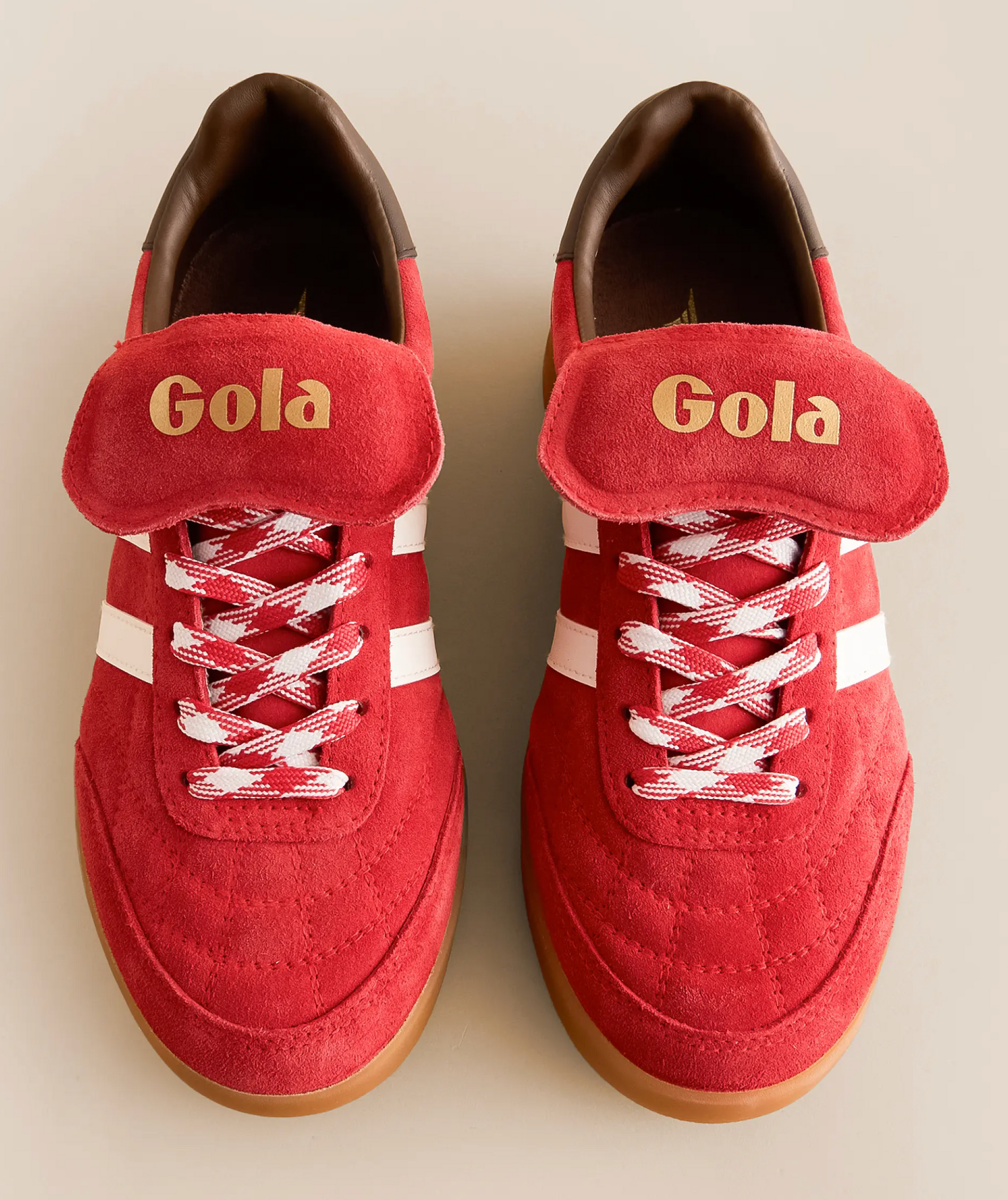 The women’s Stadia ‘86 references Gola’s heritage with a vintage football silhouette and a gum cup sole, red suede upper and check laces. A signature off white wingflash trim and dark brown tab are complimented with a fold over tongue in this new AW women’s sneaker from Gola.