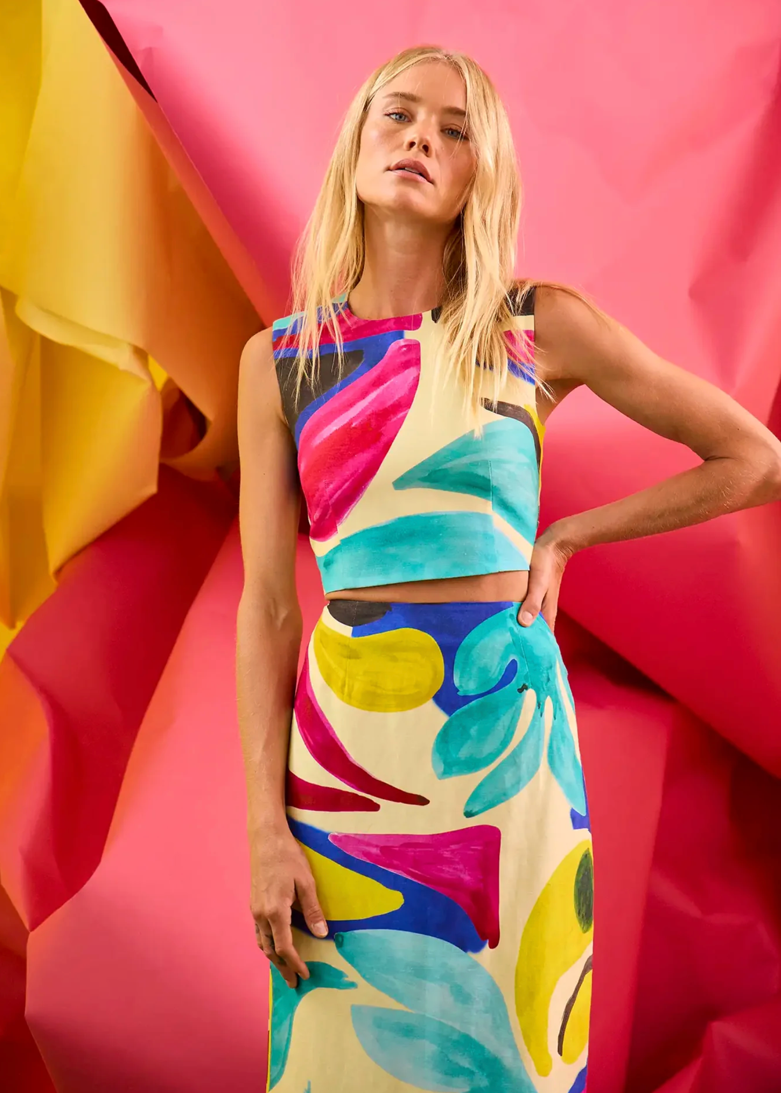 Introducing the Royce Top, a cropped sleeveless silhouette in our Stroke of Spring linen blend. Finished with a clean crew neckline and back zipper, it’s a fresh, modern staple designed to pair with high-waisted separates.
