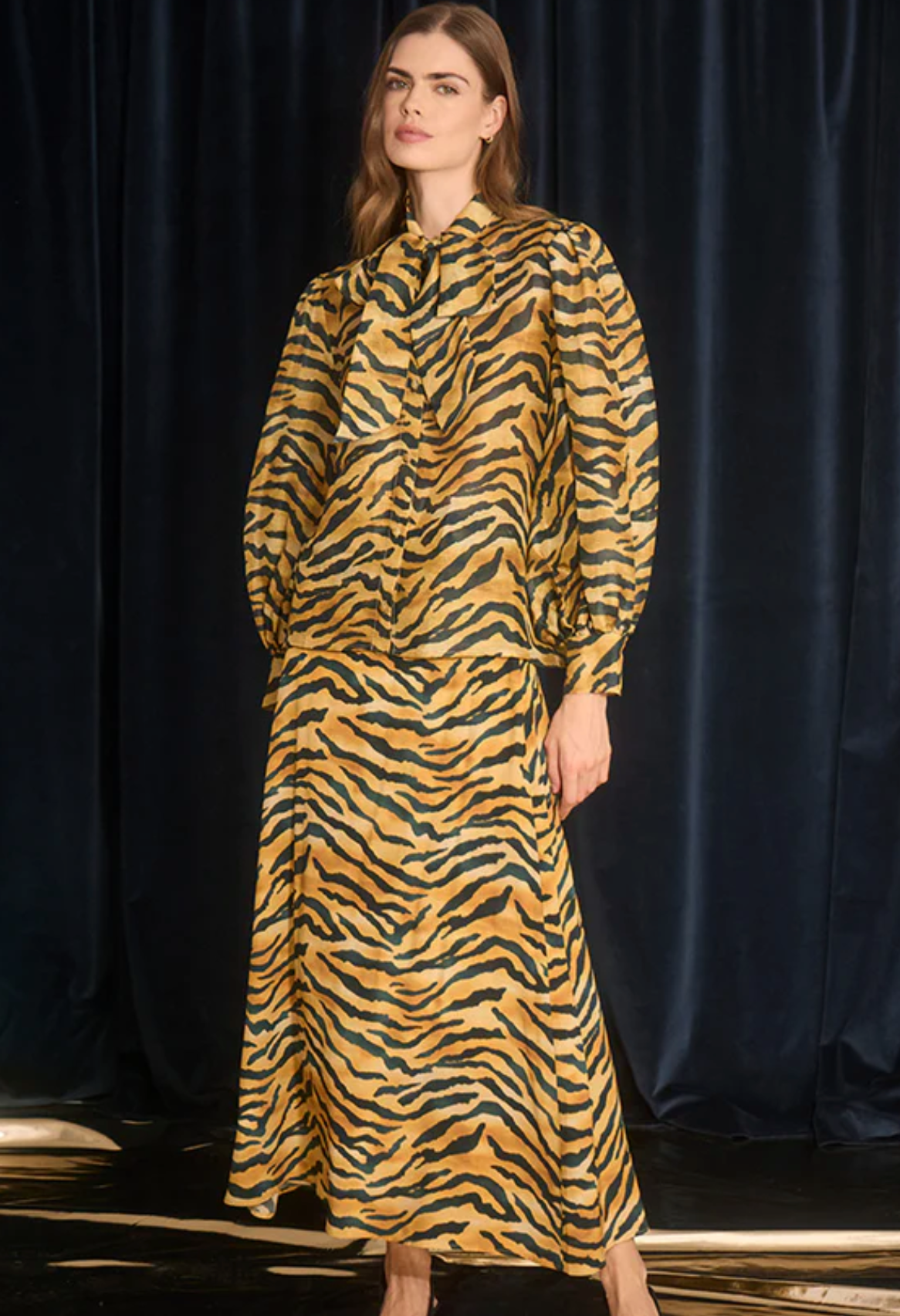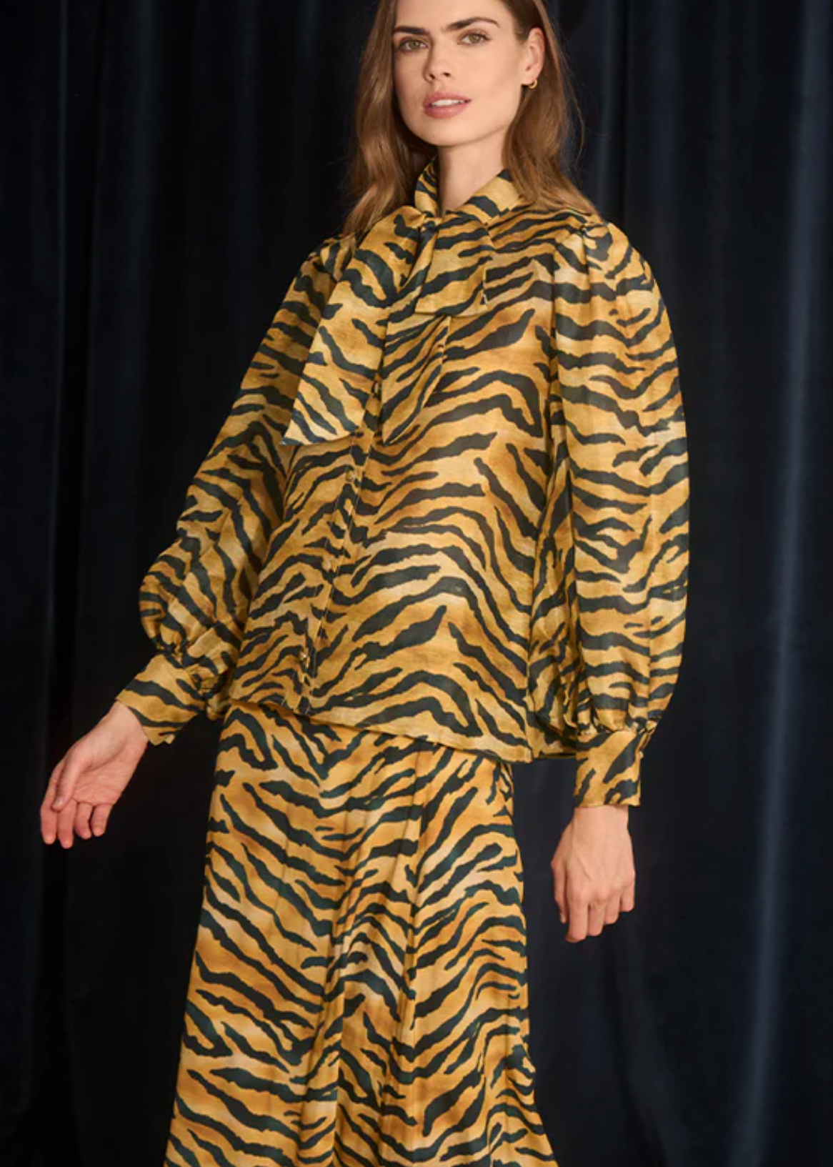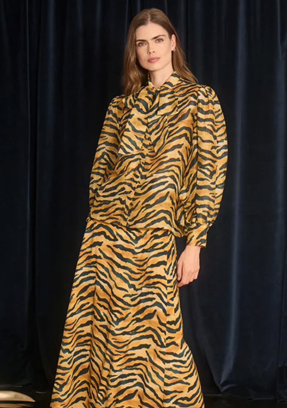 The Tess Blouse features a striking tiger stripe pattern, pairing bold style with refined design. Made with a button-front closure and long sleeves finished with button cuffs, it ensures a tailored and polished fit. Its signature tie neckline with an exaggerated bow adds a sophisticated, fashion-forward edge, perfect for making a confident statement in both professional and stylish casual settings.
