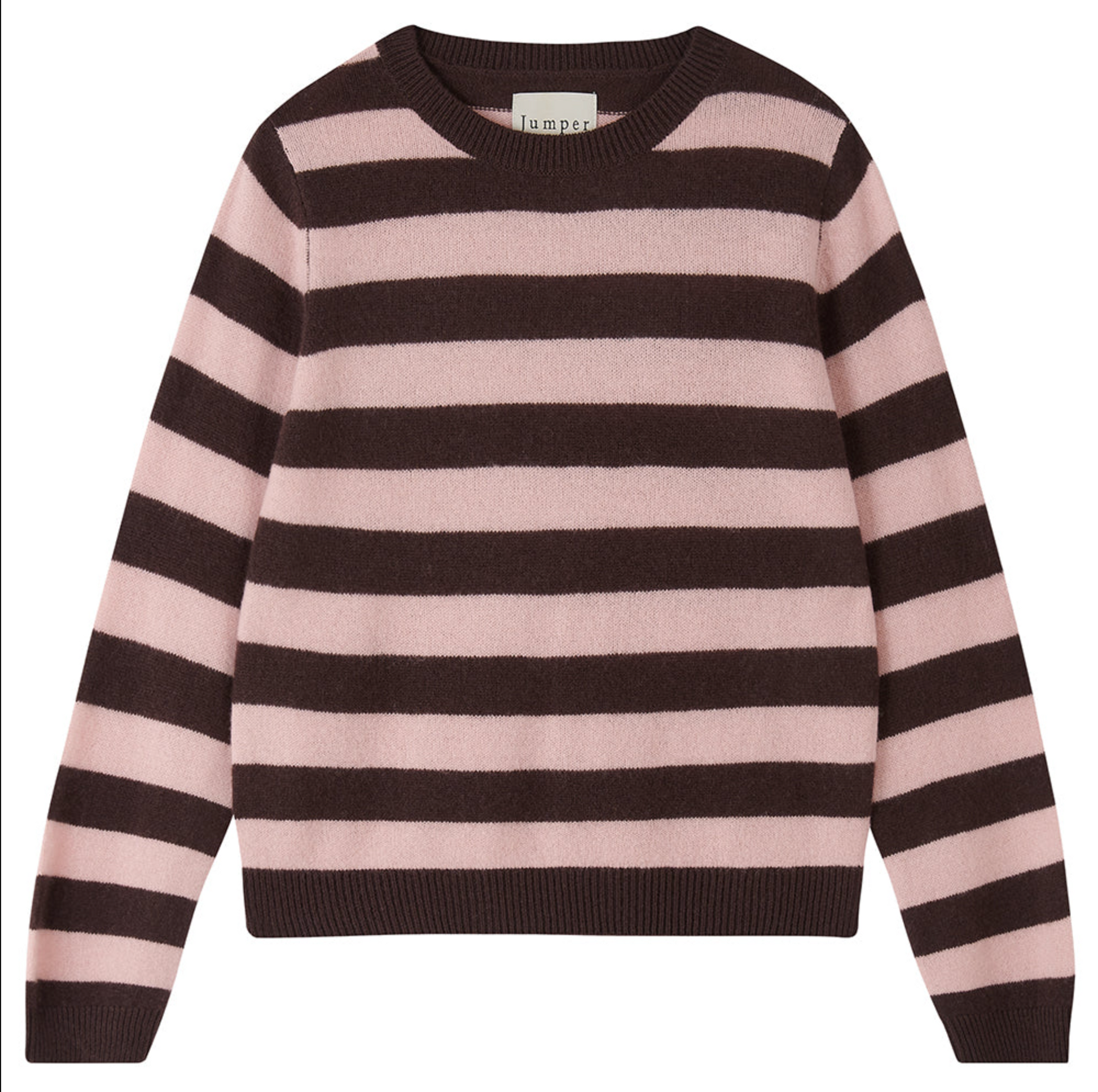 Jumper 1234 cashmere jumper. Our best selling lightweight cashmere stripe crew neck in dark brown and pale pink. Part of our core collection, those jumpers and cardigans in plain and stripe that you always need, but can't always find!