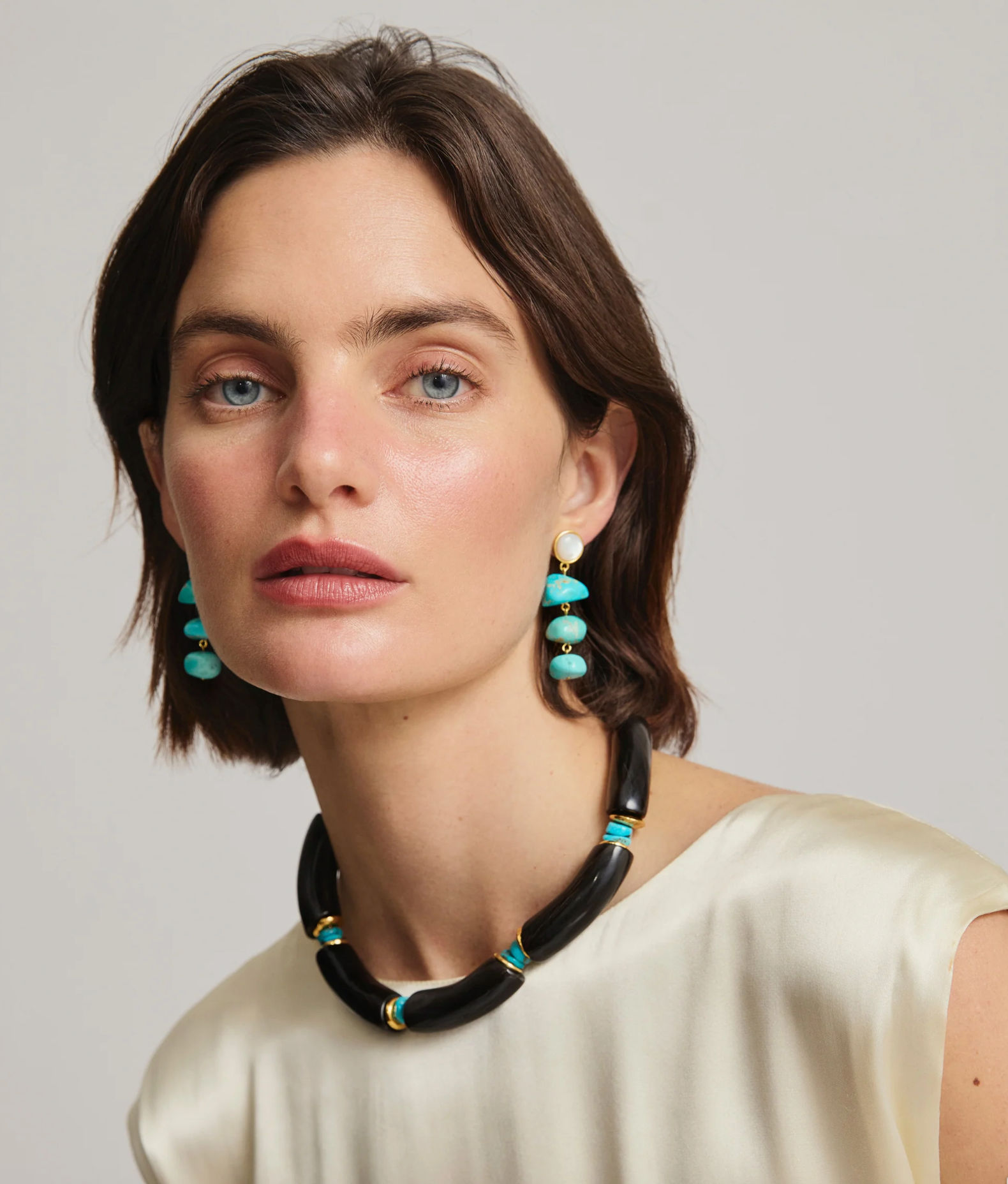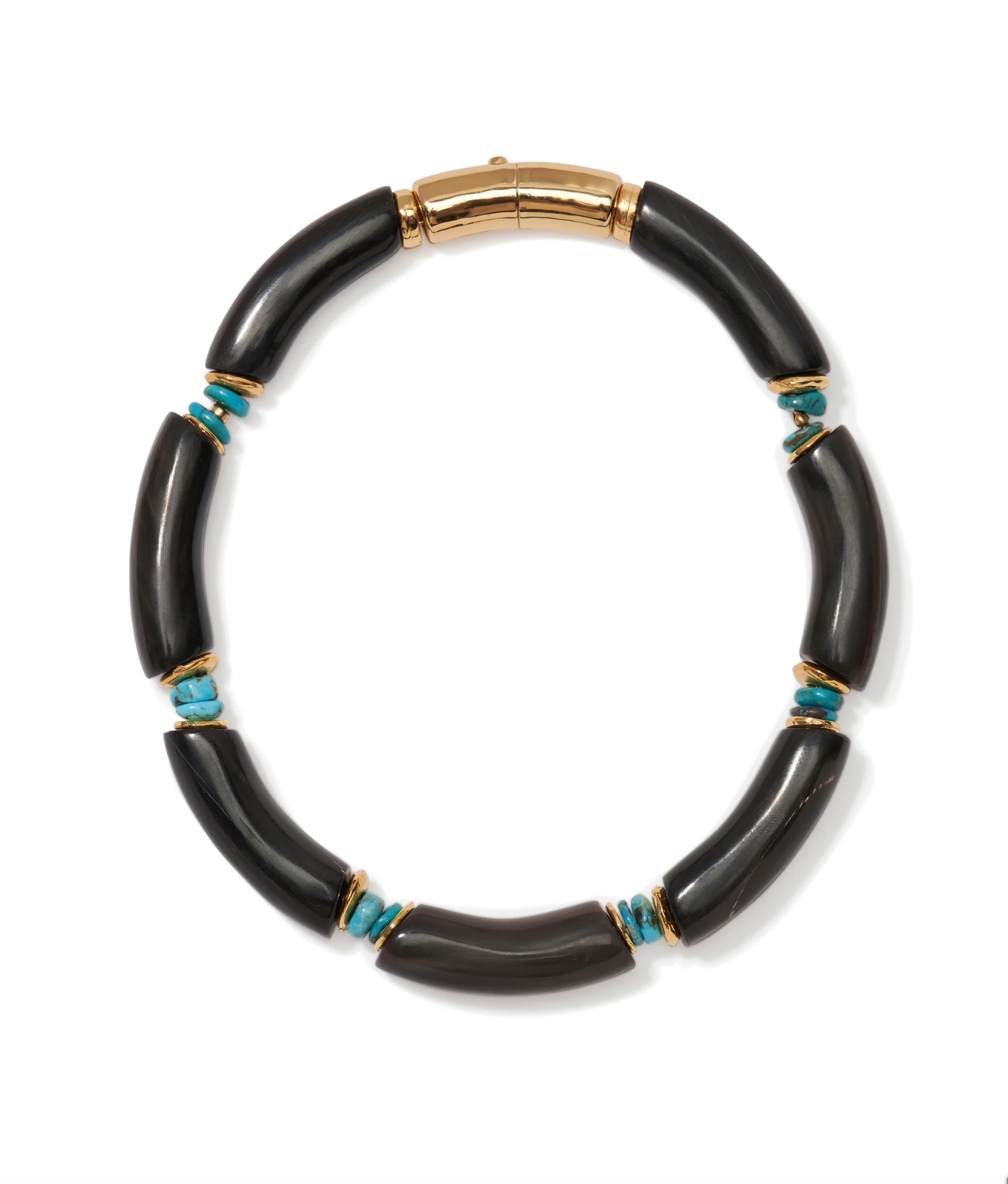 Style? It's practically our religion, and we plan to wear this sleek, worship-worthy necklace everywhere. With black tubular horn beads, dotted turquoise accents, and gold-plated brass macaroni closure.