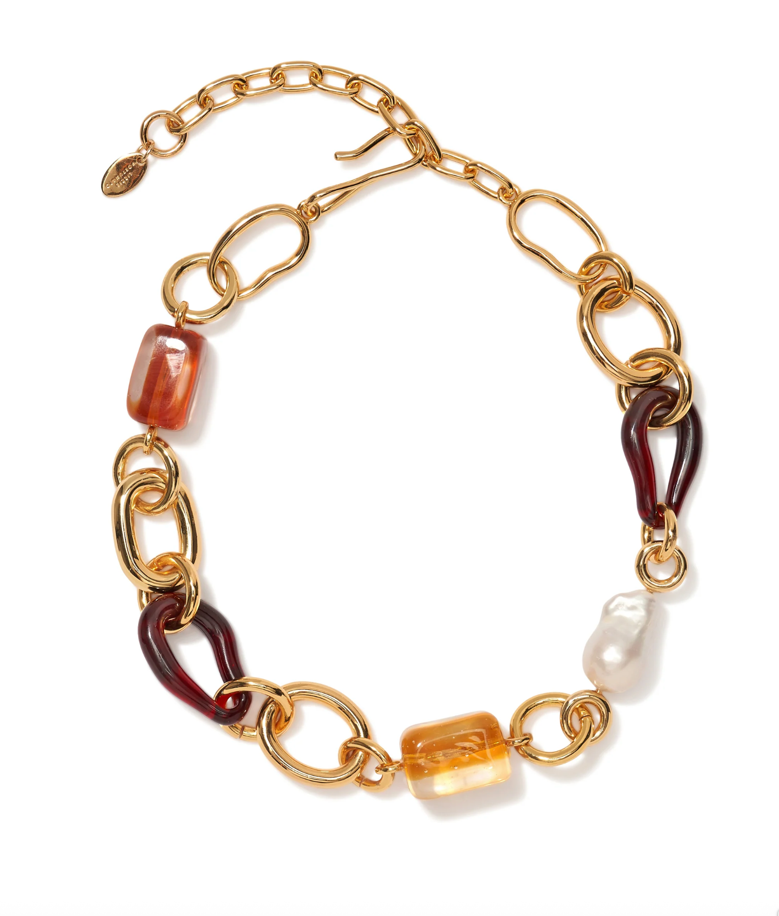 This mixed-media necklace will really put you on the map. In gold-plated brass flame-worked glass beads and baroque freshwater pearl.