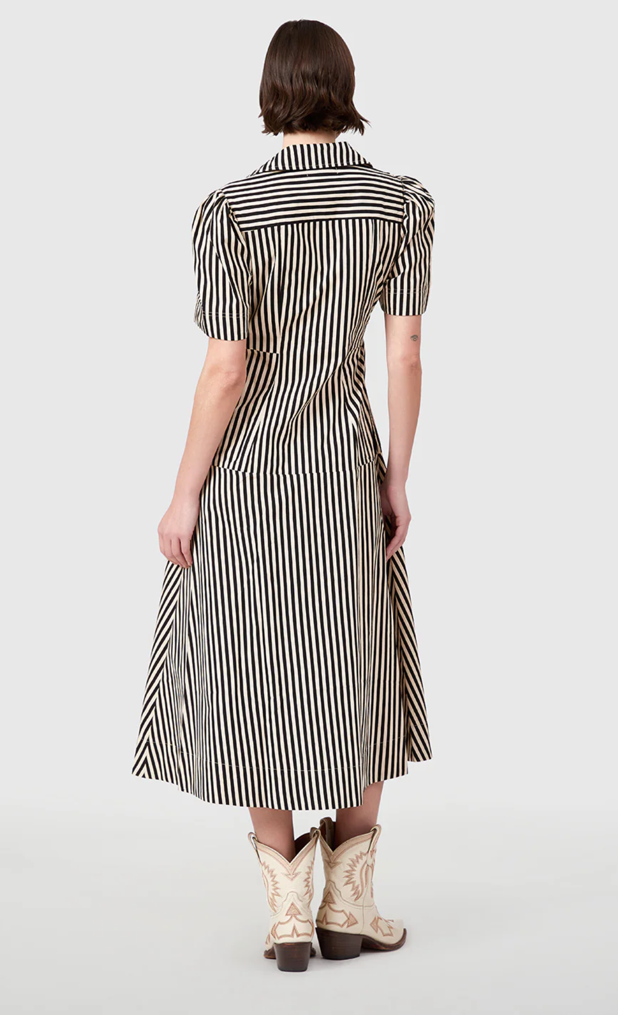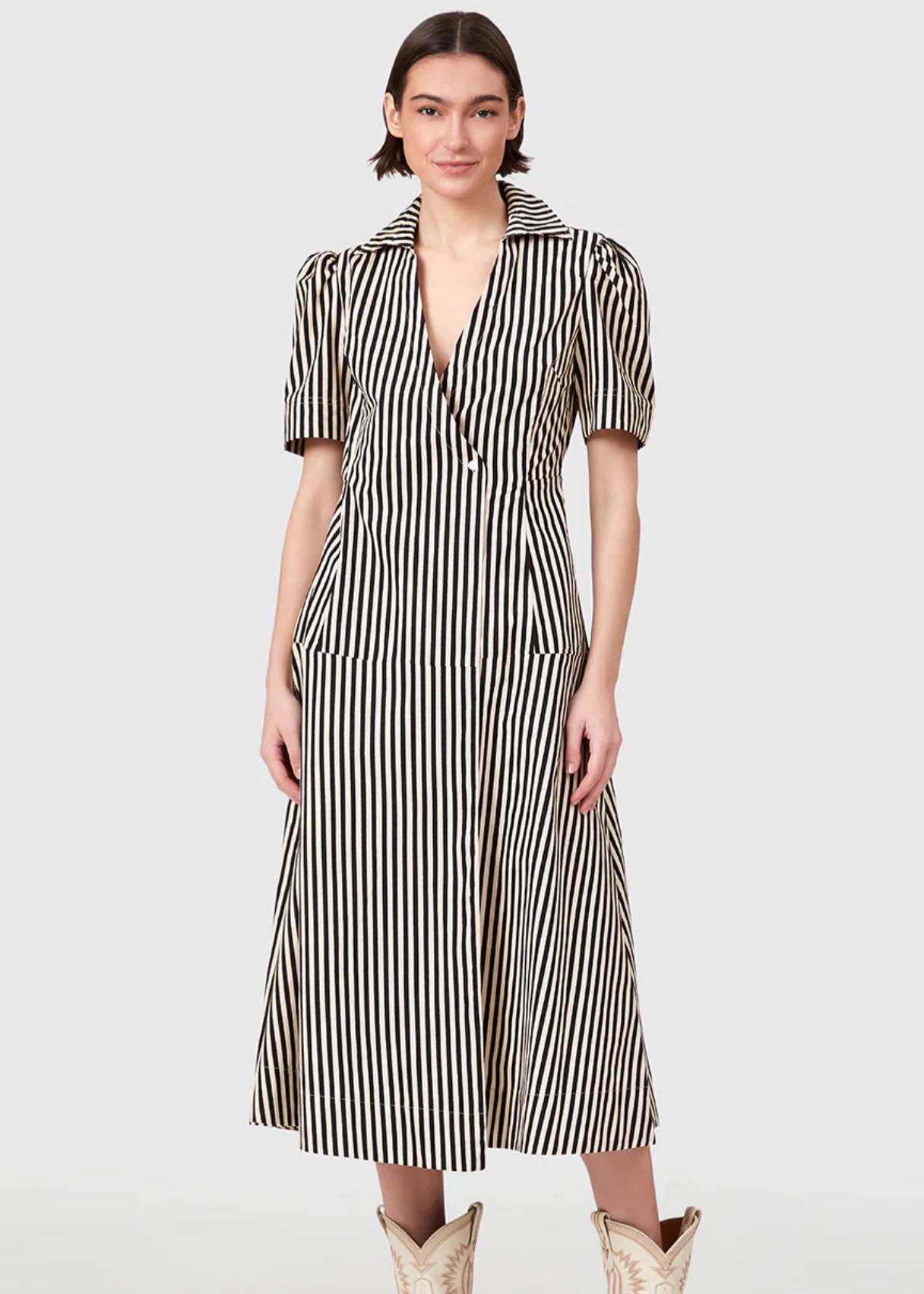 The Clark Dress features a flattering faux-wrap bodice with a notched collar and short, tailored sleeves. It’s designed with a defined waist and an A-line skirt that falls just below the knee, creating a feminine and structured silhouette. A subtle side button detail adds interest to the wrap-style front.