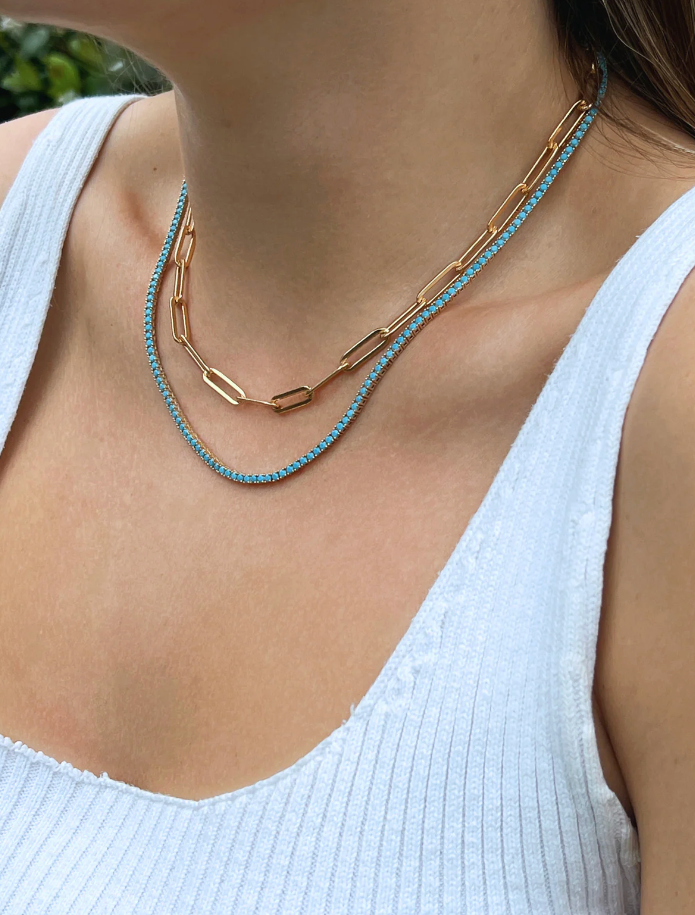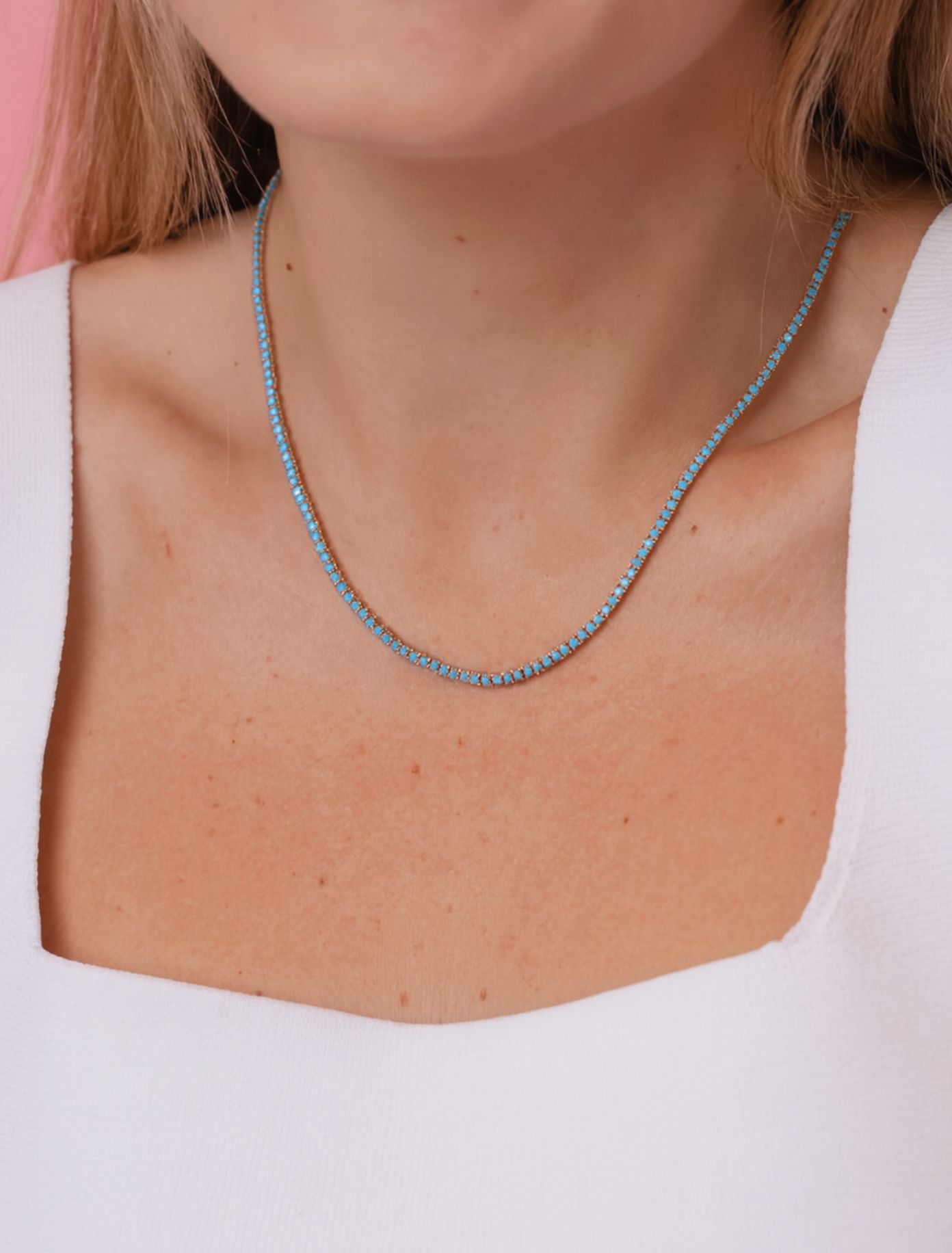 Our Turquoise Tennis Necklace features a strand of vibrant turquoise-colored stones set in gold fill — giving you the luxe look of a diamond tennis necklace with a bold, beachy twist.