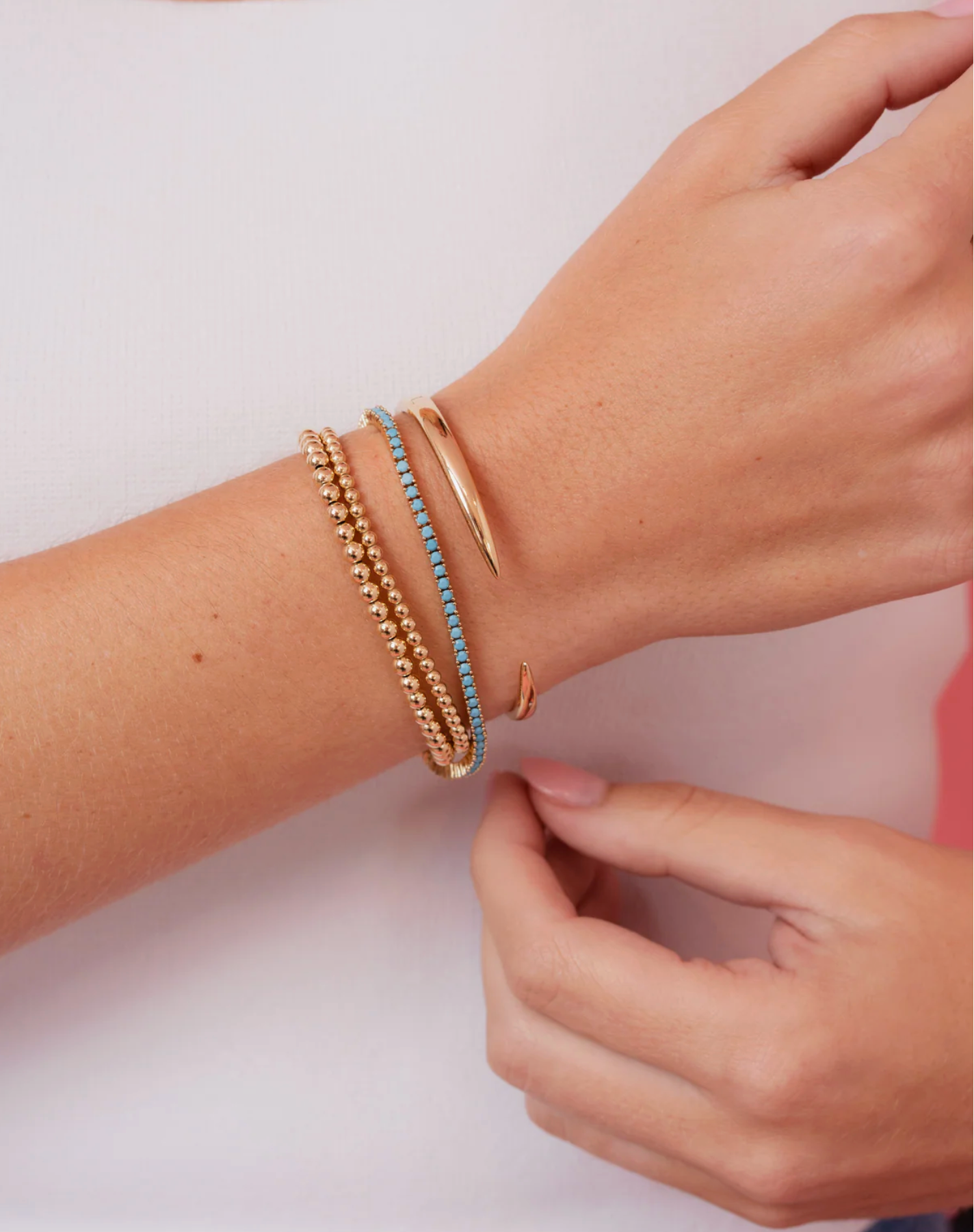 Our Turquoise Tennis Bracelet features a strand of vivid turquoise-colored stones set in gold fill — bringing a playful, beachy pop of color to your everyday wrist game.
