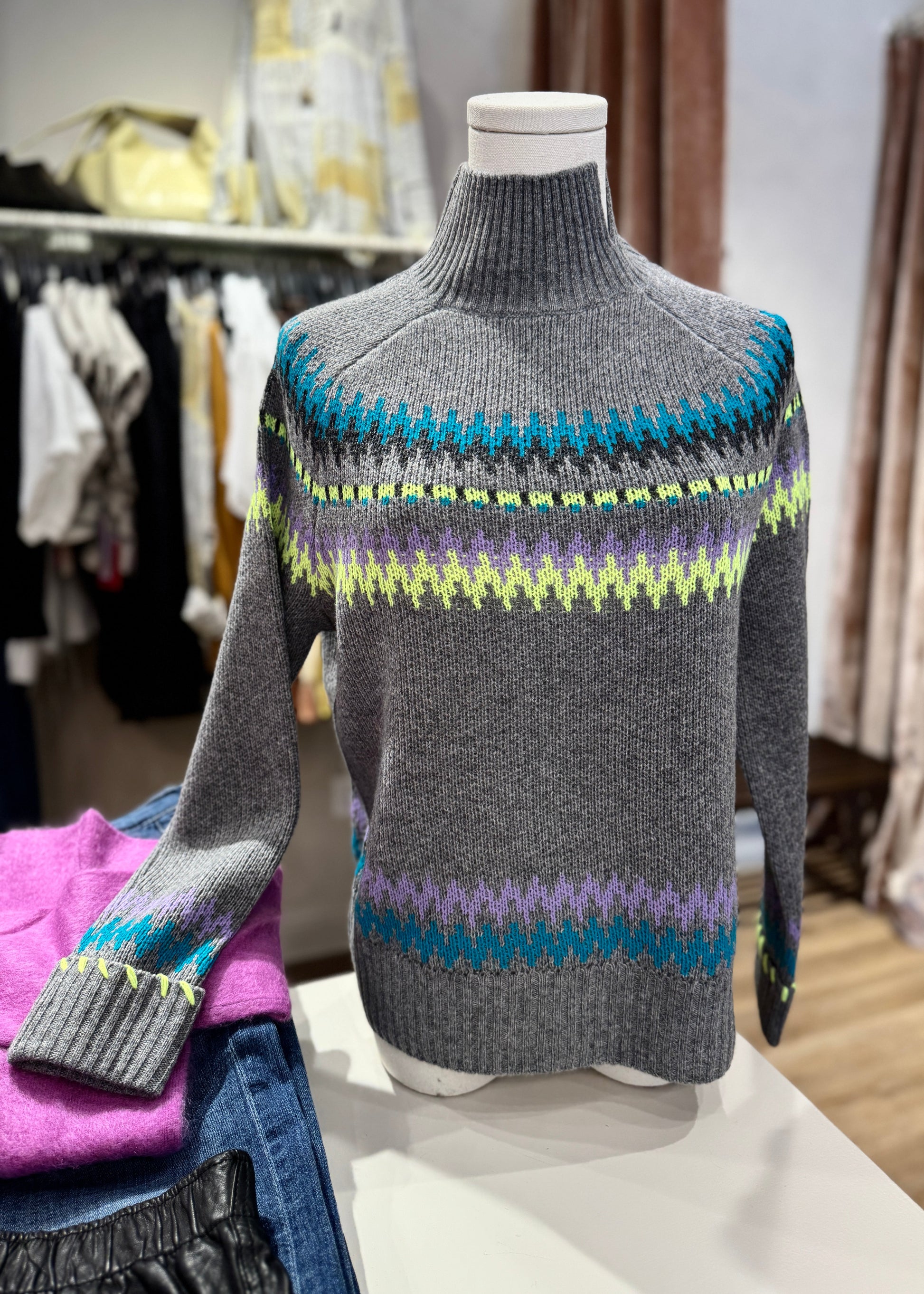 The Fireside Sweater features a striking vivid color chevron pattern against a subtle gray background, creating a balanced yet eye-catching design. Its split neck adds a modern touch and enhances comfort, making it ideal for layering during cooler seasons. Expertly crafted for both style and functionality, this sweater brings warmth and sophistication to your everyday wardrobe.