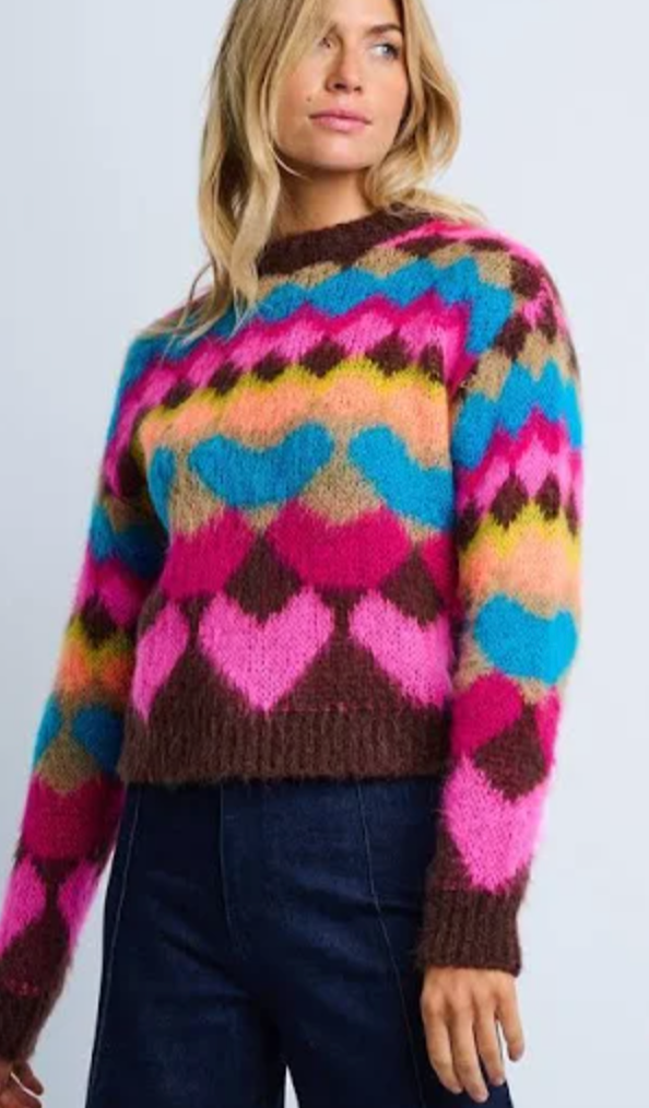 The Ciao Bella Sweater features a vibrant design where bright color chevrons seamlessly transition into heart patterns, adding a playful yet sophisticated touch. Crafted from luxurious mohair, this piece offers exceptional softness and warmth, perfect for elevating any outfit with expert style and comfort.