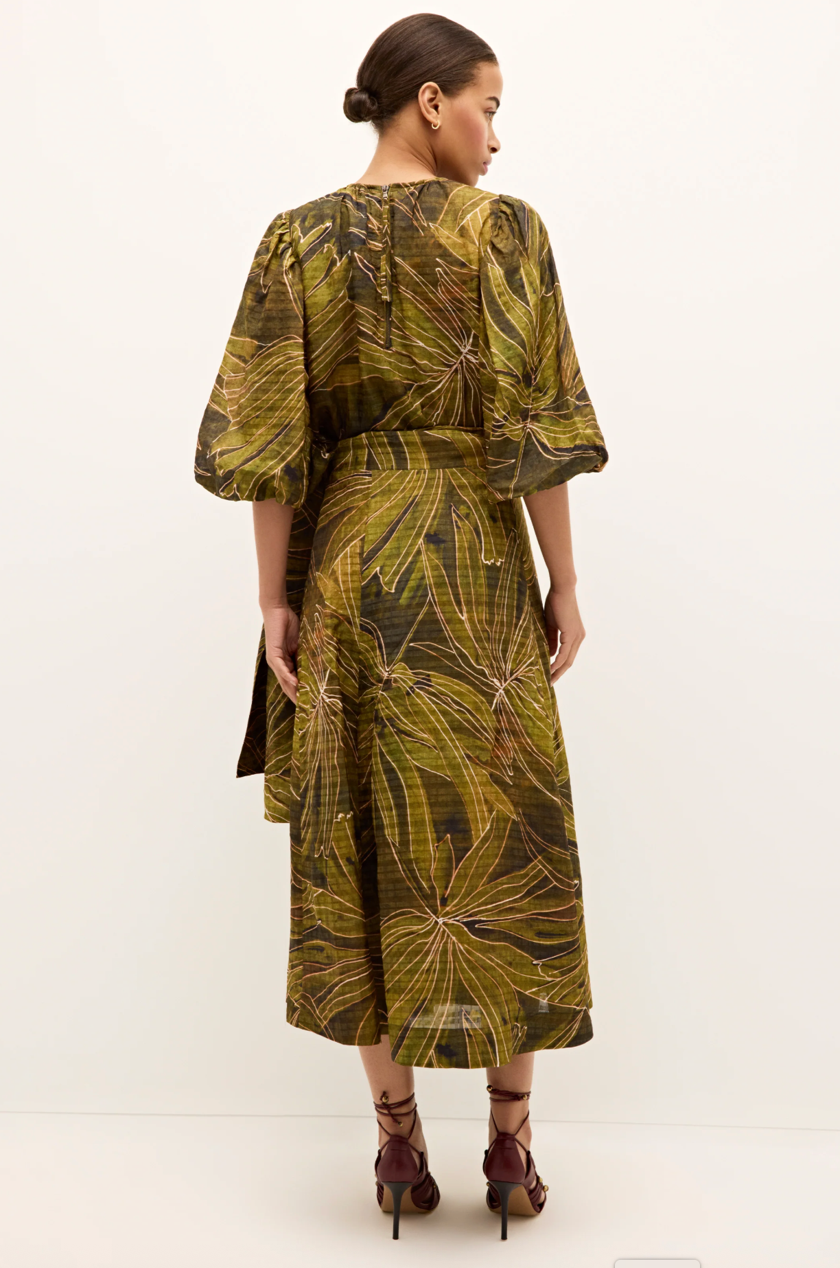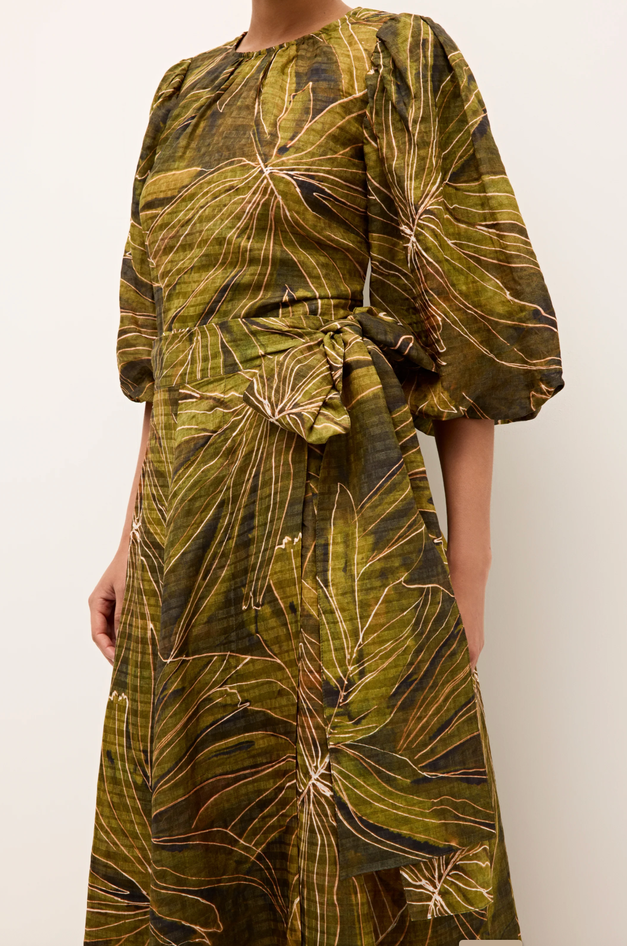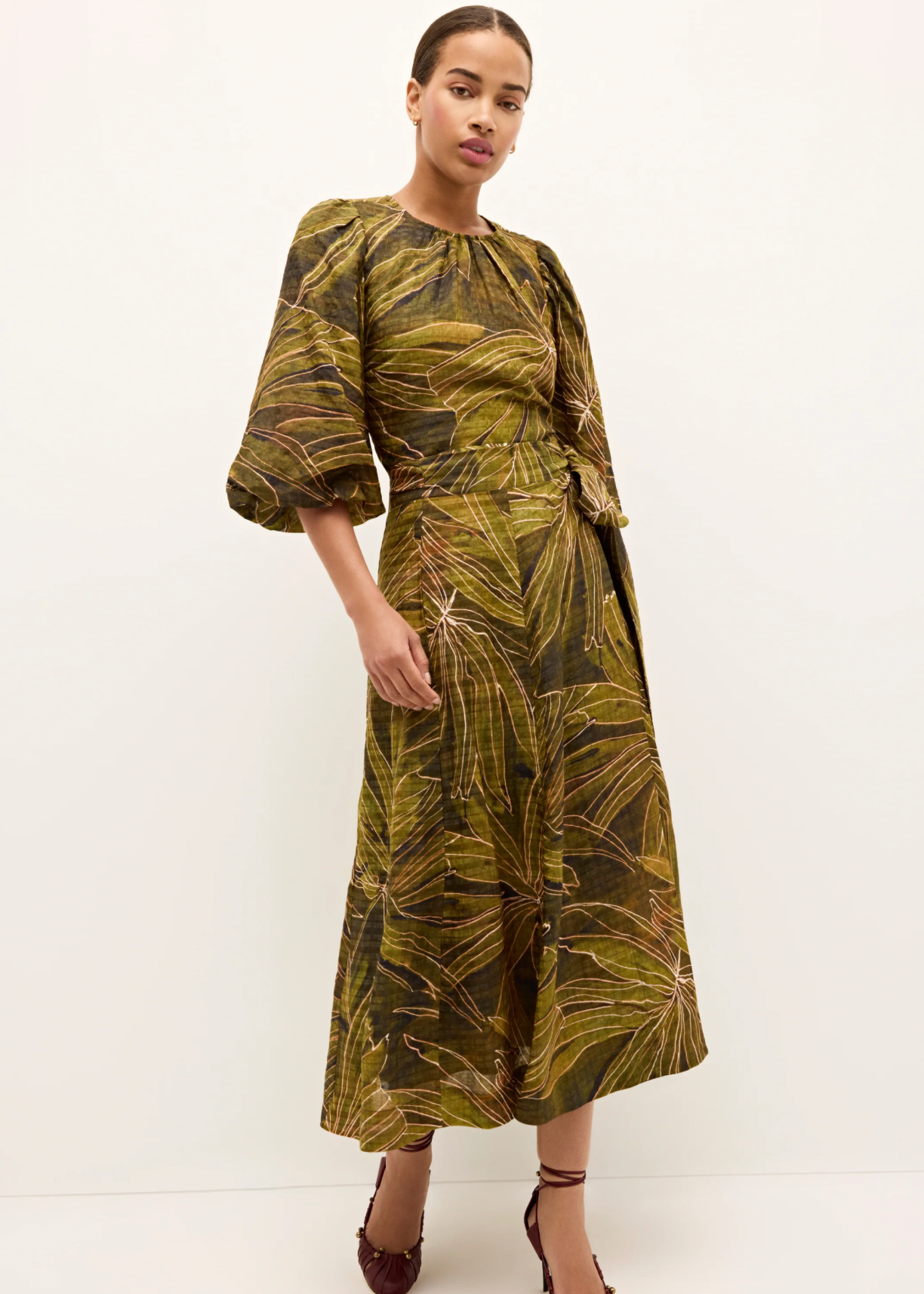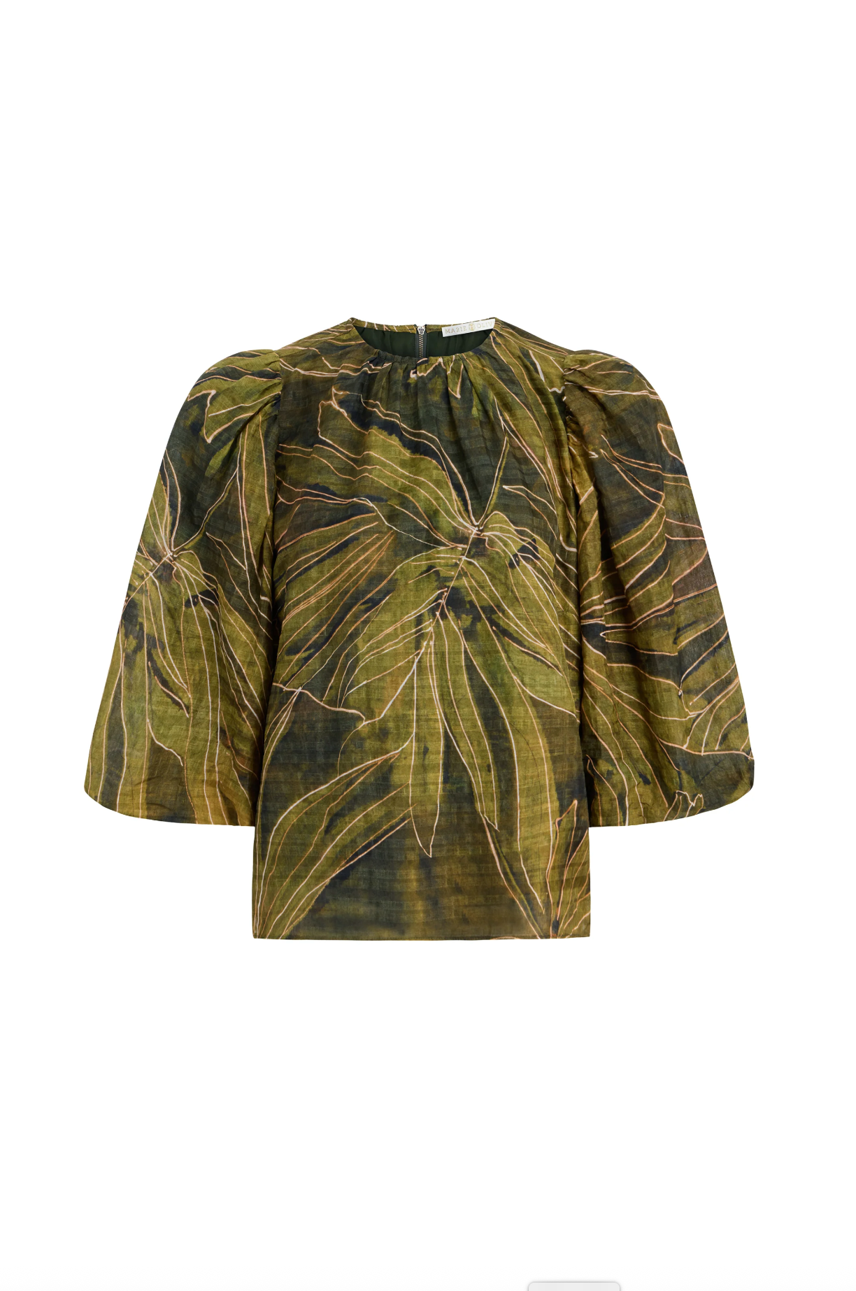 Harly is a fan favorite for its striking balloon sleeves and flattering gathered neckline, but the elegant top’s appeal is amplified by expert tailoring and subtly textured fabric. The slip-on style is pictured here in Canopy, a moody palm print in deep olive green.