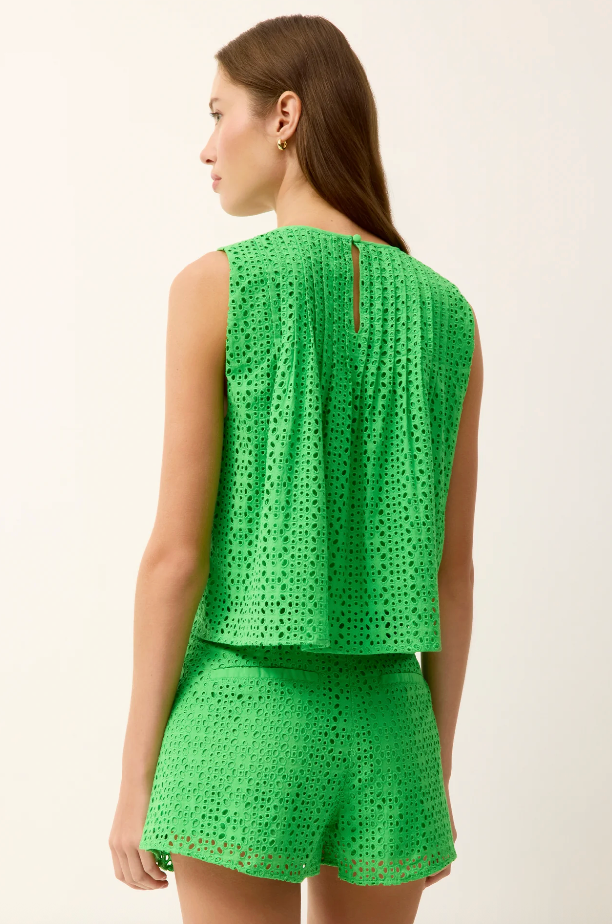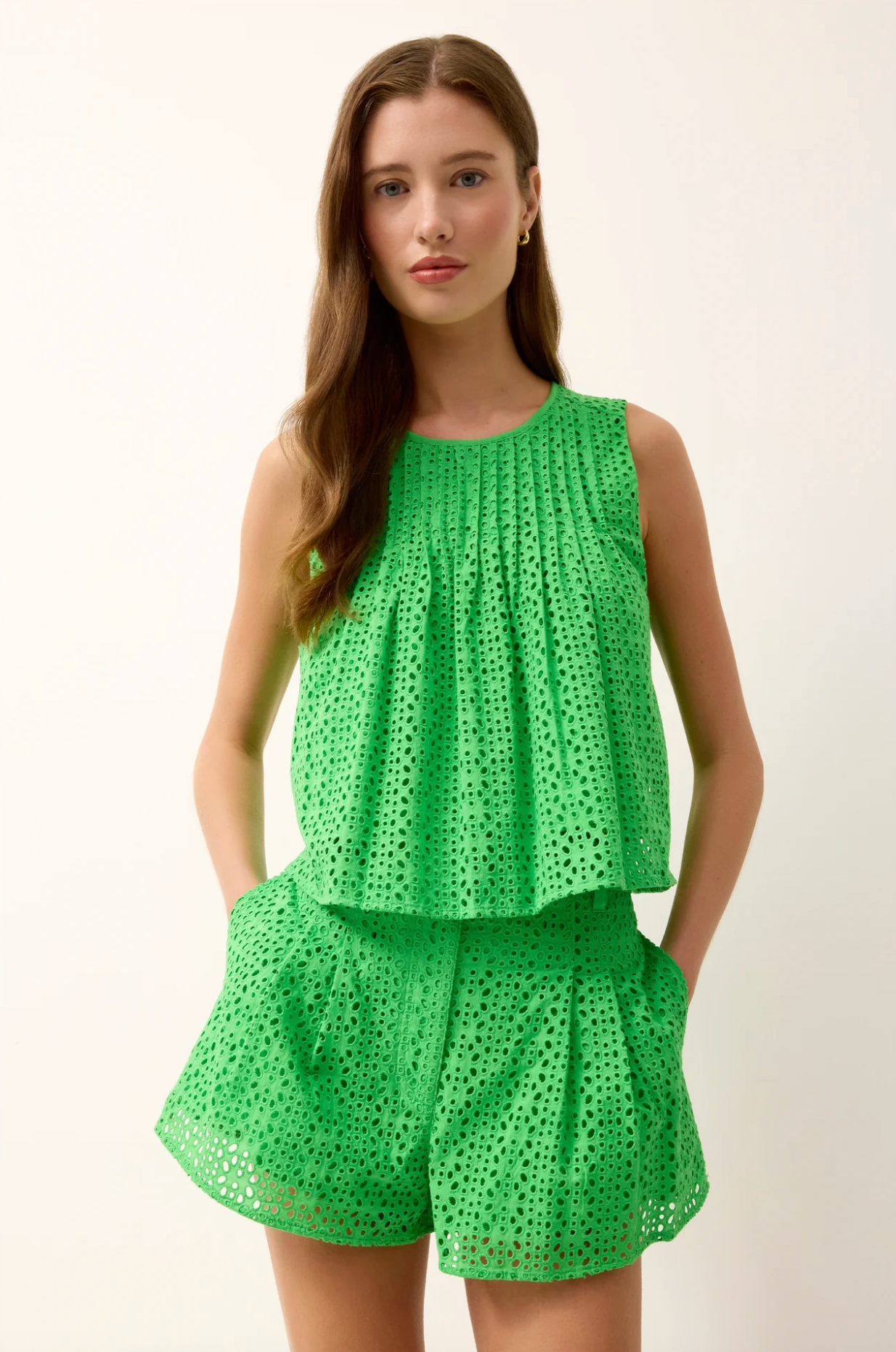Eletta is a fan favorite at Marie Oliver HQ. This easy swing top features delicate pintuck pleats and a flattering A-line shape that moves beautifully on the body. Rendered in a vibrant highlighter green eyelet, it brings an instant pop of energy to your spring wardrobe. Pair the bold solid with the matching Lander short for a set that truly shines.