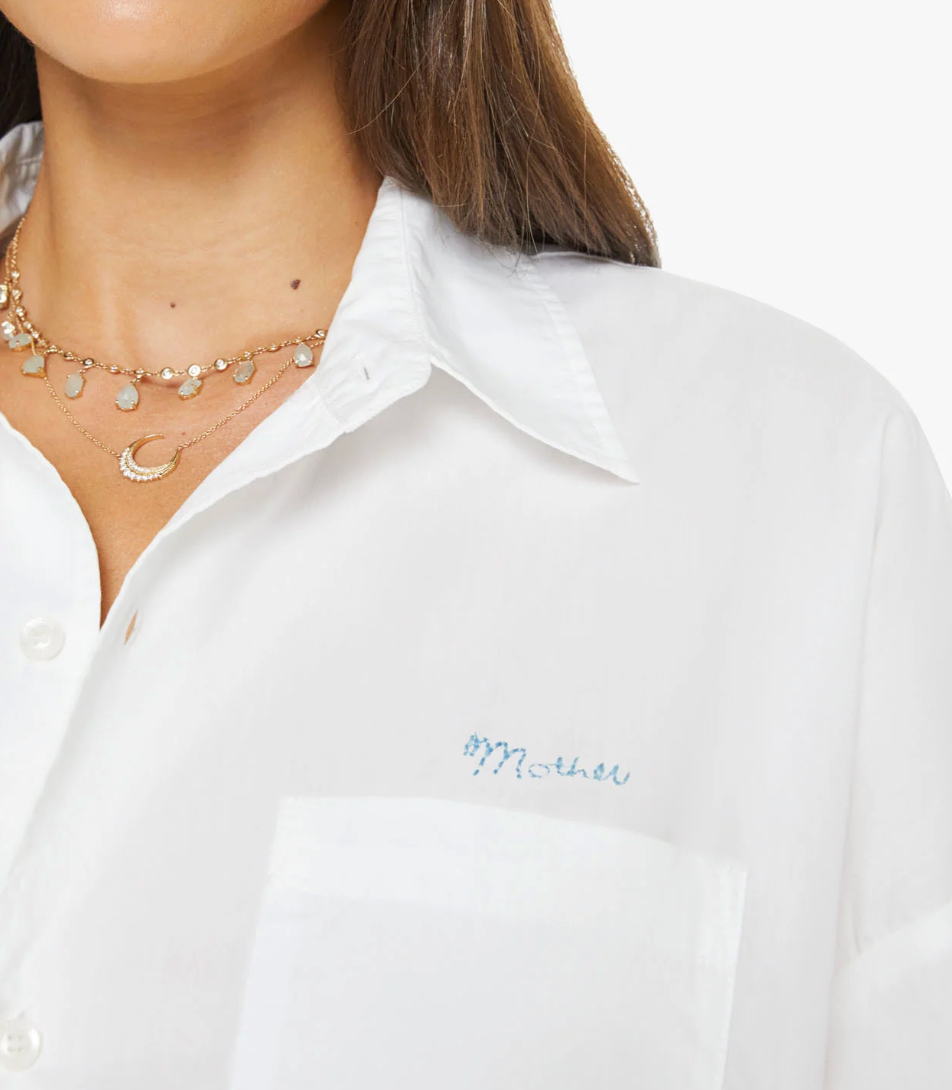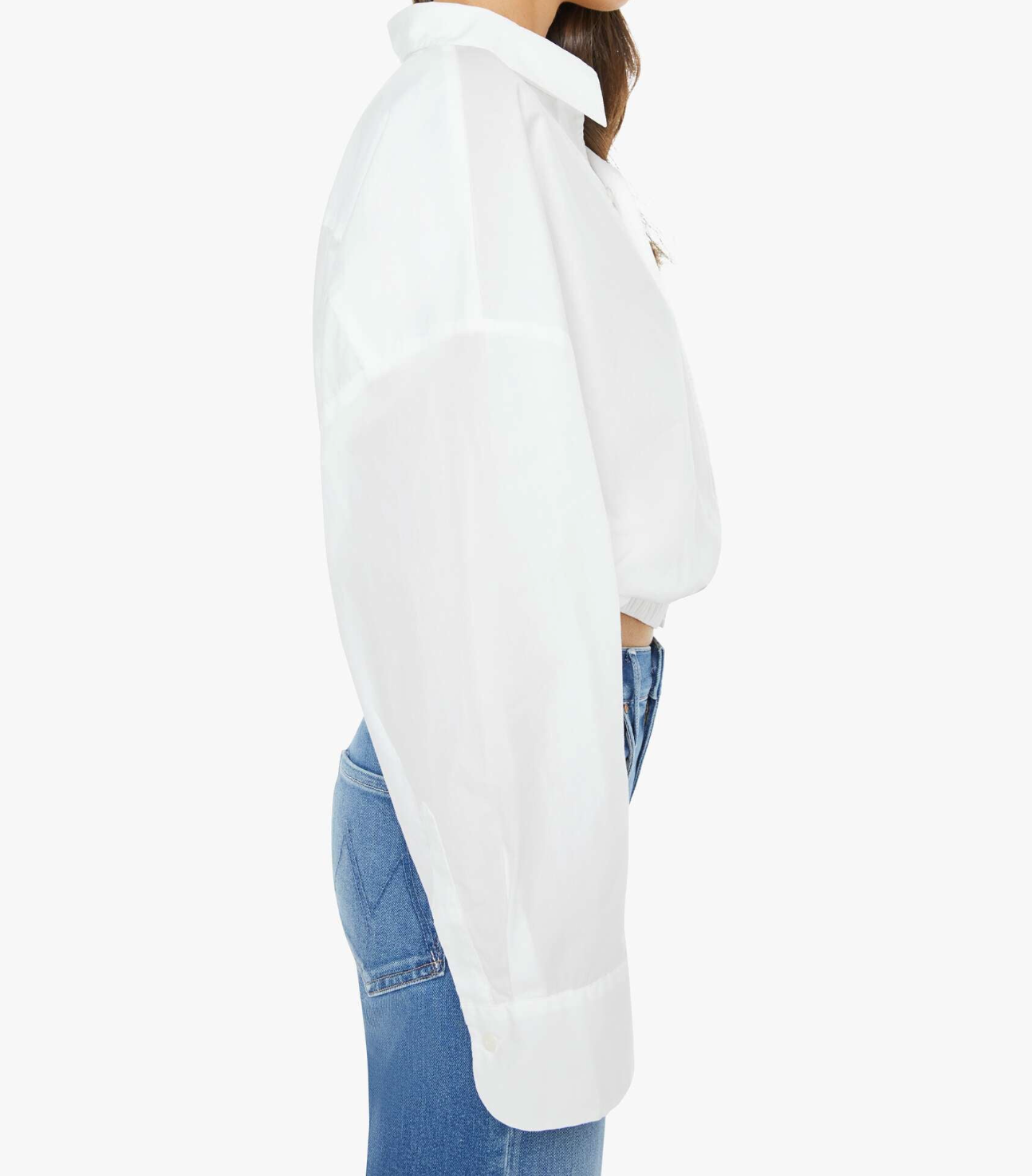 An expanded collection of foundational pieces designed for All Day, Every Day. Created for versatility, layering, and year-round wearability, these are the pieces you will never stop reaching for. A cropped button-up with long wide sleeves and a bubble hem. Made from 100% cotton, the top is designed in white.