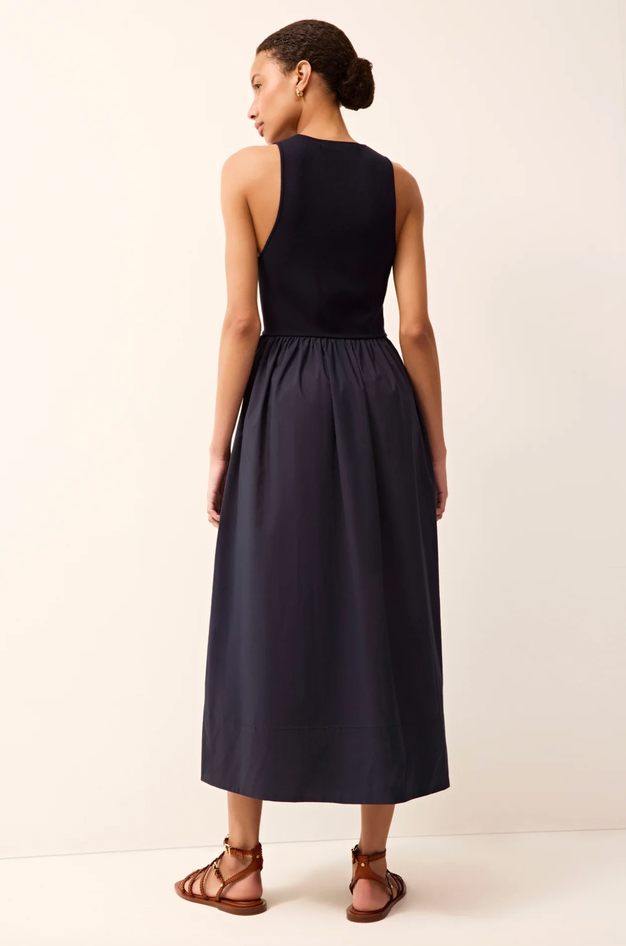 With a simple yet sophisticated construction, this mixed media tank dress features a snug ribbed knit bodice and a full cotton poplin skirt. The effortless slip-on style comes in a classic navy-blue solid and is so perfectly packable that we’re tempted to plan a trip just to wear it.