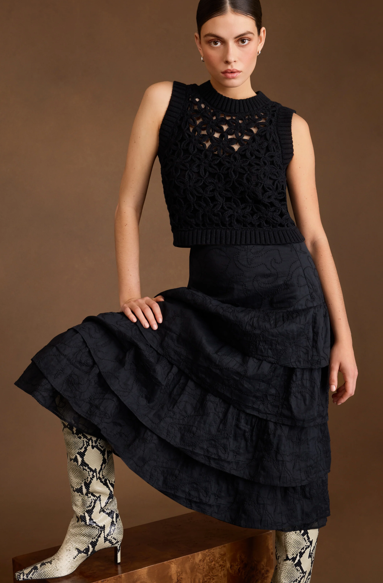 Our design team loves a classic black top, but this crochet shell is a timeless favorite. The chic silhouette features a cropped figure-skimming fit, a cotton tank liner, and a gorgeous floral overlay. Thea is styled here with our Christie skirt in Tourmaline for an exuberant set that crosses the seasonal divide.