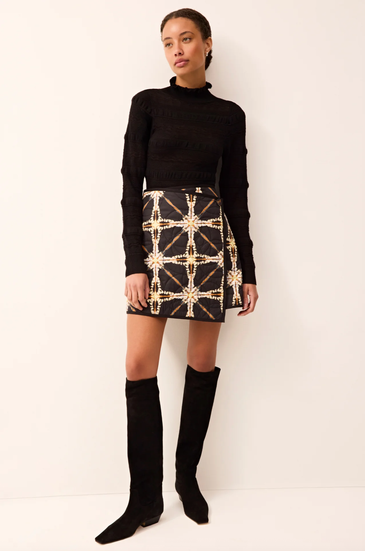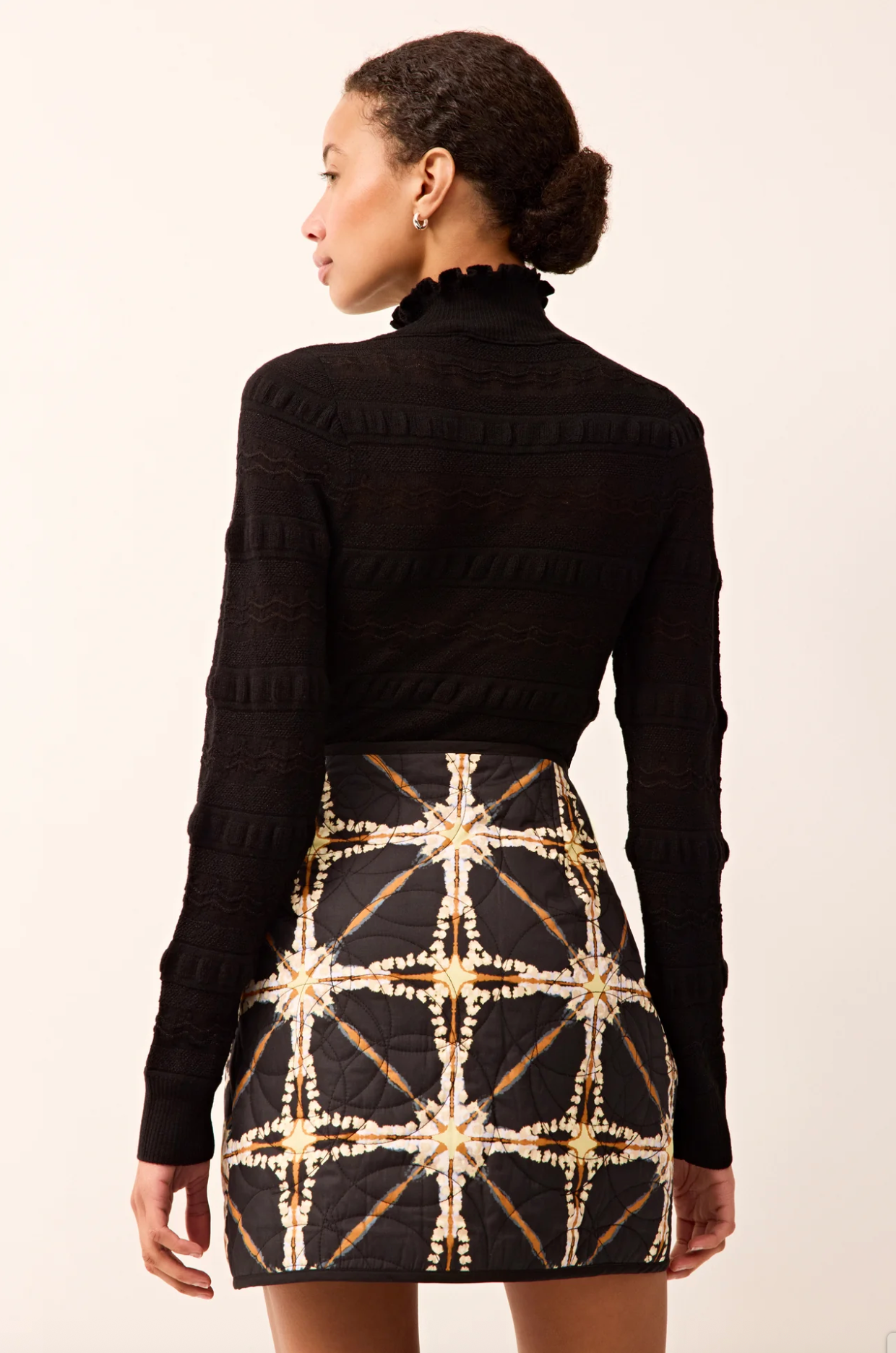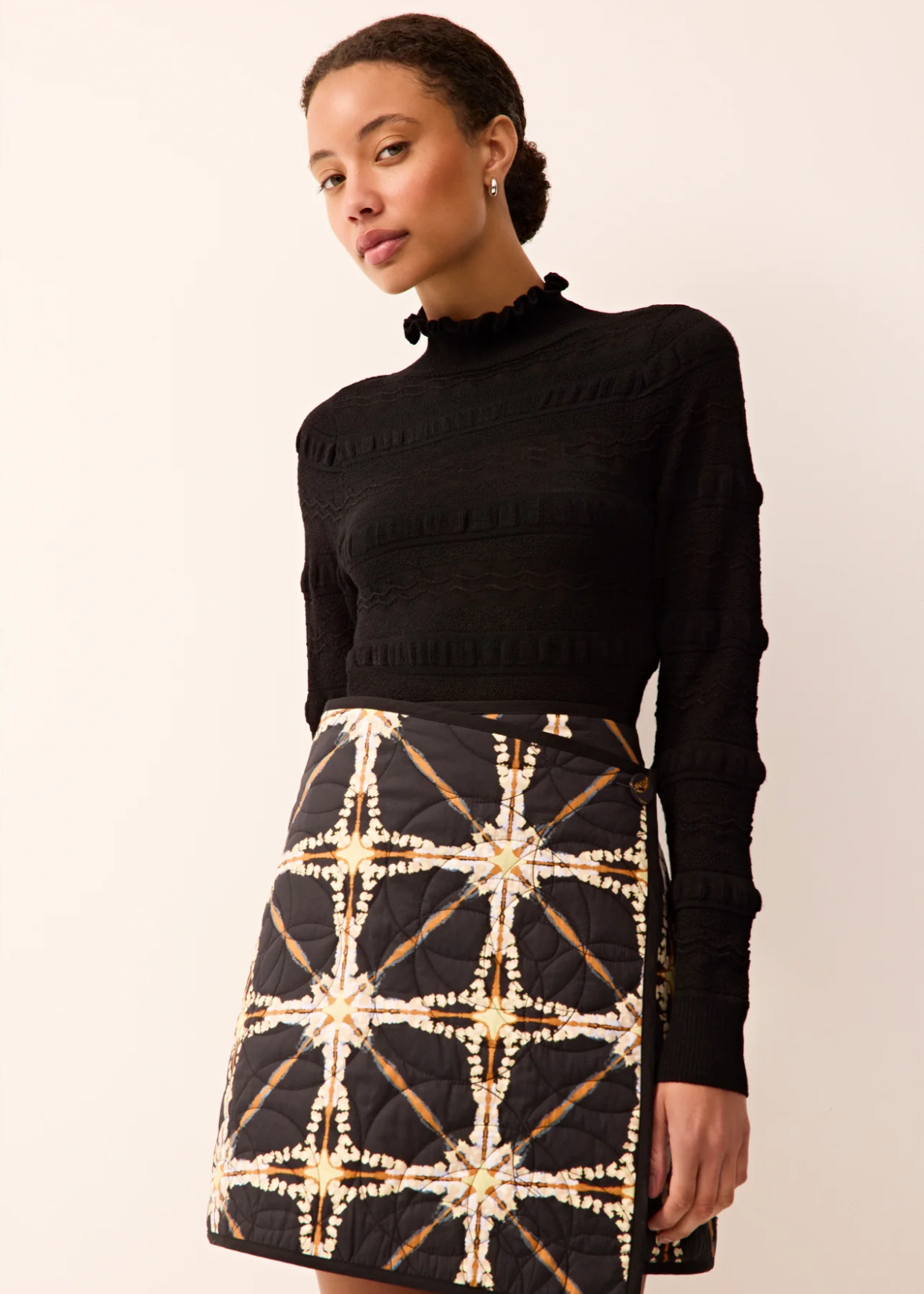 Your new favorite body-skimming turtleneck gets a feminine upgrade with allover folded ruffle details, plus a delicate pointelle knit woven with metallic yarn for a subtle shimmer. We love the juxtaposition of the ladylike black sweater with the clean lines of this season's skirts, including the quilted Orca, balancing soft detail with bold seasonal patterns and textures.