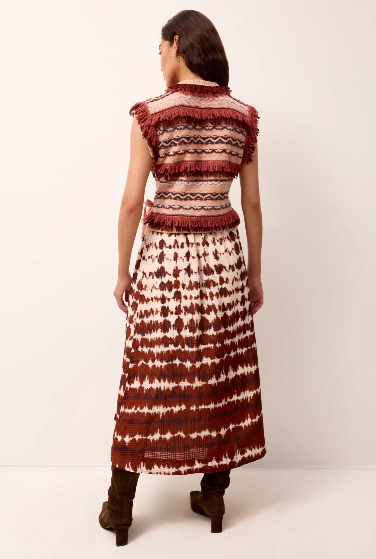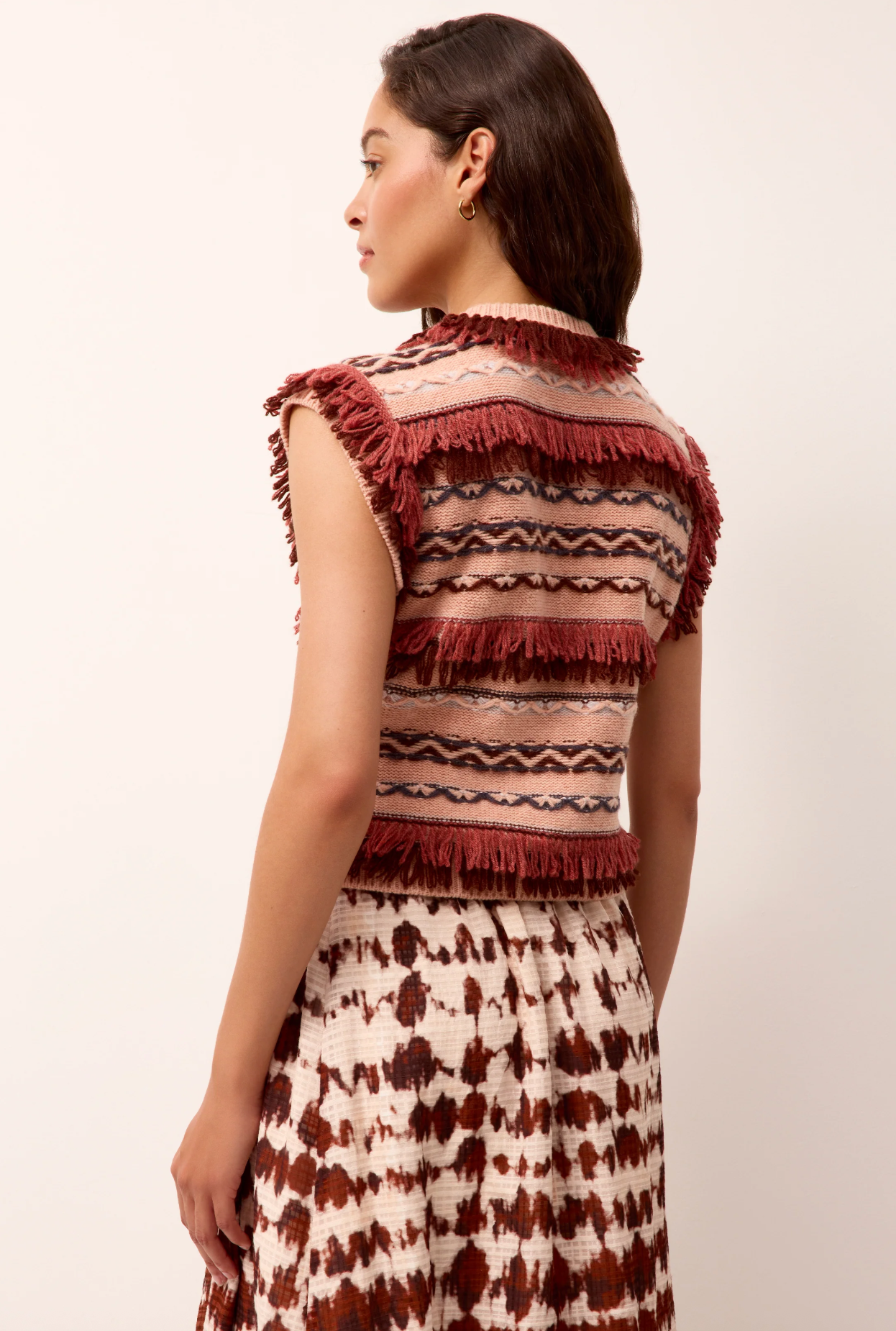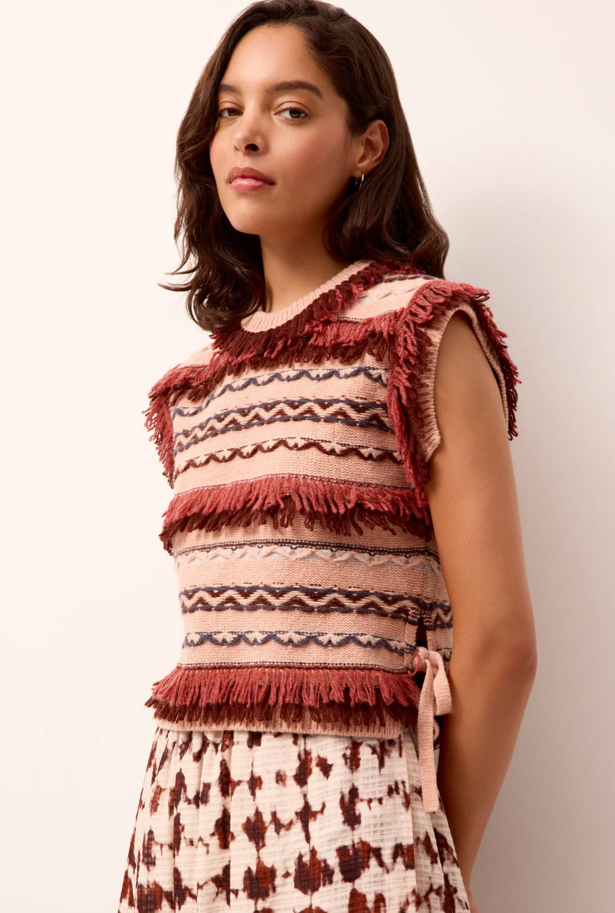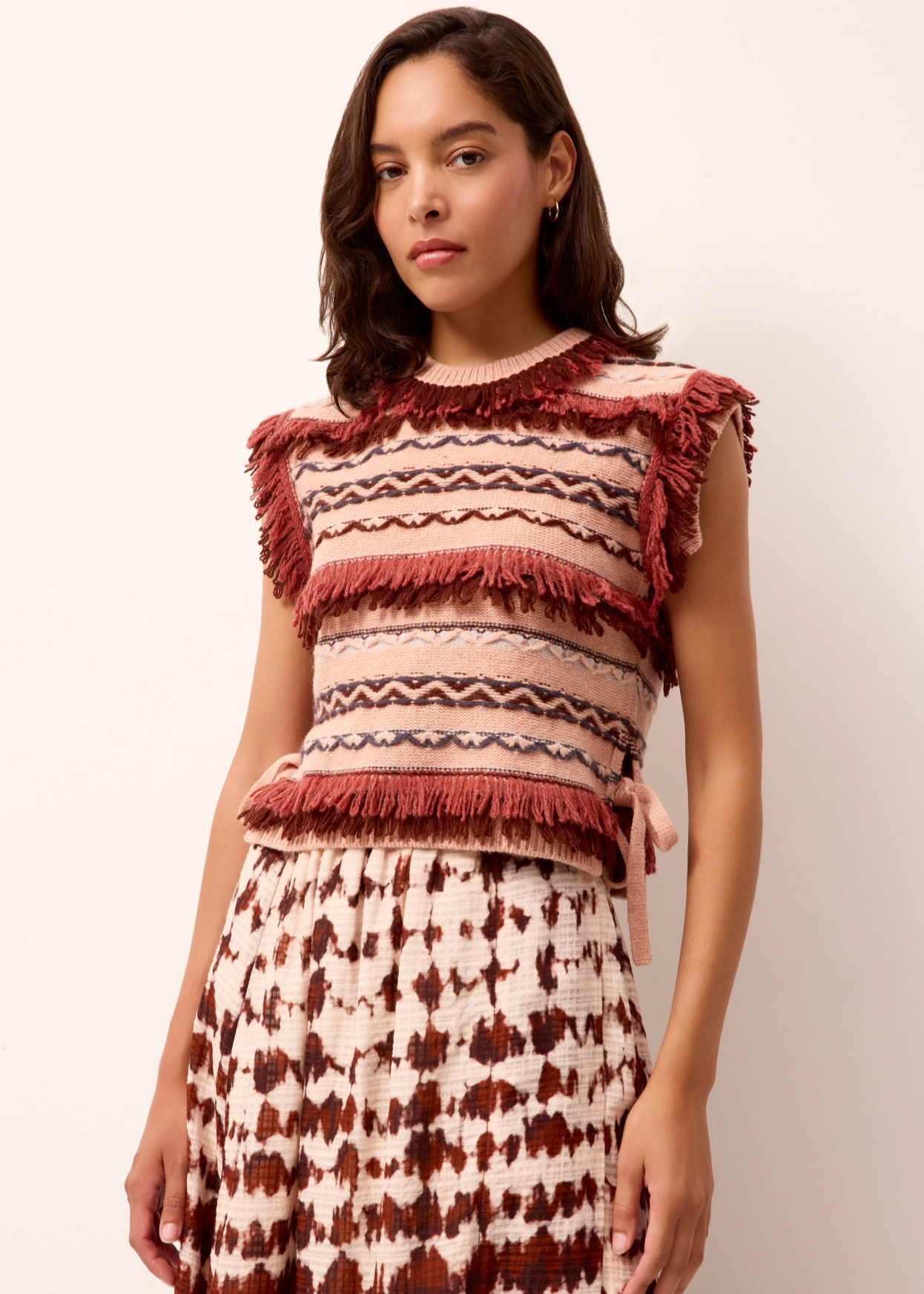 Textured stitching and fringe details add new life to a classic fair isle pattern, steeped in the autumnal palette of our Volcanic colorway. The sleeveless, wool construction of the Desmond popover allows for the best of all worlds, embracing the elements of fall while still allowing for comfort. Ties at the side tailor it to your body, and the organic nature of the Estine wrap in Catalonia creates a stylish juxtaposition that certainly makes an entrance.