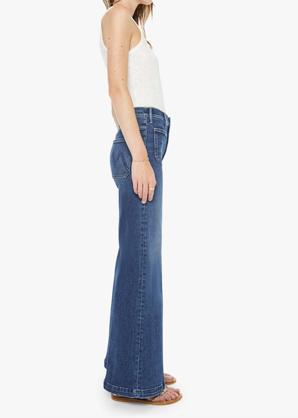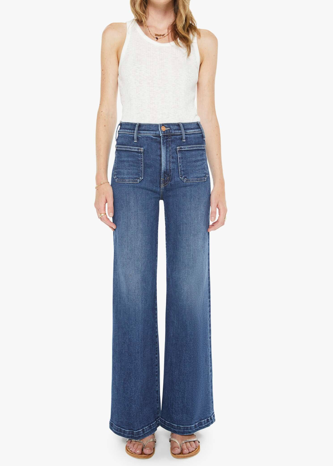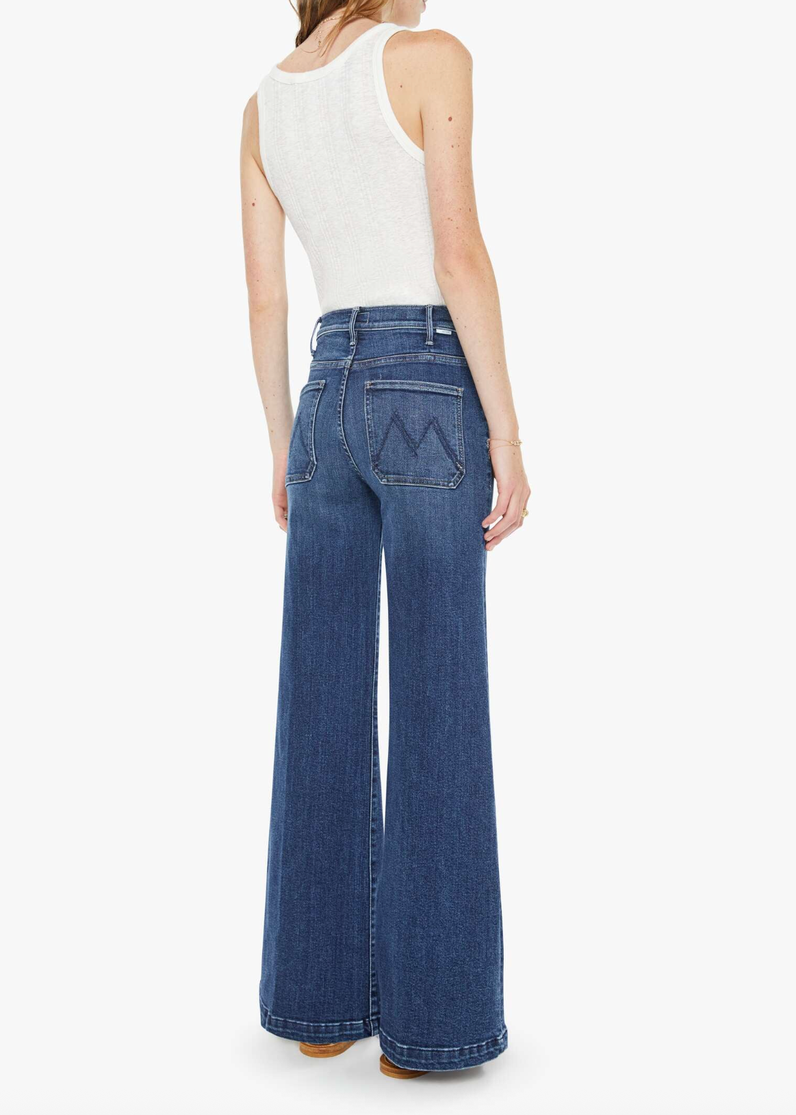 Hail Mary. 70s-inspired wide leg jeans with a high rise, zip fly, patch pockets, 31-inch inseam and a clean hem. Made from stretch denim, One Last Shot is a dark blue with subtle whiskering and fading at the knees.