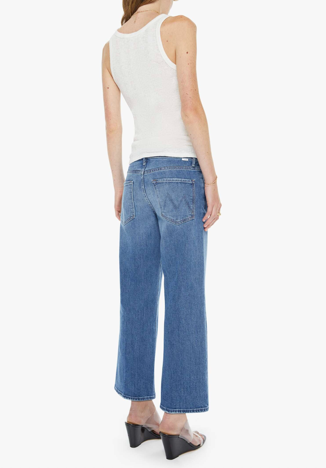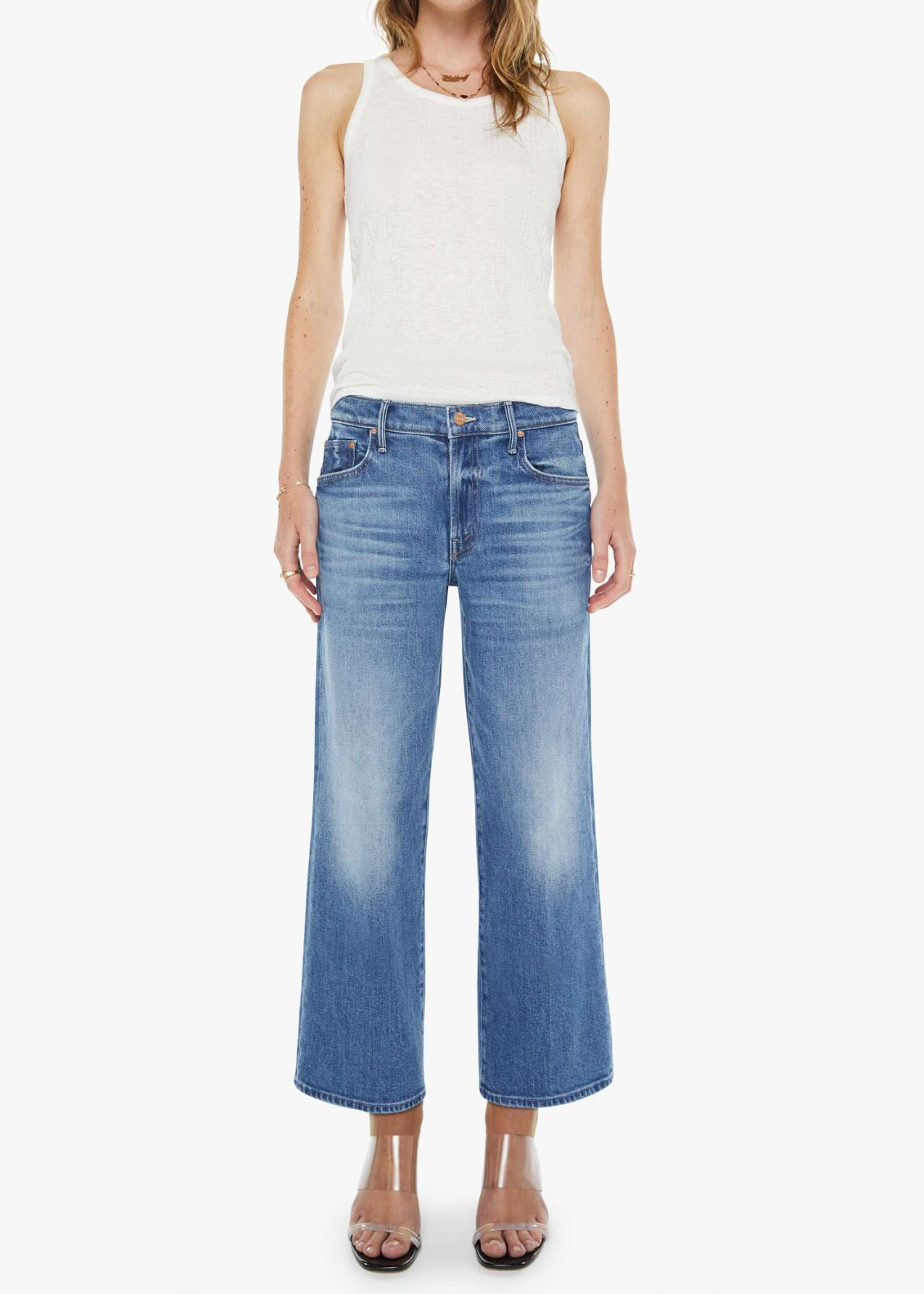 All in. Mid-rise jeans with a loose fit, wide leg, zip fly and ankle-length inseam with a clean hem. Made from stretch denim, All Your Eggs In One Basket is a mid blue with whiskering and fading at the knees.