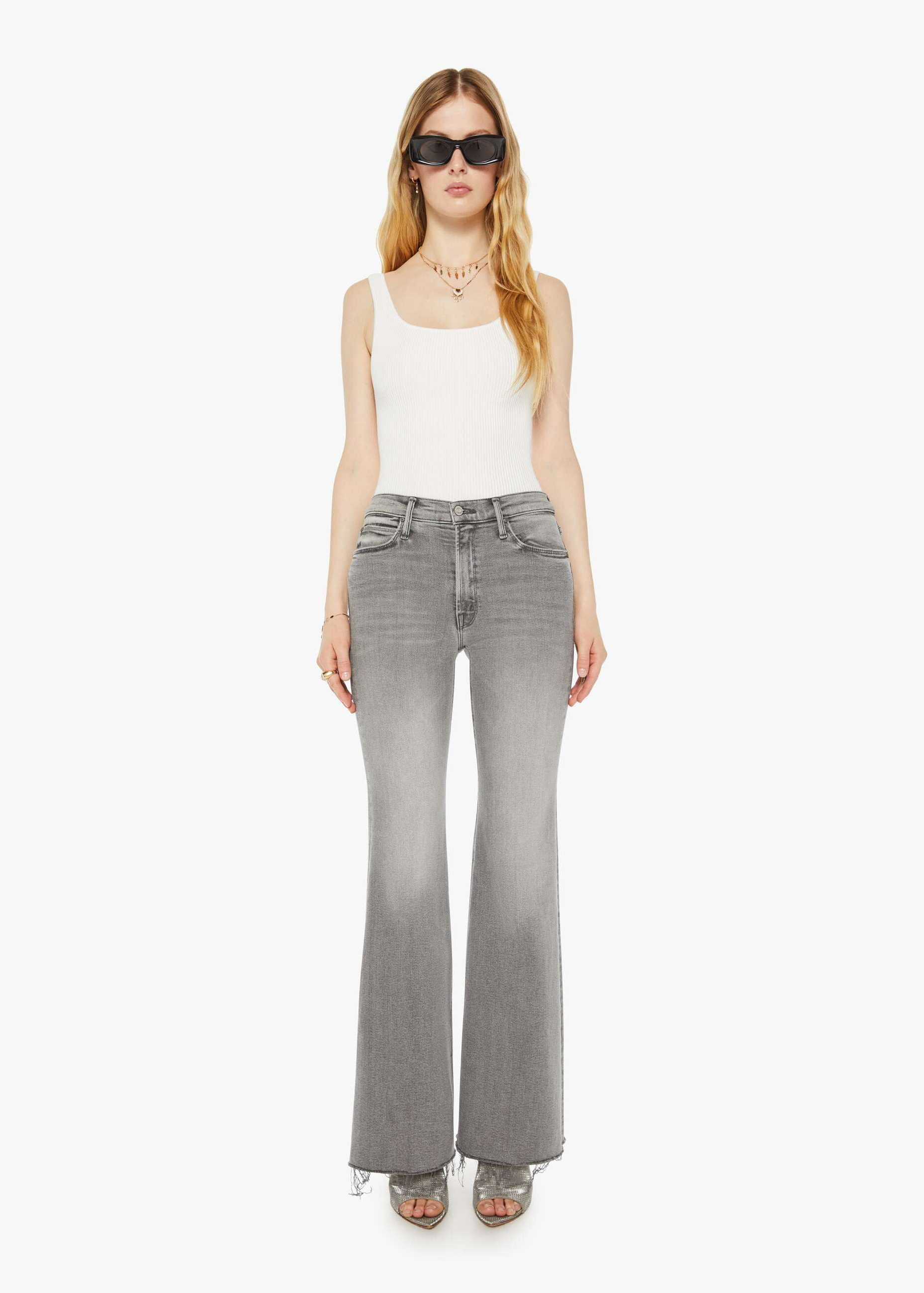 Take a hike. A high-rise flare with a long 32-inch inseam, zip fly and a frayed hem. Made from stretch denim, Catch Me Outside is light grey with whiskering and fading at the knee.