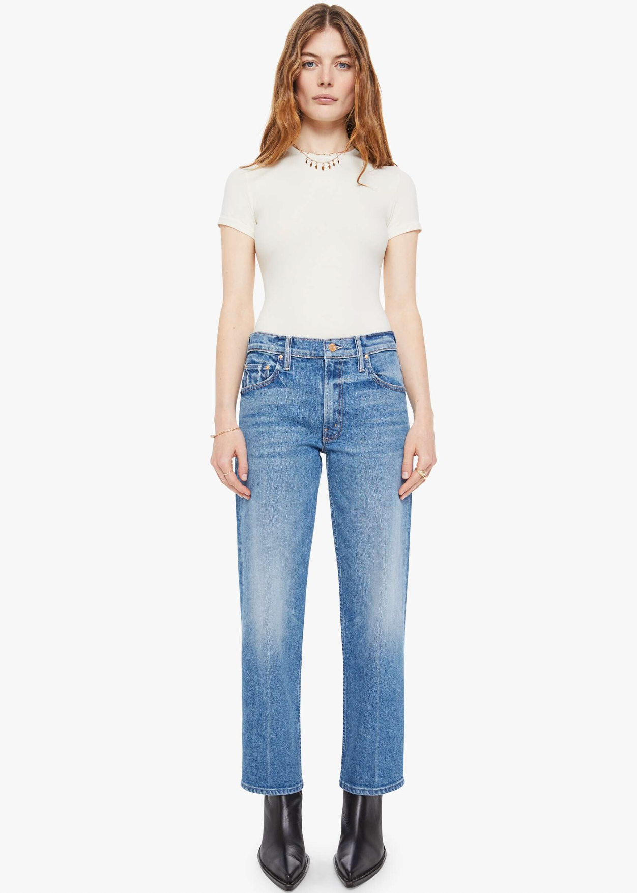 New fit. High-rise straight-leg jeans with a zip fly, ankle-length inseam and a clean hem. Made from rigid denim, Hokey Pokey is a mid-blue with whiskering and fading at the knees.