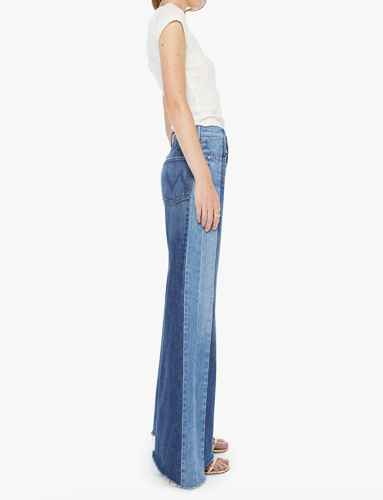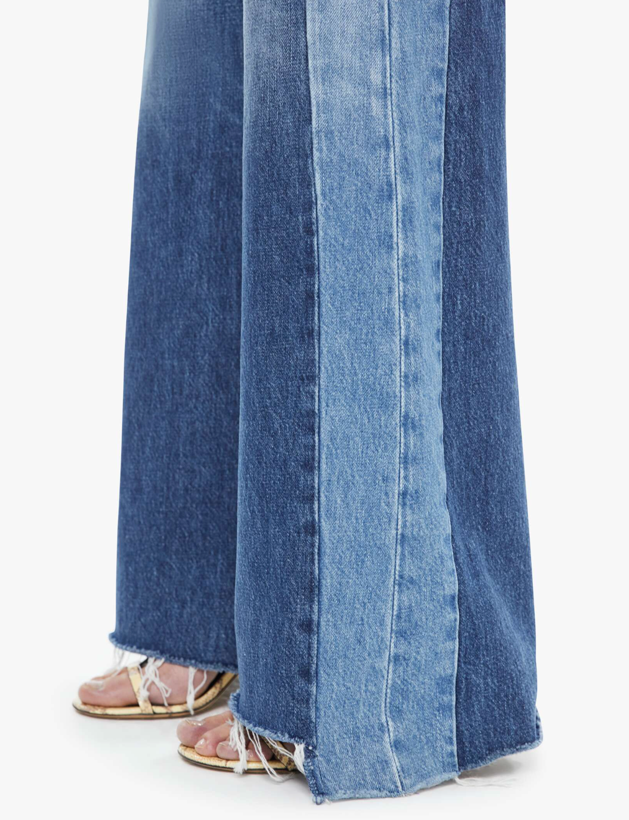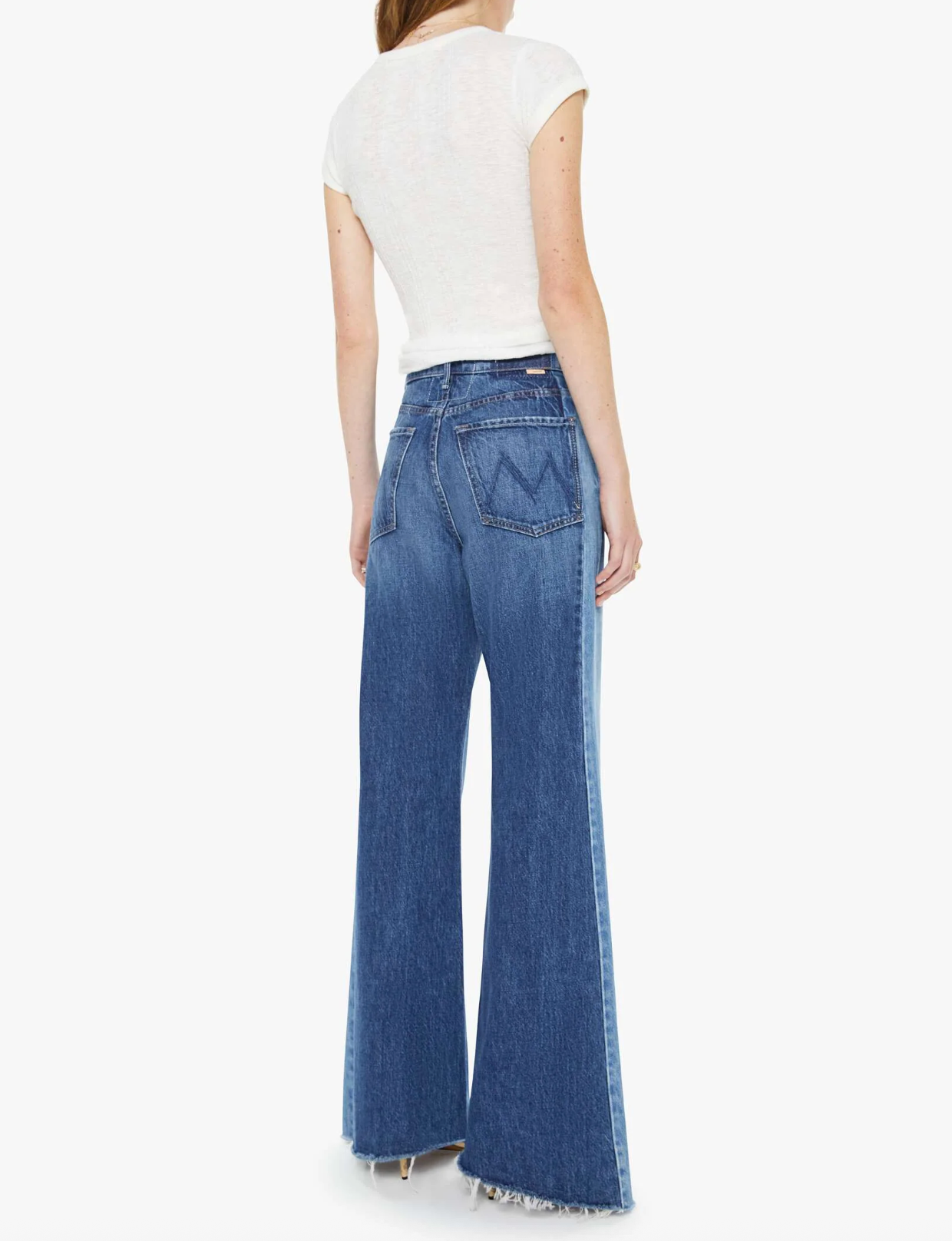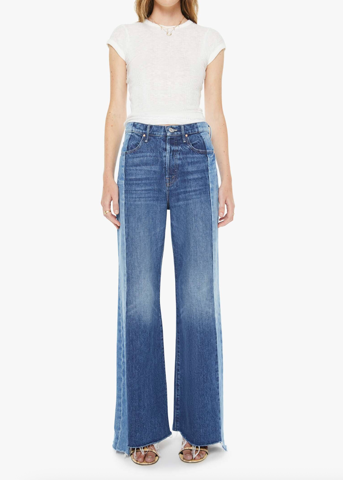 Made ya look. High-waisted wide-leg jeans with a button fly, long 32-inch inseam and a frayed, uneven hem. Made from rigid SUPERIOR denim, Double Take is mid blue with whiskering, fading and lighter panels down the outer leg.