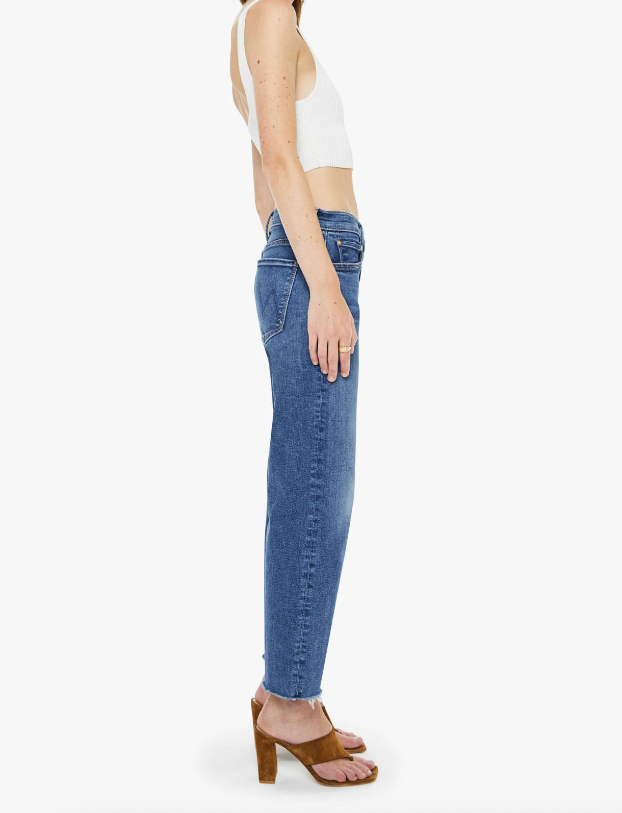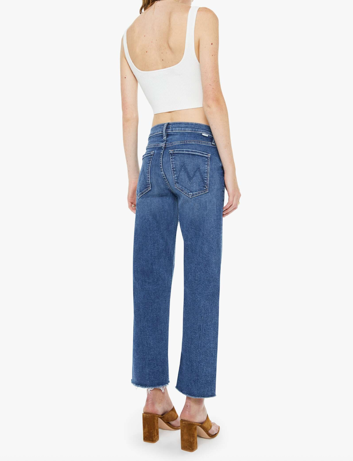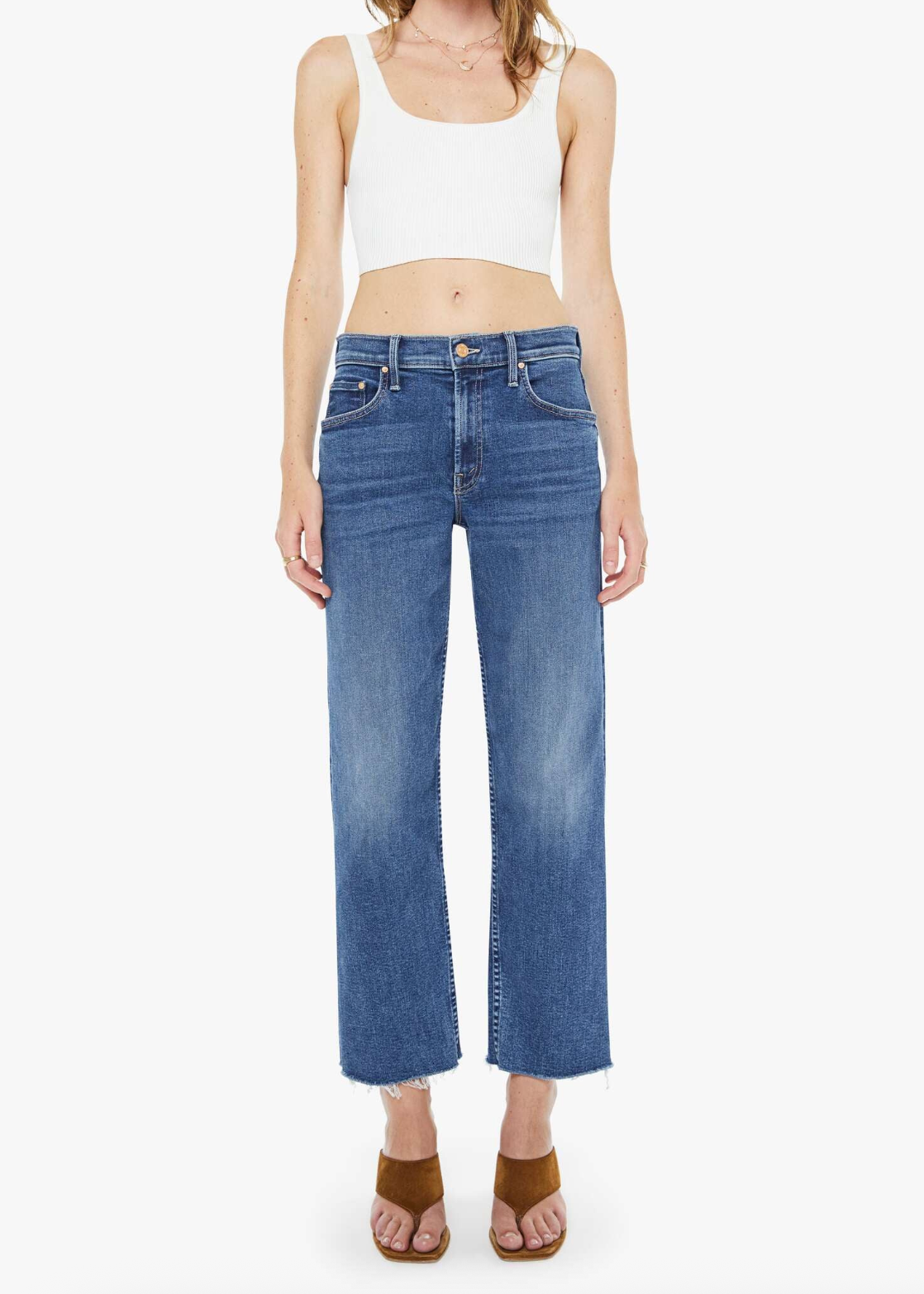 Hidden treasure. Mid-rise straight-leg jeans with a zip fly, ankle-length inseam and a frayed hem. Made from stretch denim, Prized Possession is a mid blue with subtle whiskering and fading at the knees.