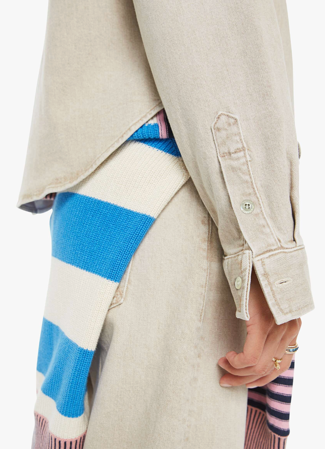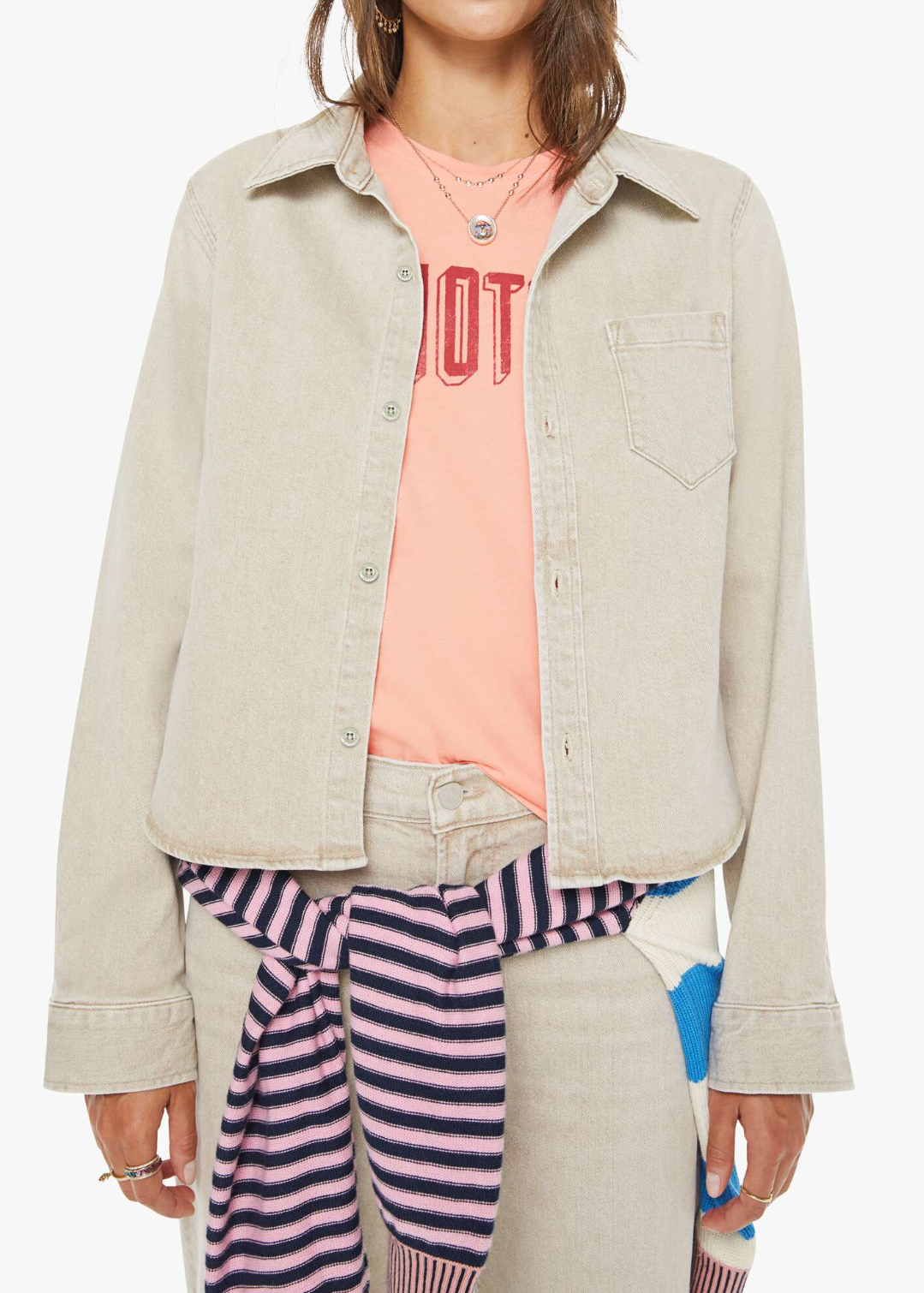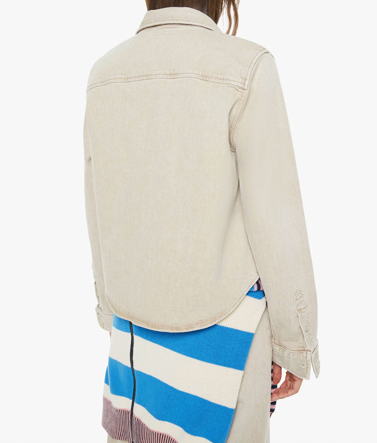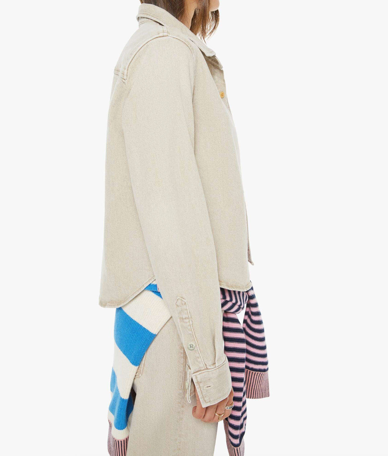 A button-up denim top with a front patch pocket and a curved, cropped hem. Made from semi-rigid SUPERIOR denim, Caramel is a faded khaki with tan stitching and shell-inspired buttons.