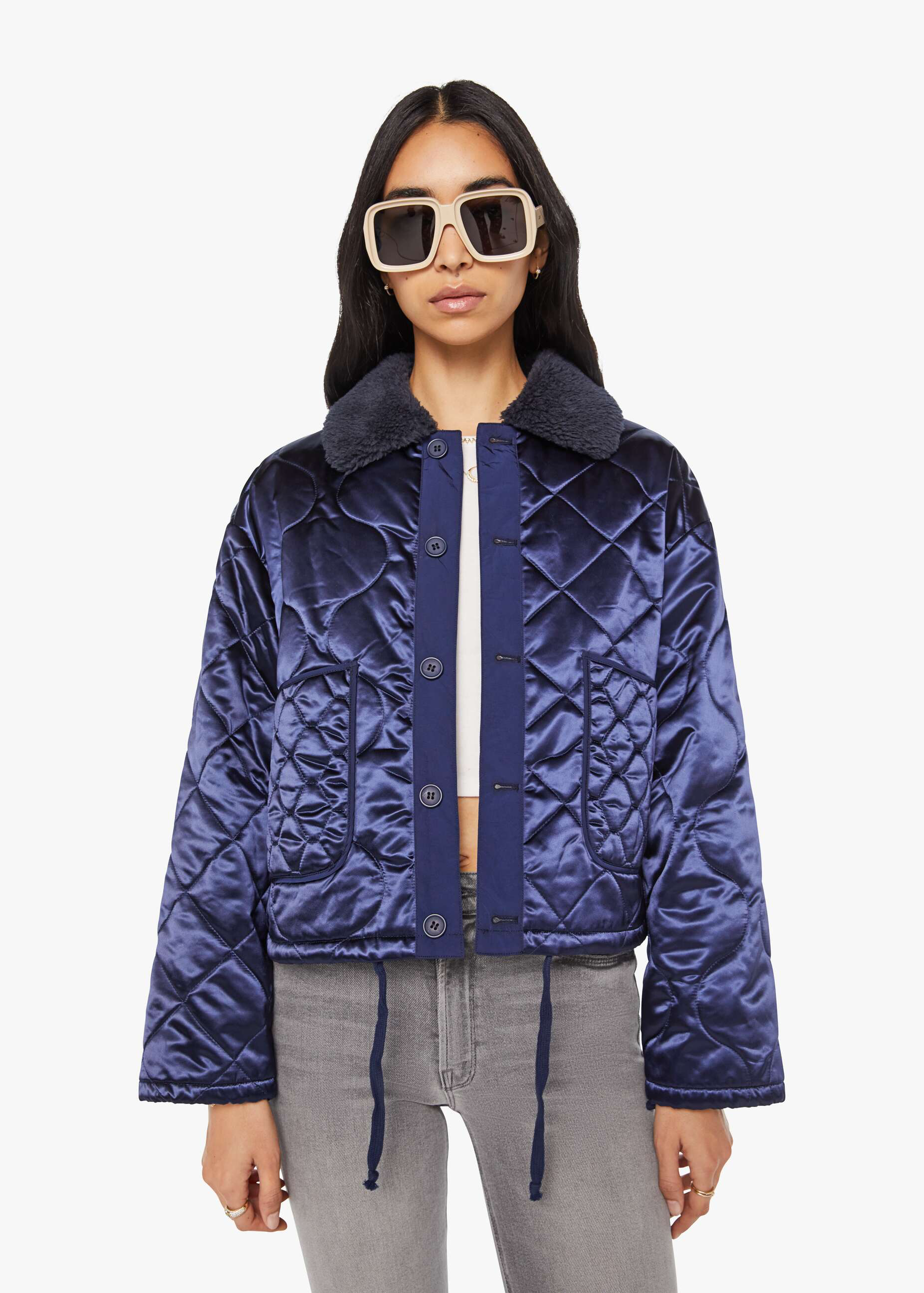 Home on the range. A quilted collared jacket with slightly dropped shoulders, buttons down the front, drawstring hems and a boxy fit. Made from quilted silky fabric in an iridescent dark blue, Cottage In The Country features a faux-sherpa collar and tonal buttons.
