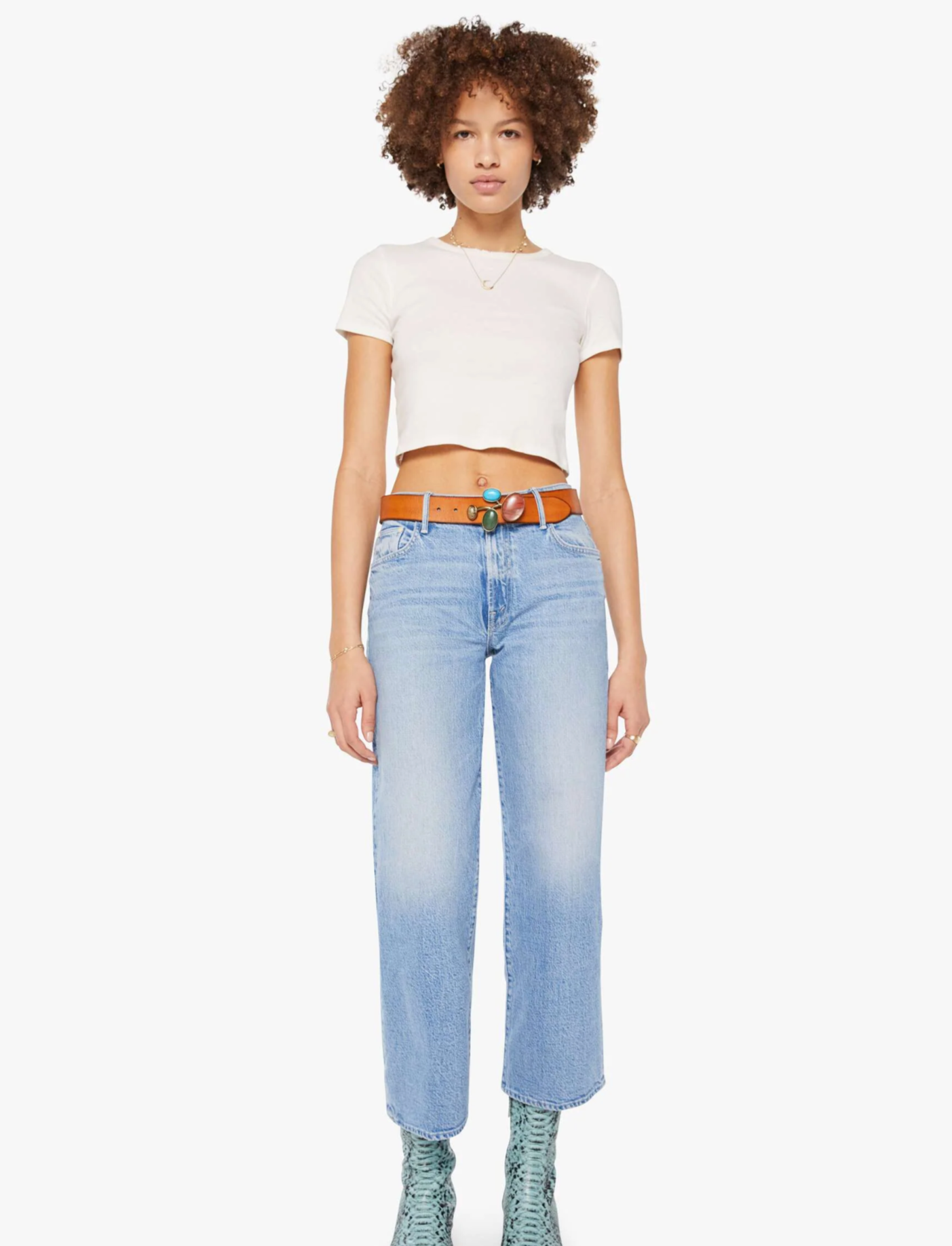 Buckle up. A wide, vintage-inspired leather belt with a chunky metal buckle detailed with turquoise, amber, green and pale yellow stones. The Jewelry Box is made from 100% cow leather in brown with subtle distressed details.