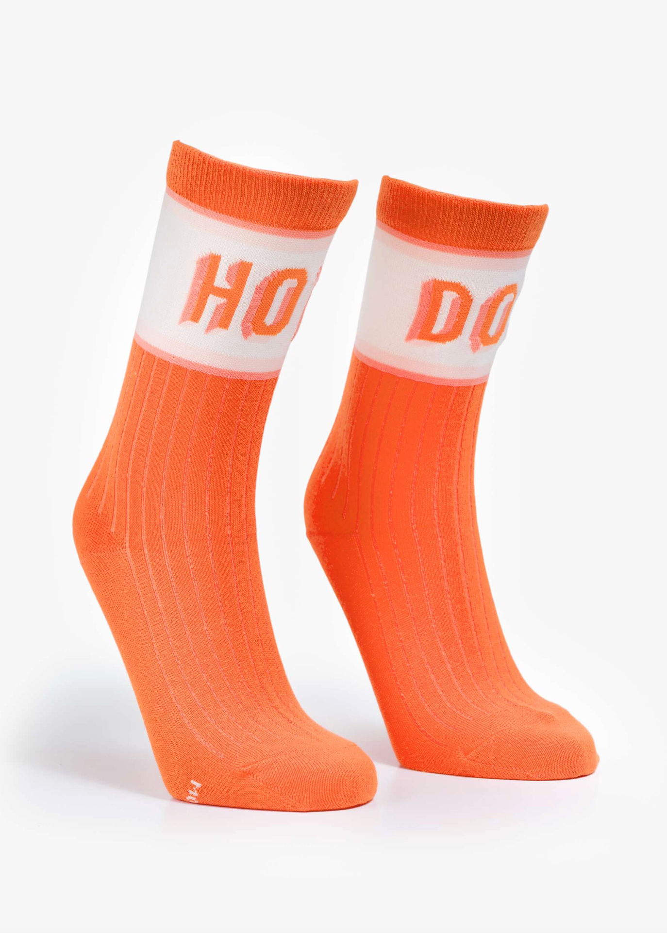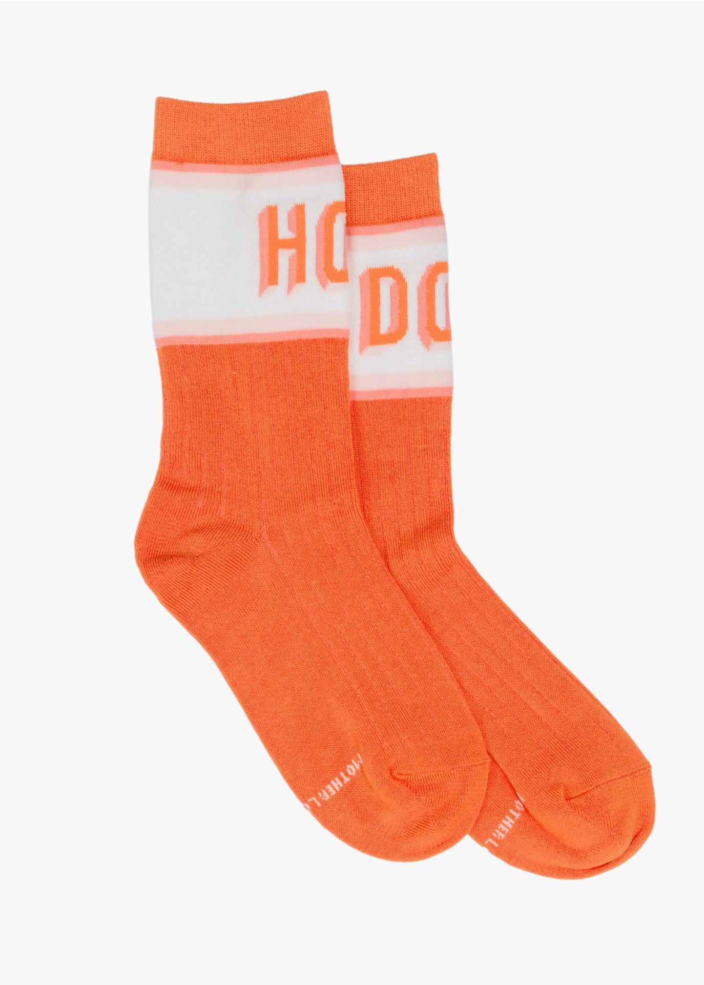 Playing ketchup. Tube socks with a message from MOTHER. Shown here in a bright orange-red with white and pink stripes and text across the top.