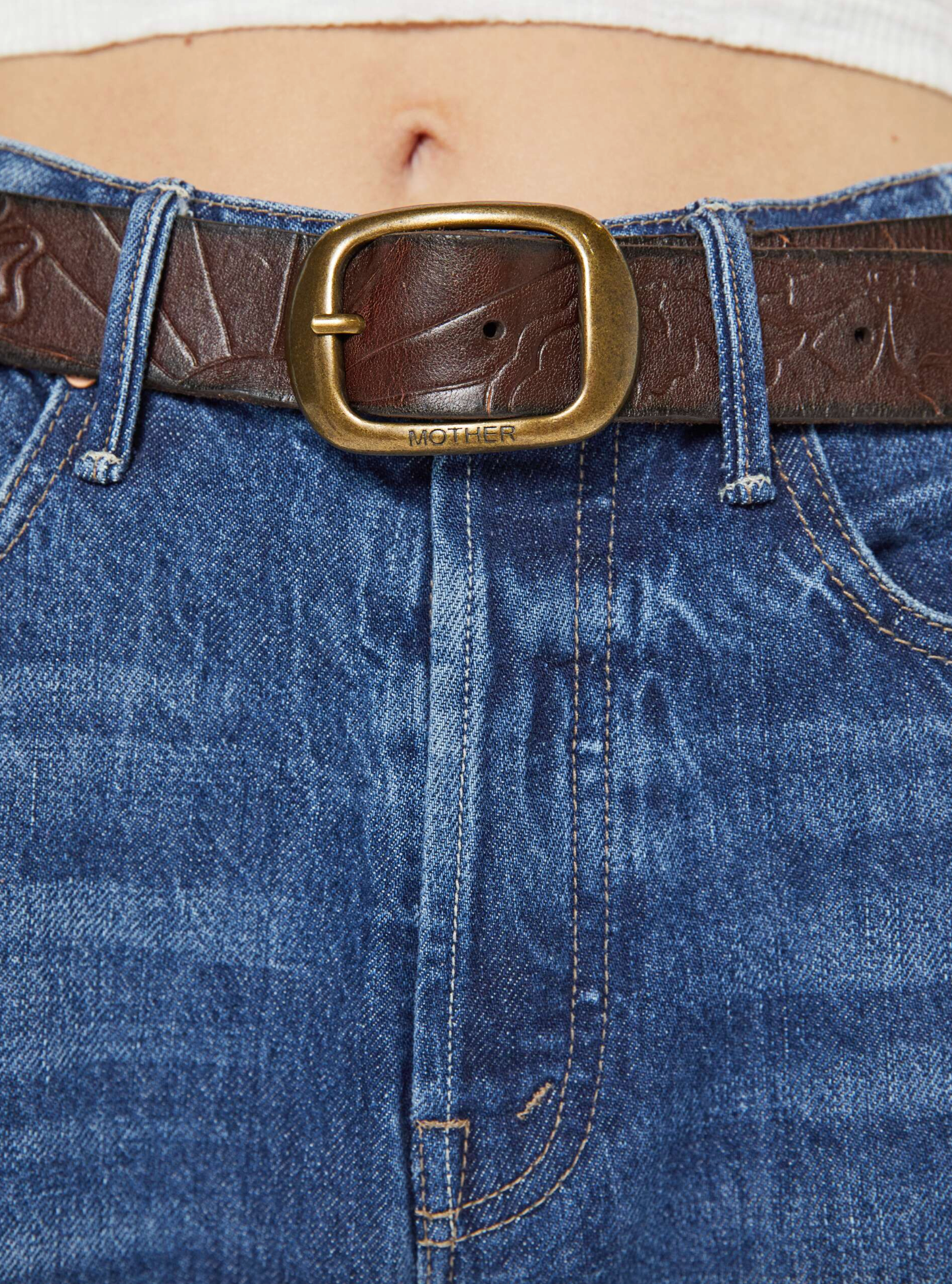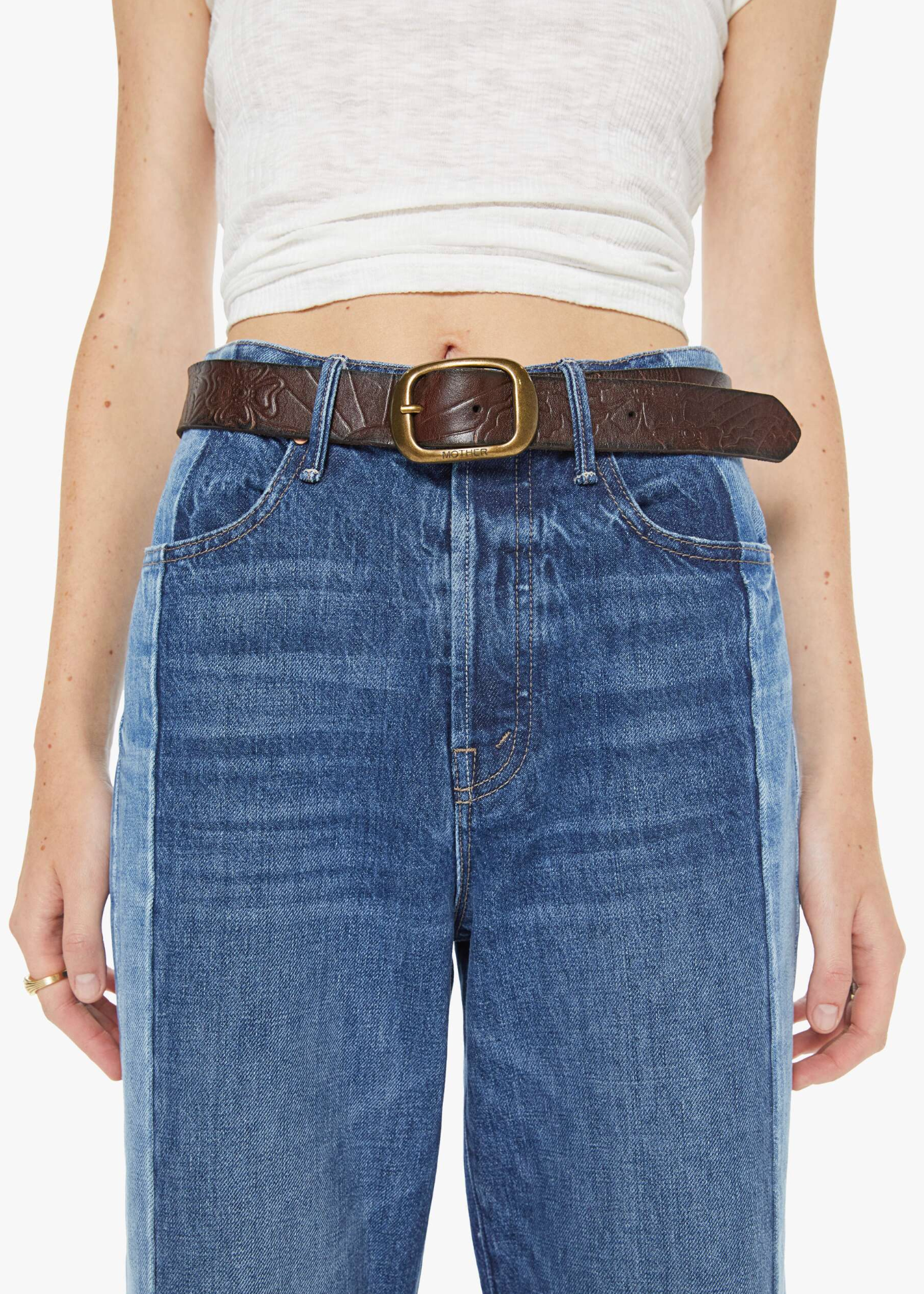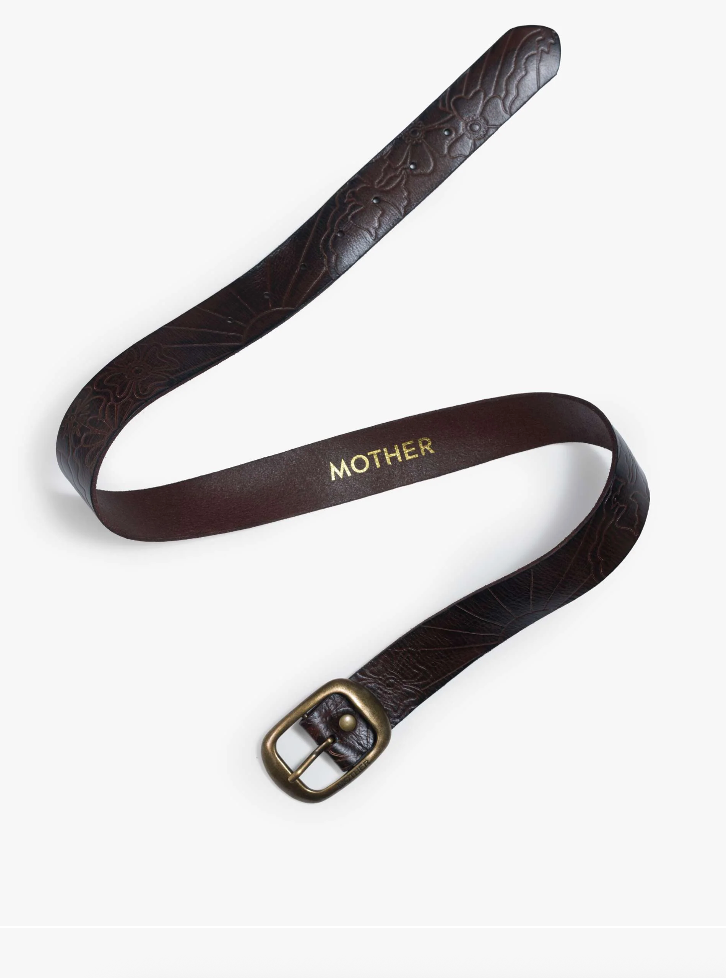 Buckle up. A leather belt with an oversized brass buckle. The Magpie is made from 100% cow leather in dark brown with embossed flowers and suns throughout.