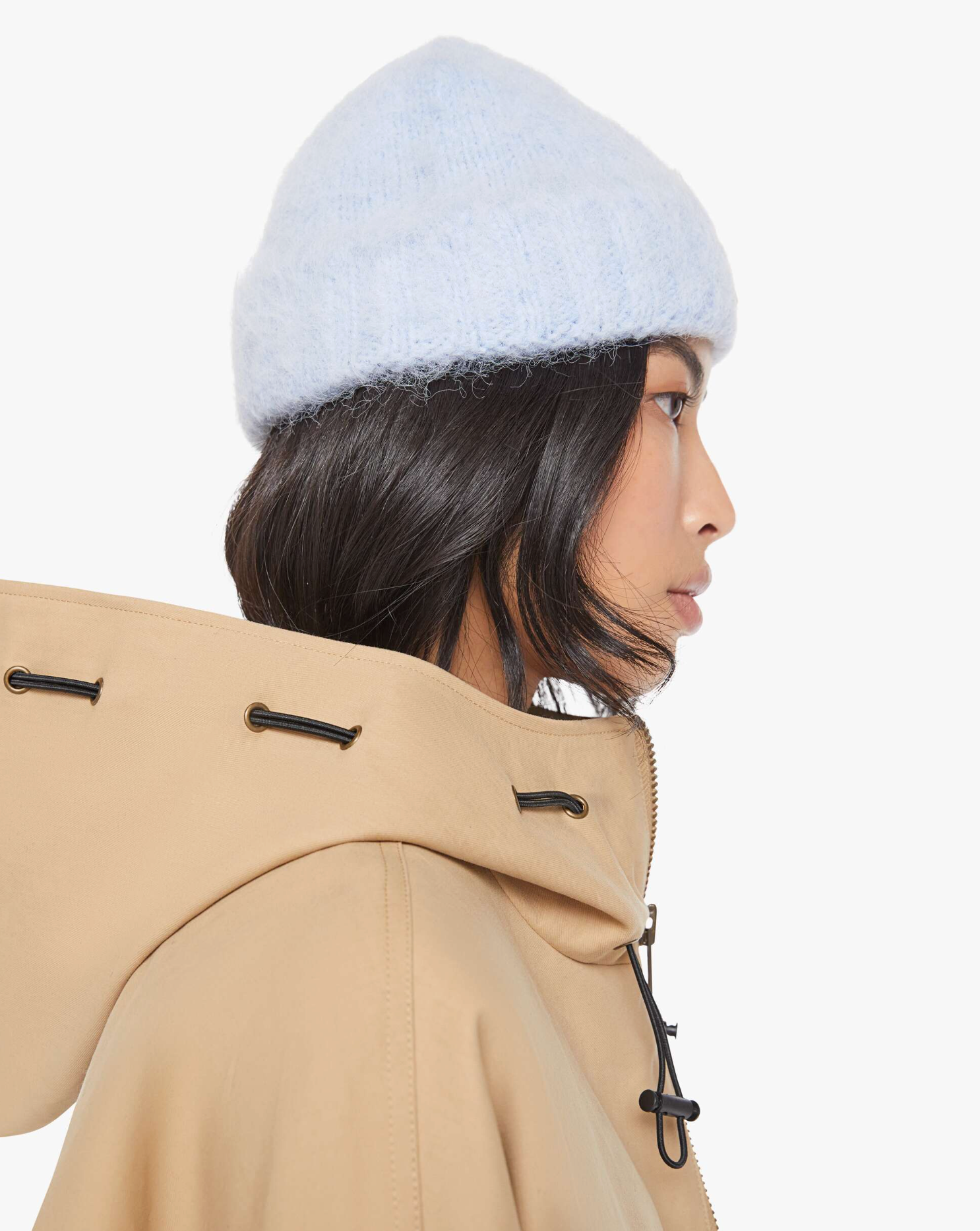 Fuzz off. A ribbed beanie with a folded hem and cozy fit. The beanie is designed in a fuzzy ice blue with an M patch on the front.