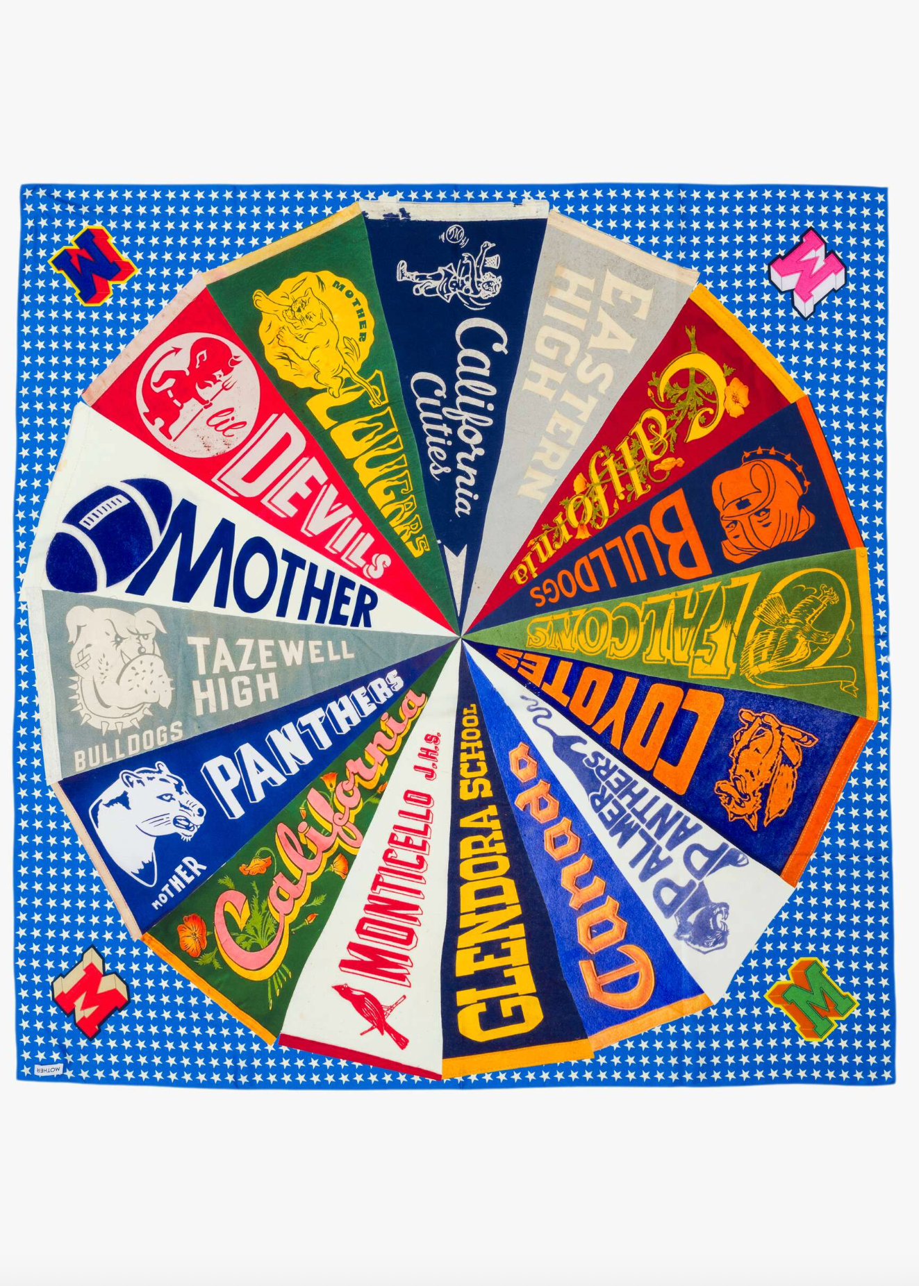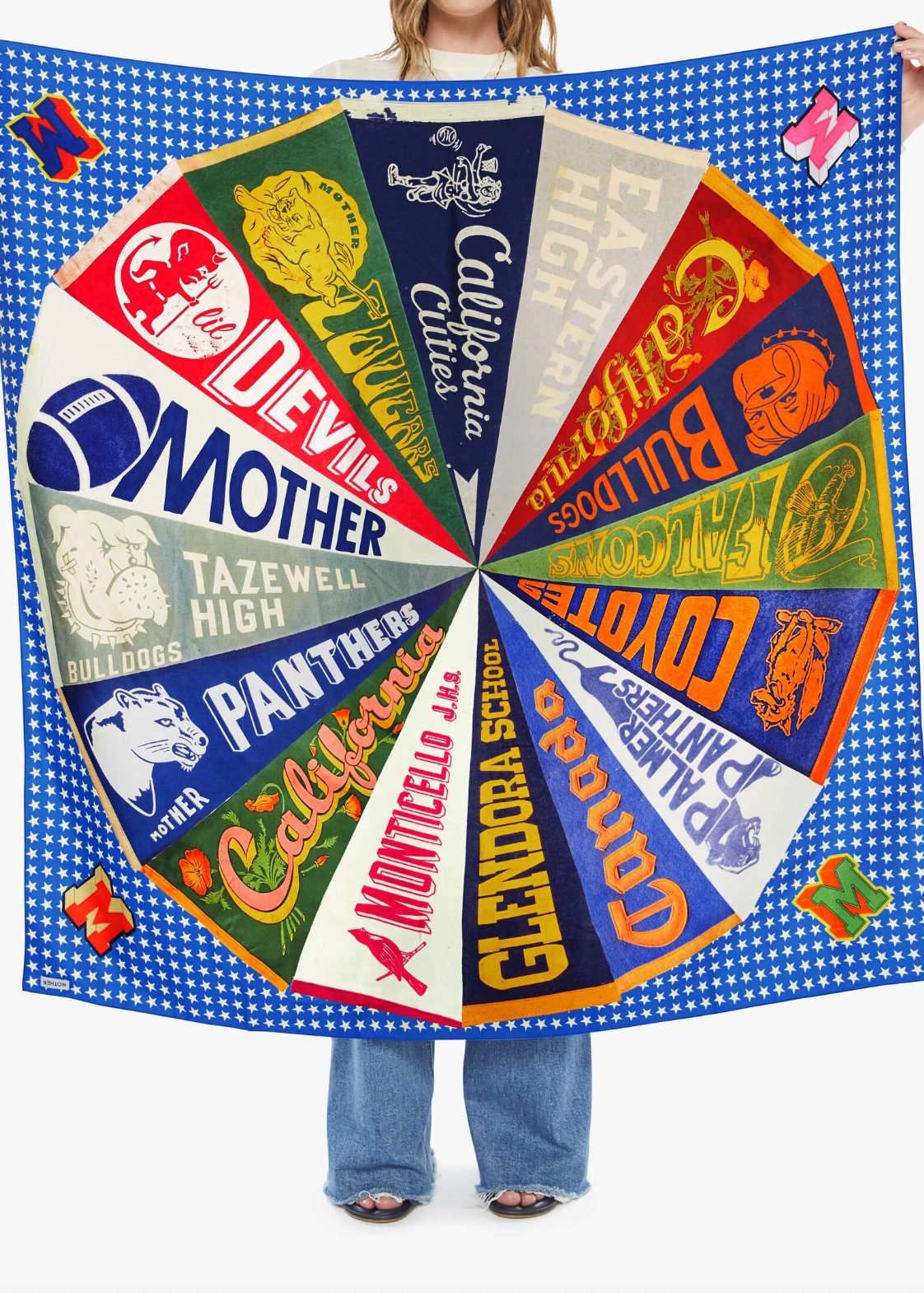 Scarf it up. An oversized 46" wide silk scarf designed in baby blue and white gingham with a pennant flag spiral.