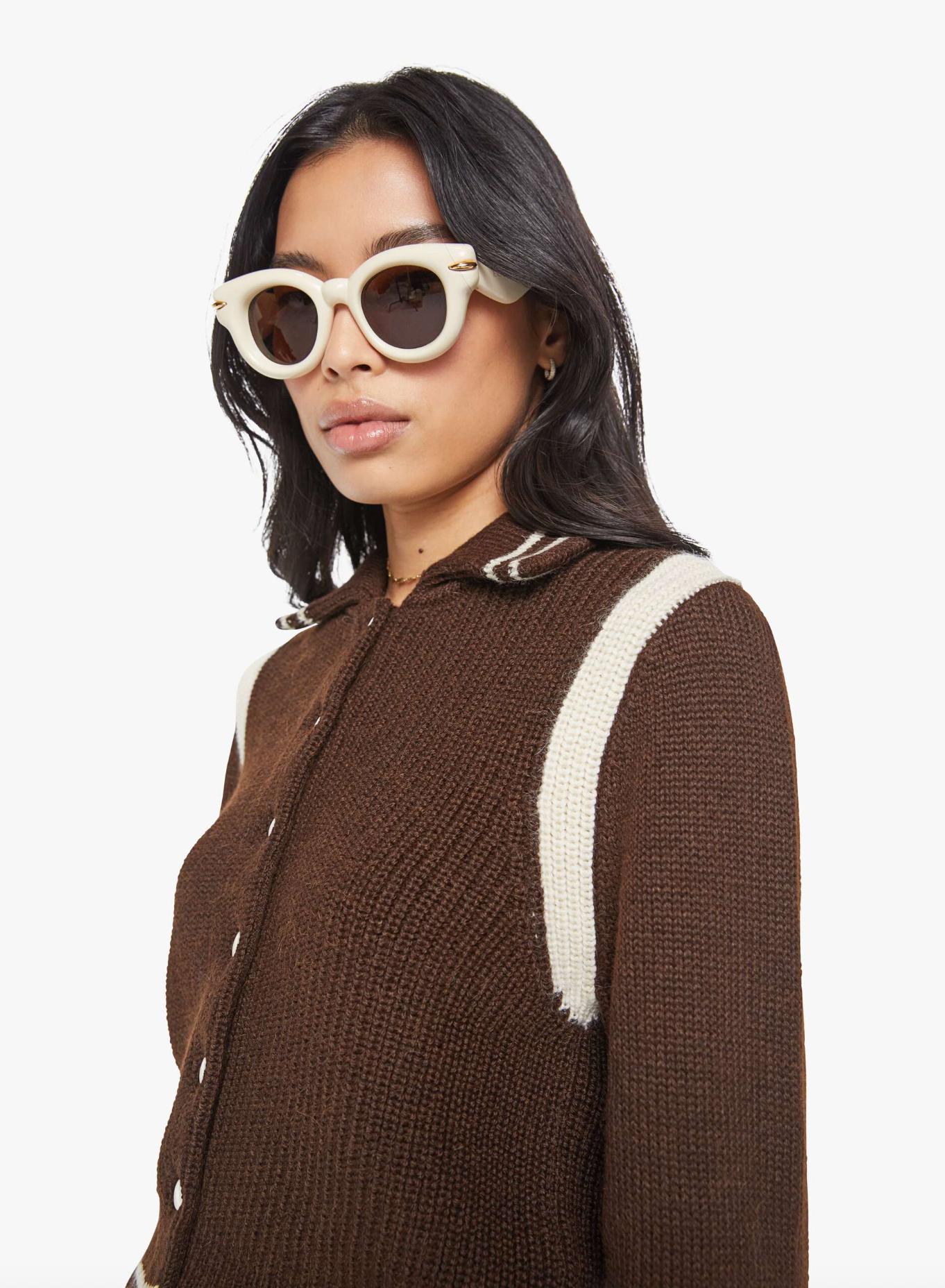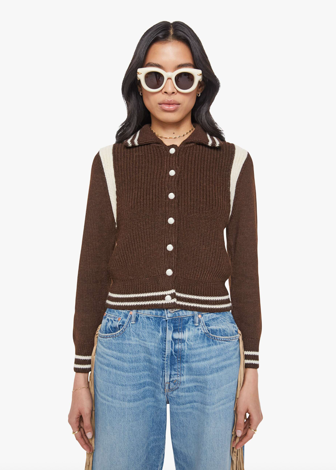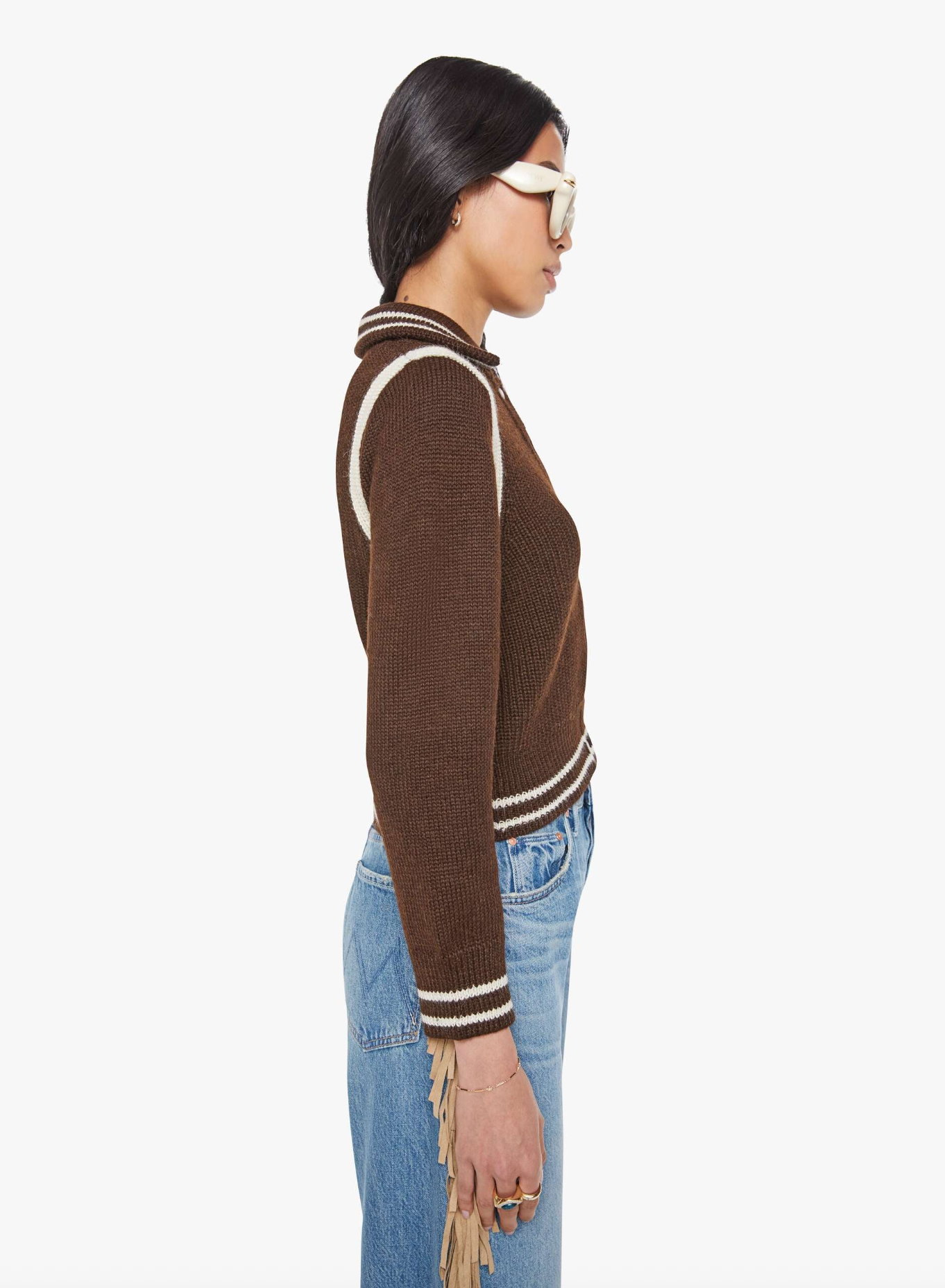 Batter up. A collared knit top with long sleeves, buttons down the front, ribbed hems and a slightly shrunken fit. Made from 100% baby alpaca, Little League is a chocolate brown with ivory buttons and striped details.