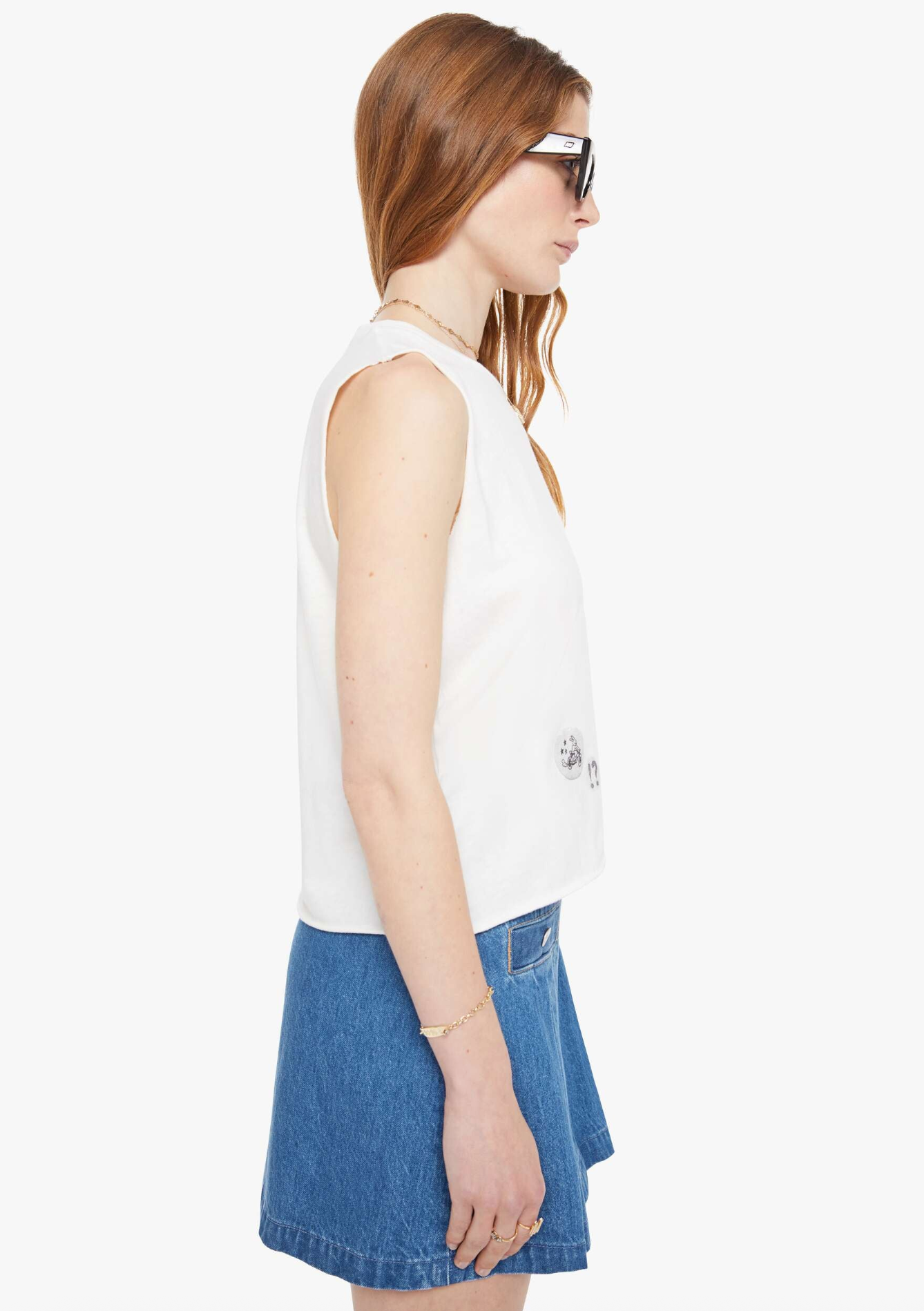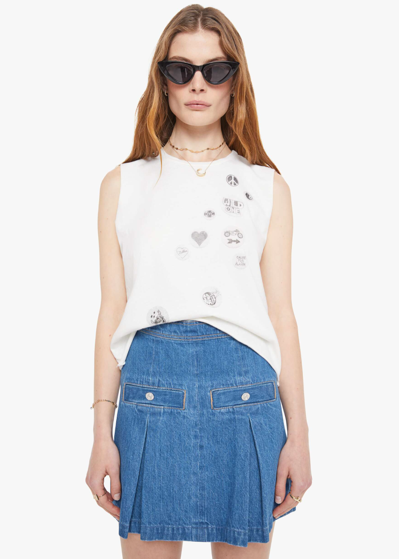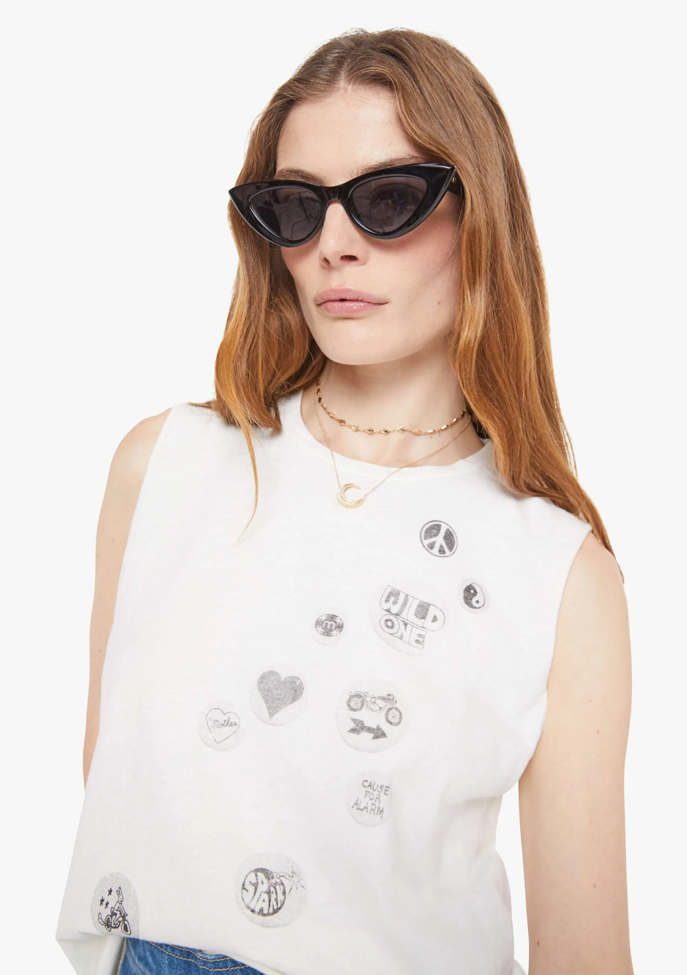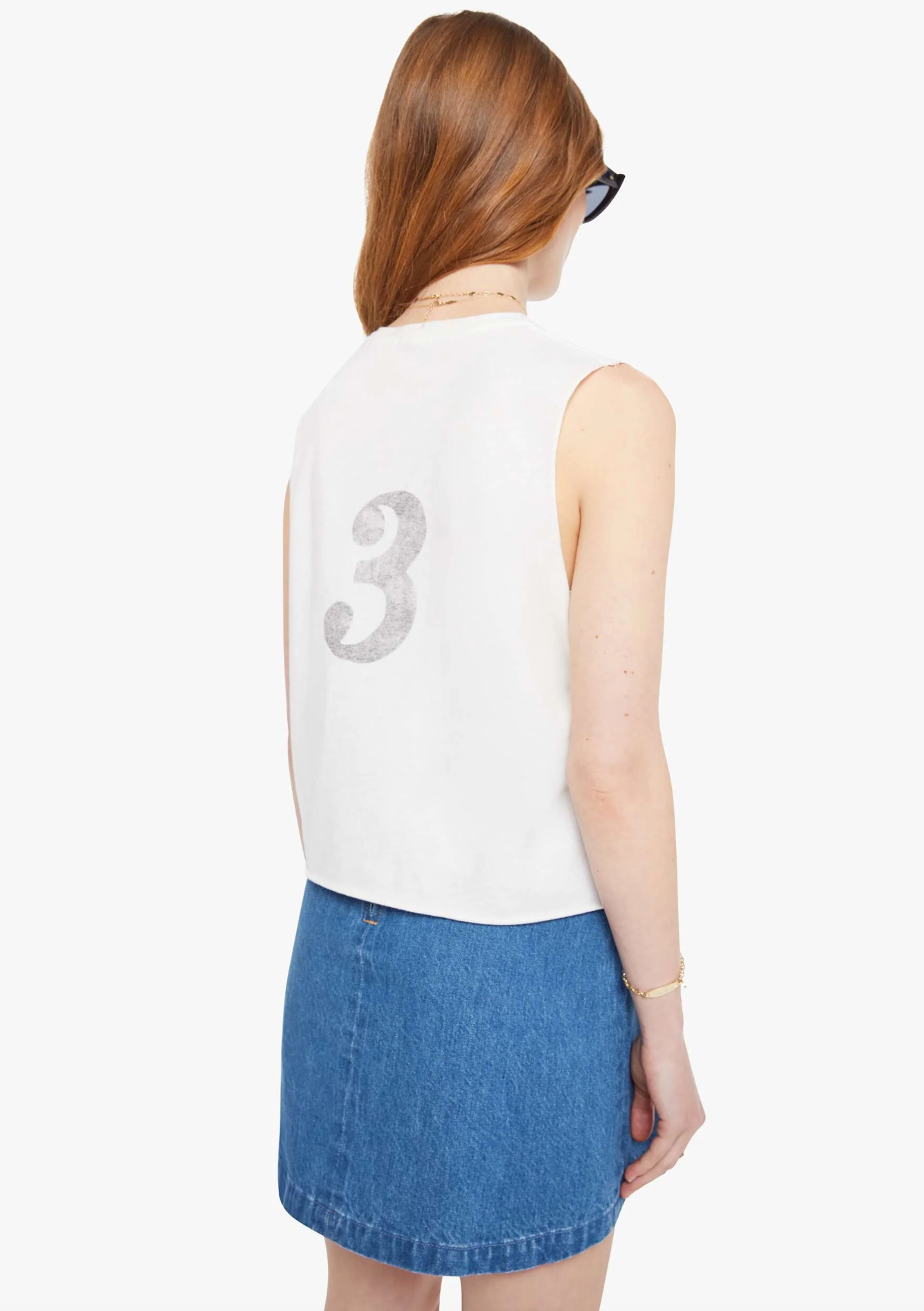 On point. A soft, slightly sheer crewneck with chopped sleeves and a slim fit for a vintage look and feel. Made from a blend of recycled cotton, the top is designed in white with black and white pin graphics across the chest and a faded 3 on the back.