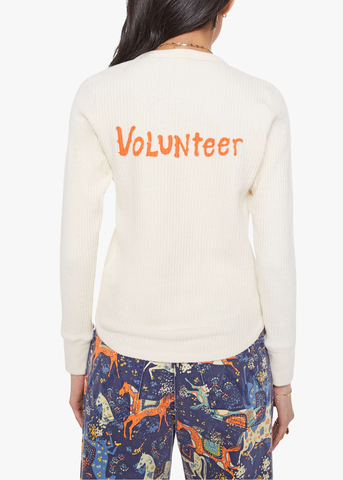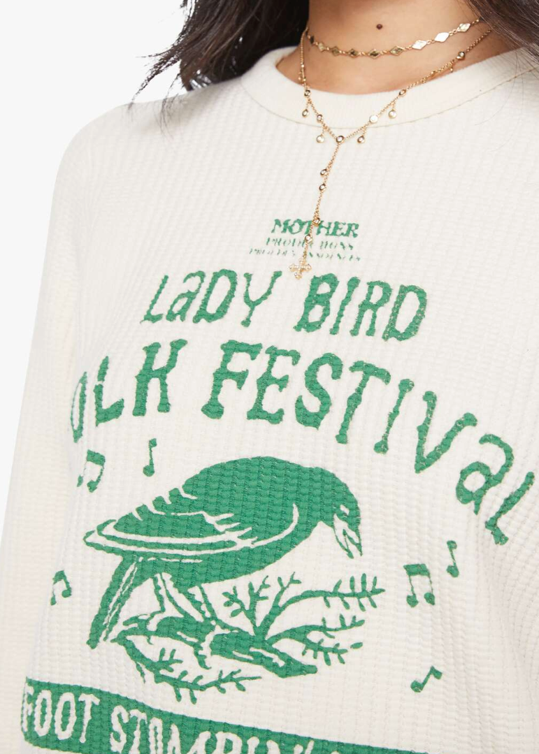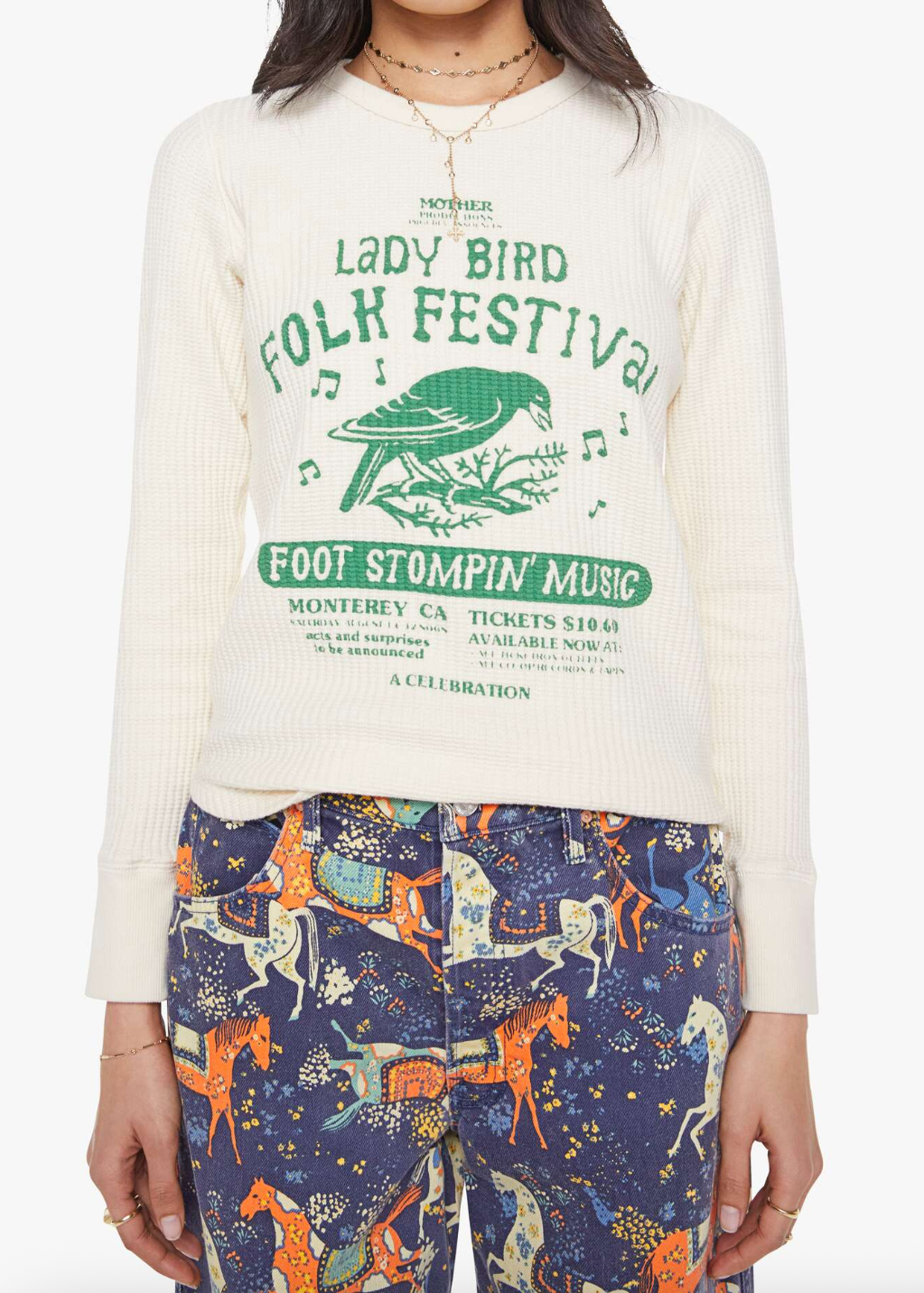Foot stompin' music. A slightly shrunken long-sleeve thermal with a crewneck and narrow fit. Made from stretch cotton, The Itty Bitty Goodie Goodie in Lady Bird Folk Fest is designed in off-white with a green music festival-inspired graphic on the front and text in orange on the back.