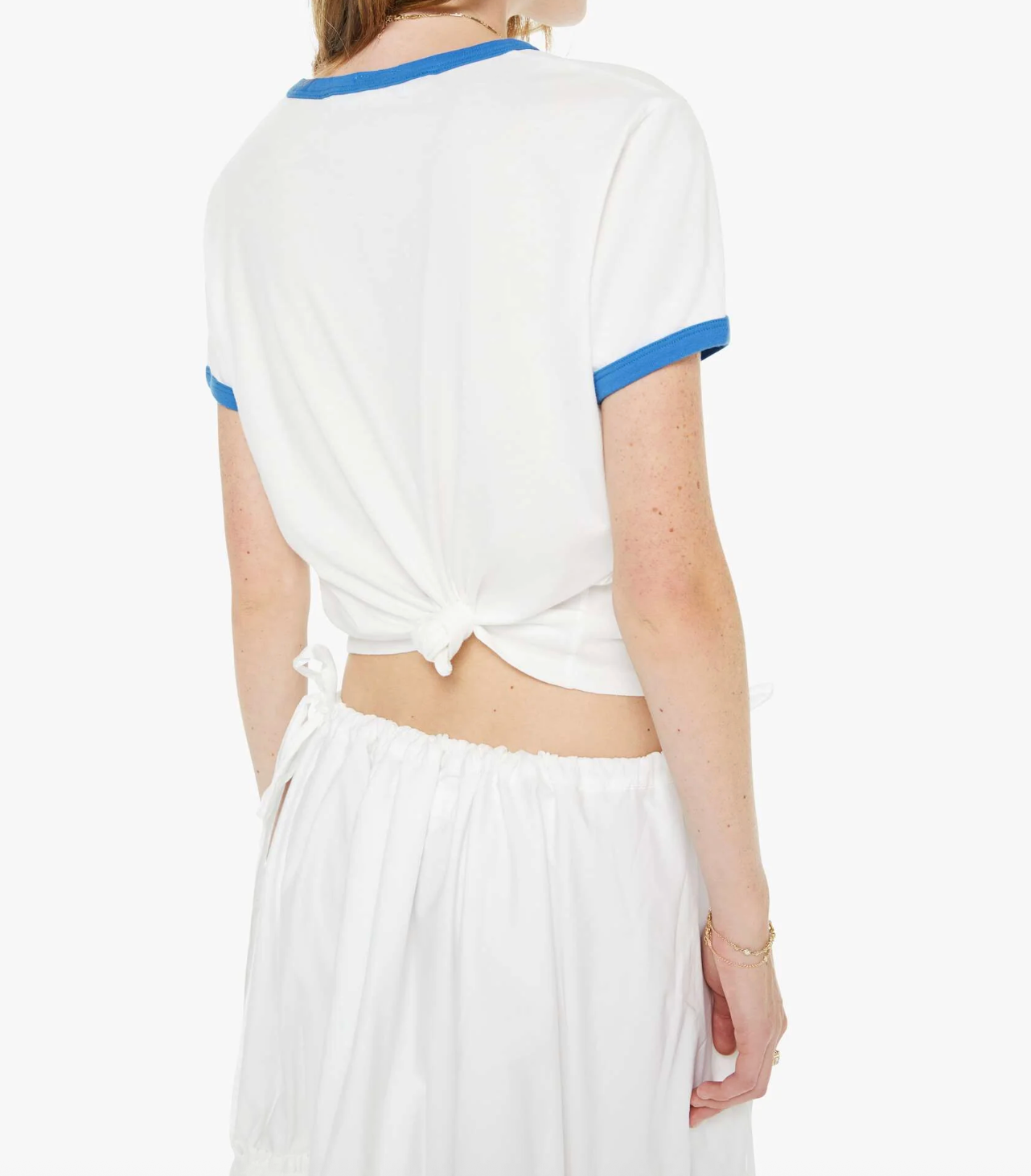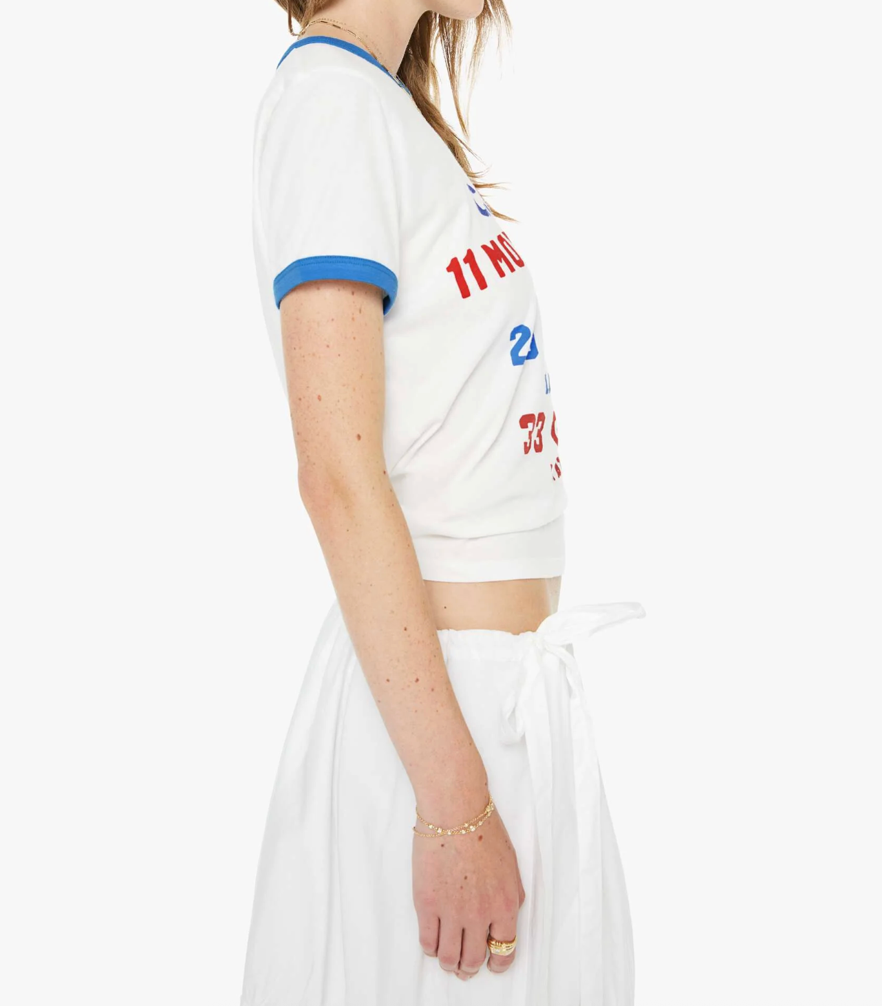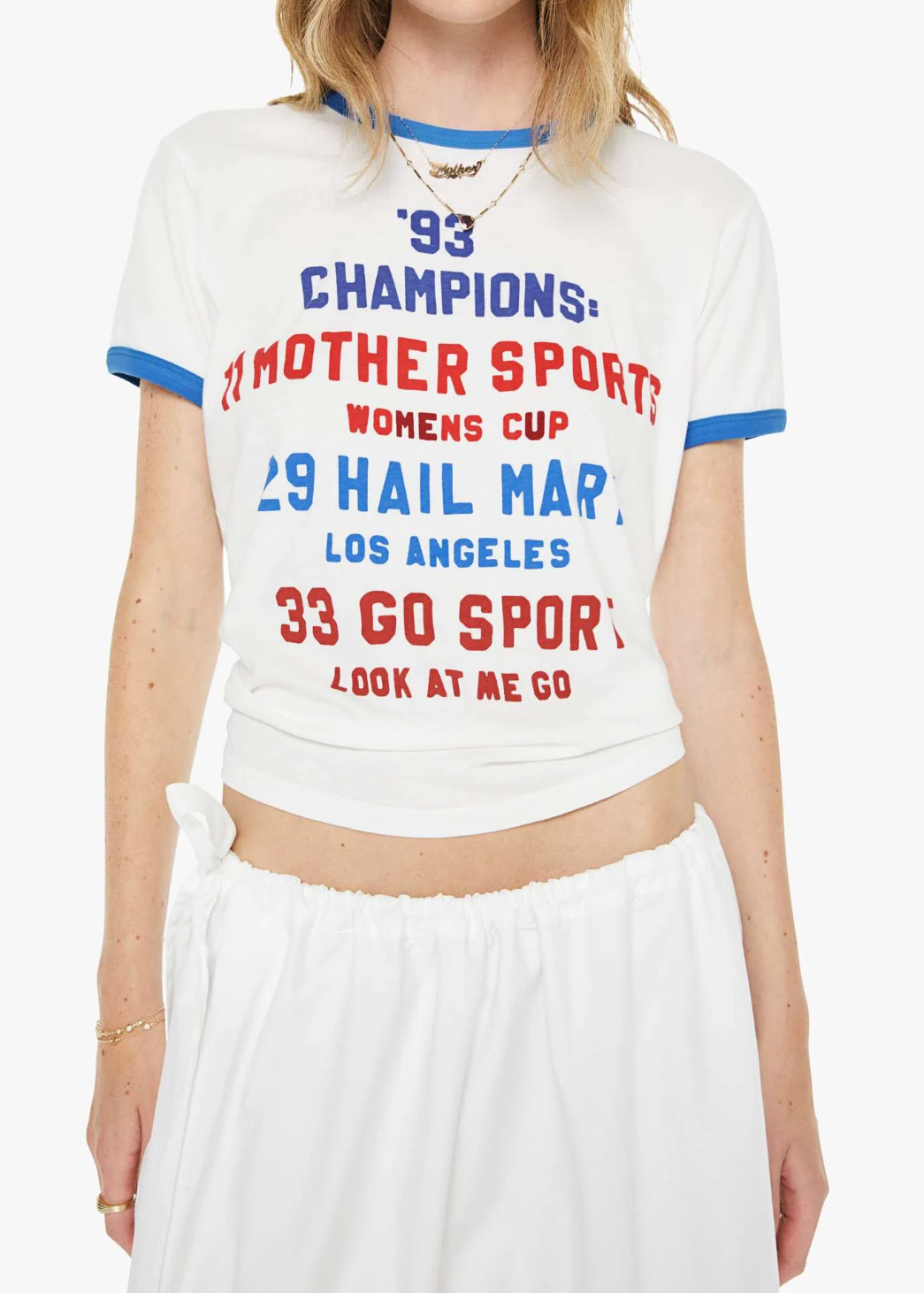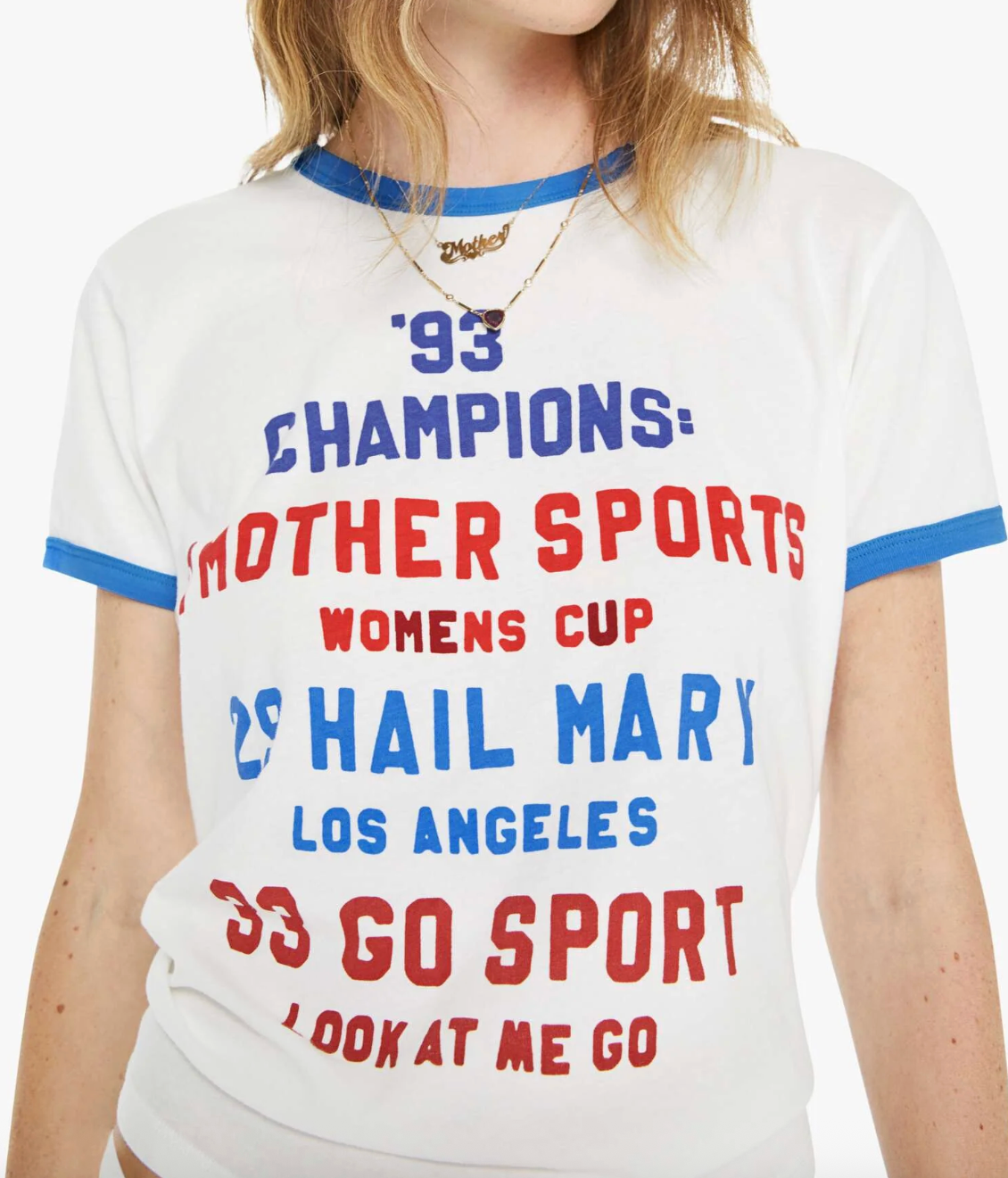 MVP. A crewneck tee with extra-short sleeves and a slightly shrunken fit. Made from 100% supima cotton, Champions is an off-white with light blue trim and a colorful text graphic inspired by a vintage scoreboard on the front.