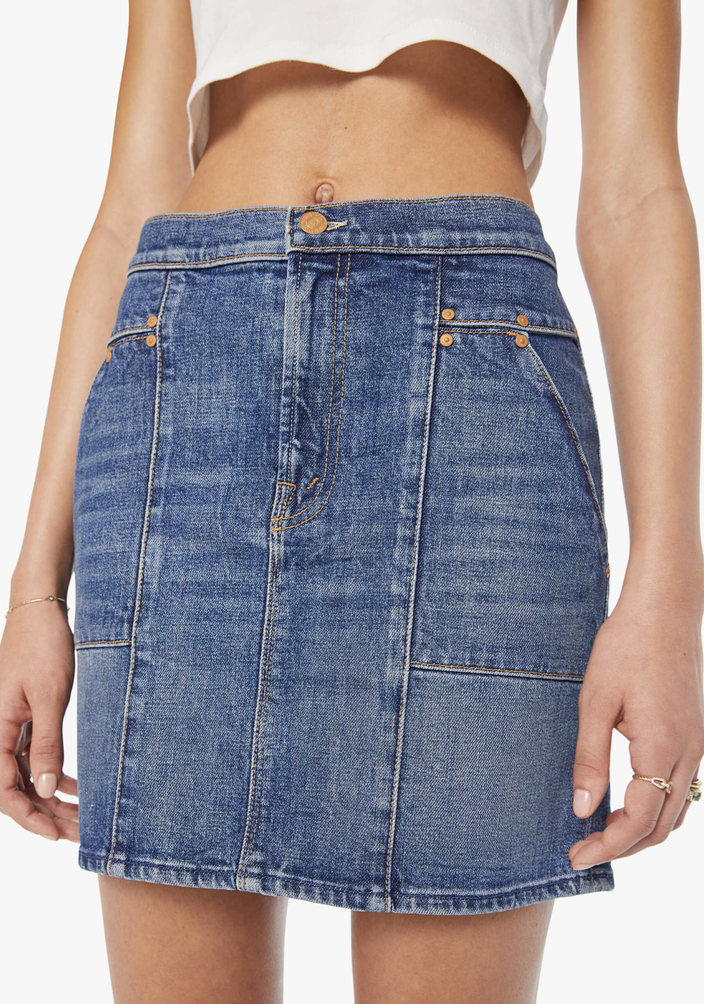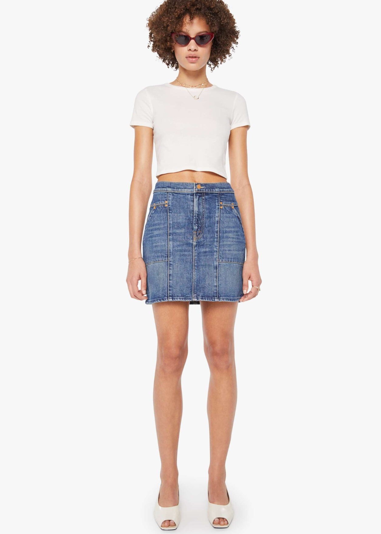 MOTHER makes the rules. A high-waisted denim skirt with a zip fly, patch pockets with rivet details, a seam down the front and thigh-length hem. Crafted from semi-rigid denim, Bending The Rules is a mid-blue with subtle fading throughout.