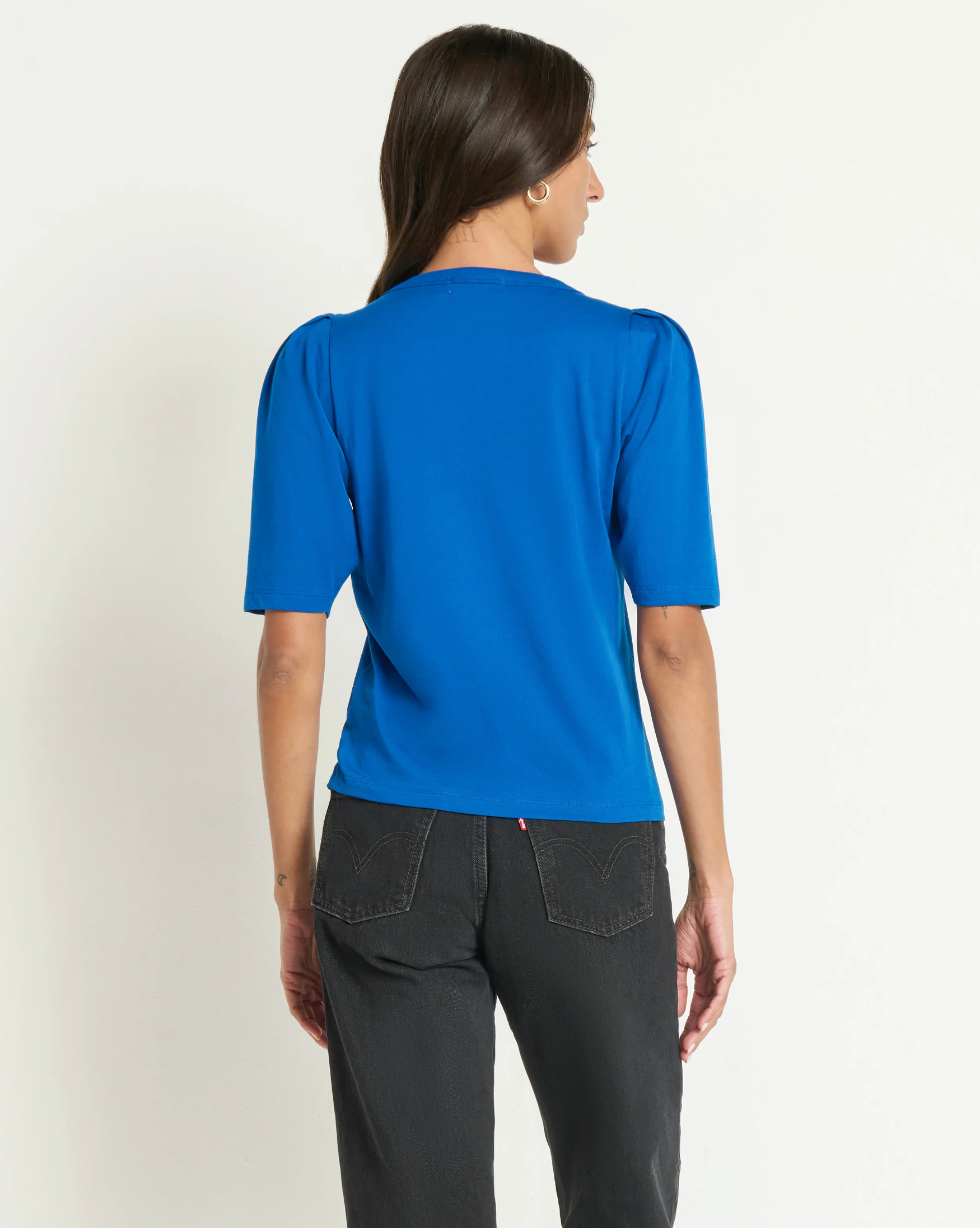 The Nahal Top is where low-impact organic Pima Cotton meets impactful style. This breathable basic has a statement shoulder, puff sleeves, and eye-catching snaps along the henley neckline. This one comes in Sapphire.