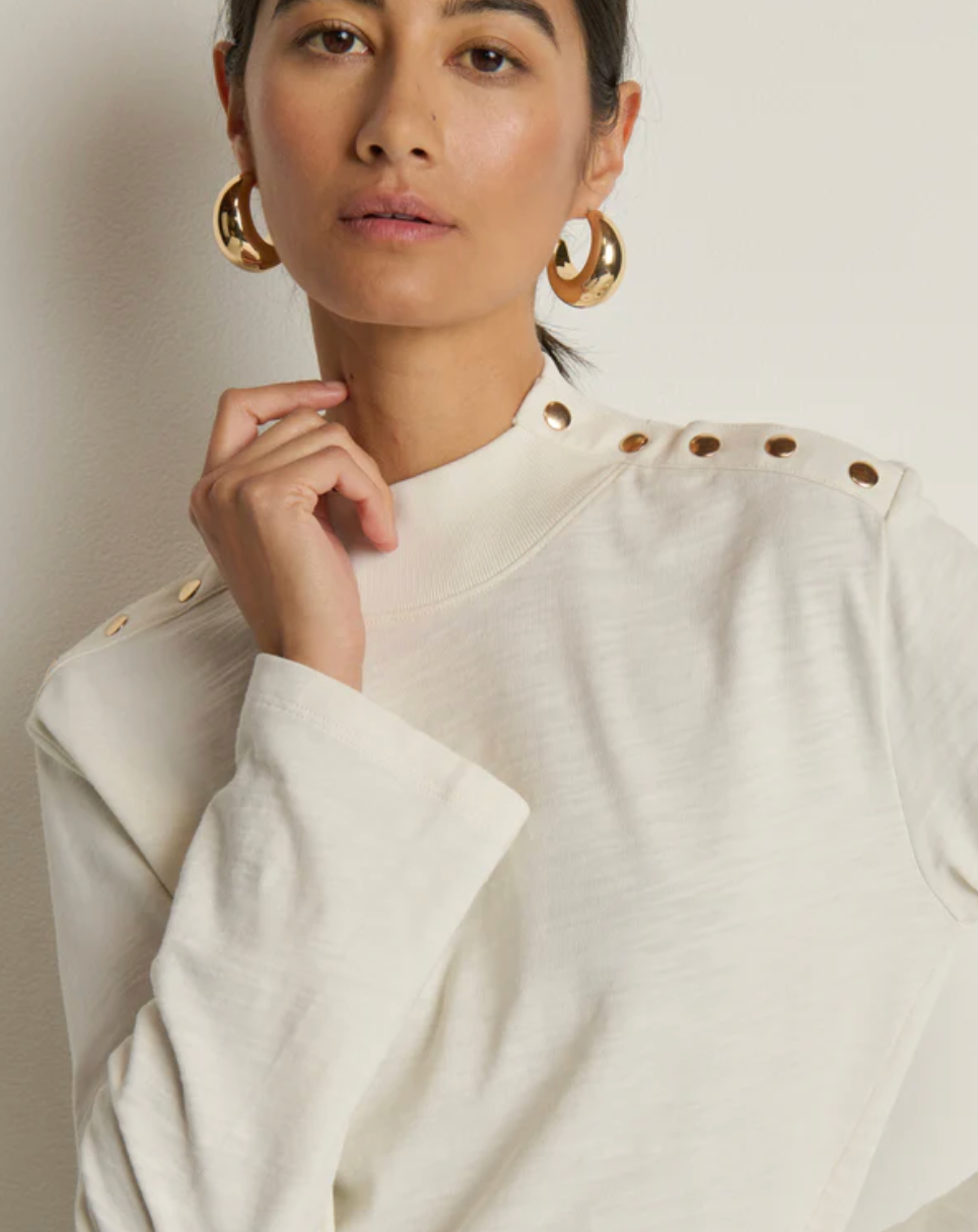 The Neda Long Sleeve balances form and function with ease—tailored from 100% cotton jersey in a boxy, cropped fit. A structured mock neck, soft bell sleeves, and gold hardware bring a touch of drama to an unfussy staple.